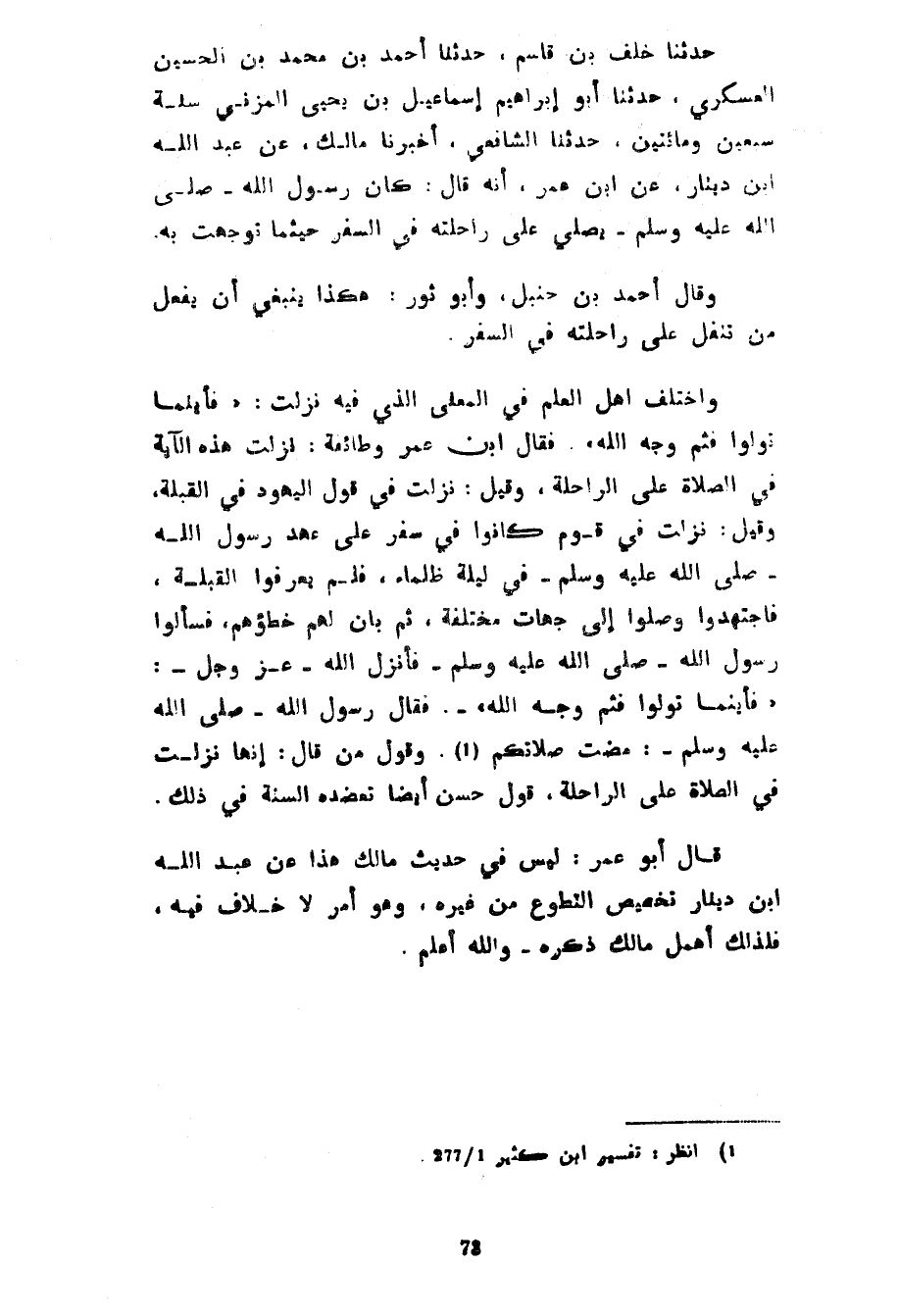 حَدَّثَنَا خَلَفُ بْنُ قَاسِمٍ حَدَّثَنَا أَحْمَدُ بْنُ مُحَمَّدِ بْنِ الْحُسَيْنِ الْعَسْكَرِيُّ حَدَّثَنَا أَبُو إِبْرَاهِيمَ إِسْمَاعِيلُ بْنُ يَحْيَى الْمُزَنِيُّ سَنَةَ سَبْعِينَ وَمِائَتَيْنِ حَدَّثَنَا الشَّافِعِيُّ أَخْبَرَنَا مَالِكٌ عَنْ عَبْدِ اللَّهِ بْنِ دِينَارٍ عَنِ ابْنِ عُمَرَ أَنَّهُ قَالَ كَانَ رَسُولُ اللَّهِ صَلَّى اللَّهُ عَلَيْهِ وَسَلَّمَ يُصَلِّي عَلَى رَاحِلَتِهِ فِي السَّفَرِ حَيْثُمَا تَوَجَّهَتْ بِهِ وَقَالَ أَحْمَدُ بْنُ حَنْبَلٍ وَأَبُو ثَوْرٍ هَكَذَا يَنْبَغِي أَنْ يَفْعَلَ مَنْ تَنَفَّلَ عَلَى رَاحِلَتِهِ فِي السَّفَرِ وَاخْتَلَفَ أَهْلُ الْعِلْمِ فِي الْمَعْنَى الَّذِي فِيهِ نَزَلَتْ فَأَيْنَمَا تُوَلُّوا فَثَمَّ وَجْهُ اللَّهِ فَقَالَ ابْنُ عُمَرَ وَطَائِفَةٌ نَزَلَتْ هَذِهِ الْآيَةُ فِي الصَّلَاةِ عَلَى الرَّاحِلَةِ وَقِيلَ نَزَلَتْ فِي قَوْلِ الْيَهُودِ فِي الْقِبْلَةِ وَقِيلَ نَزَلَتْ فِي قَوْمٍ كَانُوا فِي سَفَرٍ عَلَى عَهْدِ رَسُولِ اللَّهِ صَلَّى اللَّهُ عَلَيْهِ وسلم فِي لَيْلَةٍ ظَلْمَاءَ فَلَمْ يَعْرِفُوا الْقِبْلَةَ فَاجْتَهَدُوا وَصَلَّوْا إِلَى جِهَاتٍ مُخْتَلِفَةٍ ثُمَّ بَانَ لَهُمْ خَطَؤُهُمْ فَسَأَلُوا رَسُولَ اللَّهِ صَلَّى اللَّهُ عَلَيْهِ وَسَلَّمَ فَأَنْزَلَ اللَّهُ عَزَّ وَجَلَّ فَأَيْنَمَا تُوَلُّوا فَثَمَّ وَجْهُ اللَّهِ فَقَالَ رَسُولُ اللَّهِ صَلَّى اللَّهُ عَلَيْهِ وَسَلَّمَ مَضَتْ صَلَاتُكُمْ وَقَوْلُ مَنْ قَالَ إِنَّهَا نَزَلَتْ فِي الصَّلَاةِ عَلَى الرَّاحِلَةِ قَوْلٌ حَسَنٌ أَيْضًا تُعَضِّدُهُ السُّنَّةُ فِي ذَلِكَ قَالَ أَبُو عُمَرَ لَيْسَ فِي حَدِيثِ مَالِكٍ هَذَا عَنْ عَبْدِ اللَّهِ بْنِ دِينَارٍ تَخْصِيصُ التَّطَوُّعِ مِنْ غَيْرِهِ وَهُوَ أَمْرٌ لَا خِلَافَ فِيهِ فَلِذَلِكَ أَهْمَلَ مَالِكٌ ذِكْرَهُ وَاللَّهُ أَعْلَمُ