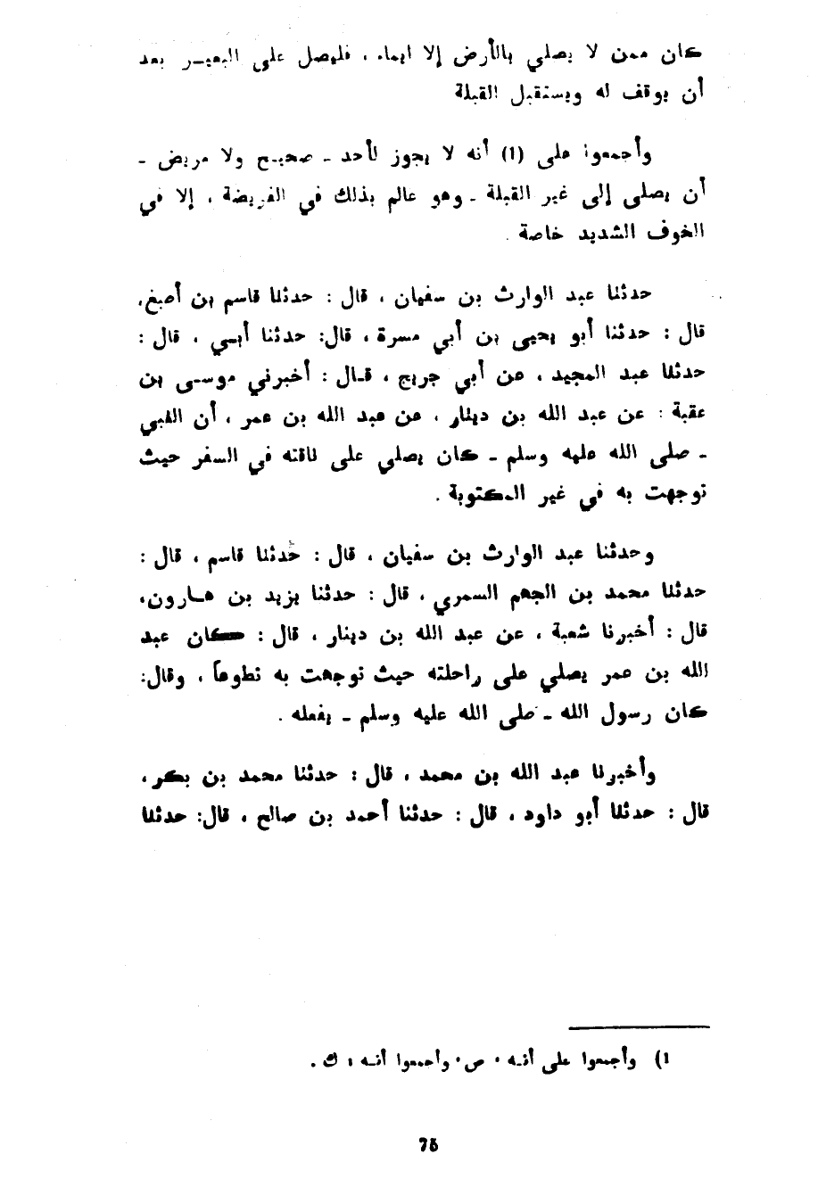 كَانَ مِمَّنْ لَا يُصَلِّي بِالْأَرْضِ إِلَّا إِيمَاءً فَلْيُصَلِّ عَلَى الْبَعِيرِ بَعْدَ أَنْ يُوقَفَ لَهُ وَيَسْتَقْبِلَ الْقِبْلَةَ وَأَجْمَعُوا عَلَى أَنَّهُ لَا يَجُوزُ لِأَحَدٍ صَحِيحٍ وَلَا مَرِيضٍ أَنْ يُصَلِّيَ إِلَى غَيْرِ الْقِبْلَةِ وَهُوَ عَالِمٌ بِذَلِكَ فِي الْفَرِيضَةِ إِلَّا فِي الْخَوْفِ الشَّدِيدِ خَاصَّةً حَدَّثَنَا عَبْدُ الْوَارِثِ بْنُ سُفْيَانَ قَالَ حَدَّثَنَا قَاسِمُ بْنُ أَصْبَغَ قَالَ حَدَّثَنَا أَبُو يَحْيَى بْنُ أَبِي مَسَرَّةَ قَالَ حَدَّثَنَا أَبِي قَالَ حَدَّثَنَا عَبْدُ الْمَجِيدِ عَنْ أَبِي جُرَيْجٍ قَالَ أَخْبَرَنِي مُوسَى بْنُ عُقْبَةَ عَنْ عَبْدِ اللَّهِ بْنِ دِينَارٍ عَنْ عَبْدِ اللَّهِ بْنِ عُمَرَ أَنَّ النَّبِيَّ صَلَّى اللَّهُ عَلَيْهِ وَسَلَّمَ كَانَ يُصَلِّي عَلَى نَاقَتِهِ فِي السَّفَرِ حَيْثُ تَوَجَّهَتْ بِهِ فِي غَيْرِ الْمَكْتُوبَةِ وَحَدَّثَنَا عَبْدُ الْوَارِثِ بْنُ سُفْيَانَ قَالَ حَدَّثَنَا قَاسِمٌ قَالَ حَدَّثَنَا مُحَمَّدُ بْنُ الْجَهْمِ السَّمُرِيُّ قَالَ حَدَّثَنَا يَزِيدُ بْنُ هَارُونَ قَالَ أَخْبَرَنَا شُعْبَةُ عَنْ عَبْدِ اللَّهِ بْنِ دِينَارٍ قَالَ كَانَ عَبْدُ اللَّهِ بْنُ عُمَرَ يُصَلِّي عَلَى رَاحِلَتِهِ حَيْثُ تَوَجَّهَتْ بِهِ تَطَوُّعًا وَقَالَ كَانَ رَسُولُ اللَّهِ صَلَّى اللَّهُ عَلَيْهِ وَسَلَّمَ يَفْعَلُهُ وَأَخْبَرَنَا عَبْدُ اللَّهِ بْنُ مُحَمَّدٍ قَالَ حَدَّثَنَا مُحَمَّدُ بْنُ بَكْرٍ قَالَ حَدَّثَنَا أَبُو دَاوُدَ قَالَ حَدَّثَنَا أَحْمَدُ بْنُ صَالِحٍ قَالَ حَدَّثَنَا