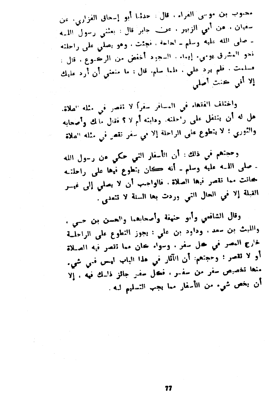 مَحْبُوبُ بْنُ مُوسَى الْفَرَّاءُ قَالَ حَدَّثَنَا أَبُو إِسْحَاقَ الْفَزَارِيُّ عَنْ سُفْيَانَ عَنْ أَبِي الزُّبَيْرِ عَنْ جَابِرٍ قَالَ بَعَثَنِي رَسُولُ اللَّهِ صَلَّى اللَّهُ عَلَيْهِ وَسَلَّمَ لِحَاجَةٍ فَجِئْتُ وَهُوَ يُصَلَّى عَلَى رَاحِلَتِهِ نَحْوَ الْمَشْرِقِ يُومِئُ إِيمَاءً السُّجُودُ أَخْفَضُ مِنَ الرُّكُوعِ قَالَ فَسَلَّمْتُ فَلَمْ يَرُدَّ عَلَيَّ فَلَمَّا سَلَّمَ قَالَ مَا مَنَعَنِي أَنْ أَرُدَّ عَلَيْكَ إِلَّا أَنِّي كُنْتُ أُصَلِّي وَاخْتَلَفَ الْفُقَهَاءُ فِي الْمُسَافِرِ سَفَرًا لَا تُقْصَرُ فِي مِثْلِهِ الصَّلَاةُ هَلْ لَهُ أَنْ يَتَنَفَّلَ عَلَى رَاحِلَتِهِ وَدَابَّتِهِ أَمْ لَا فَقَالَ مَالِكٌ وَأَصْحَابُهُ وَالثَّوْرِيُّ لَا يَتَطَوَّعُ عَلَى الرَّاحِلَةِ إِلَّا فِي سَفَرٍ تُقْصَرُ فِي مِثْلِهِ الصَّلَاةُ وَحُجَّتُهُمْ فِي ذَلِكَ أَنَّ الْأَسْفَارَ الَّتِي حُكِيَ عَنْ رَسُولِ اللَّهِ صَلَّى اللَّهُ عَلَيْهِ وَسَلَّمَ أَنَّهُ كَانَ يَتَطَوَّعُ فِيهَا عَلَى رَاحِلَتِهِ كَانَتْ مِمَّا تُقْصَرُ فِيهَا الصَّلَاةُ فَالْوَاجِبُ أَنْ لَا يُصَلِّيَ إِلَى غَيْرِ الْقِبْلَةِ إِلَّا فِي الْحَالِ الَّتِي وَرَدَتْ بِهَا السُّنَّةُ لَا تَتَعَدَّى وَقَالَ الشَّافِعِيُّ وَأَبُو حَنِيفَةَ وَأَصْحَابُهُمَا وَالْحَسَنُ بْنُ حَيٍّ وَاللَّيْثُ بْنُ سَعْدٍ وَدَاوُدُ بْنُ عَلِيٍّ يَجُوزُ التَّطَوُّعُ عَلَى الرَّاحِلَةِ خَارِجَ الْمِصْرِ فِي كُلِّ سَفَرٍ وَسَوَاءٌ كَانَ مِمَّا تُقْصَرُ فِيهِ الصَّلَاةُ أَوْ لَا تَقْصُرُ وَحُجَّتُهُمْ أَنَّ الْآثَارَ فِي هَذَا الْبَابِ لَيْسَ فِي شَيْءٍ مِنْهَا تَخْصِيصُ سَفَرٍ مِنْ سَفَرٍ فَكُلُّ سَفَرٍ جَائِزٌ ذَلِكَ فِيهِ إِلَّا أَنْ يُخَصَّ شَيْءٌ مِنَ الْأَسْفَارِ مِمَّا يَجِبُ التسليم له