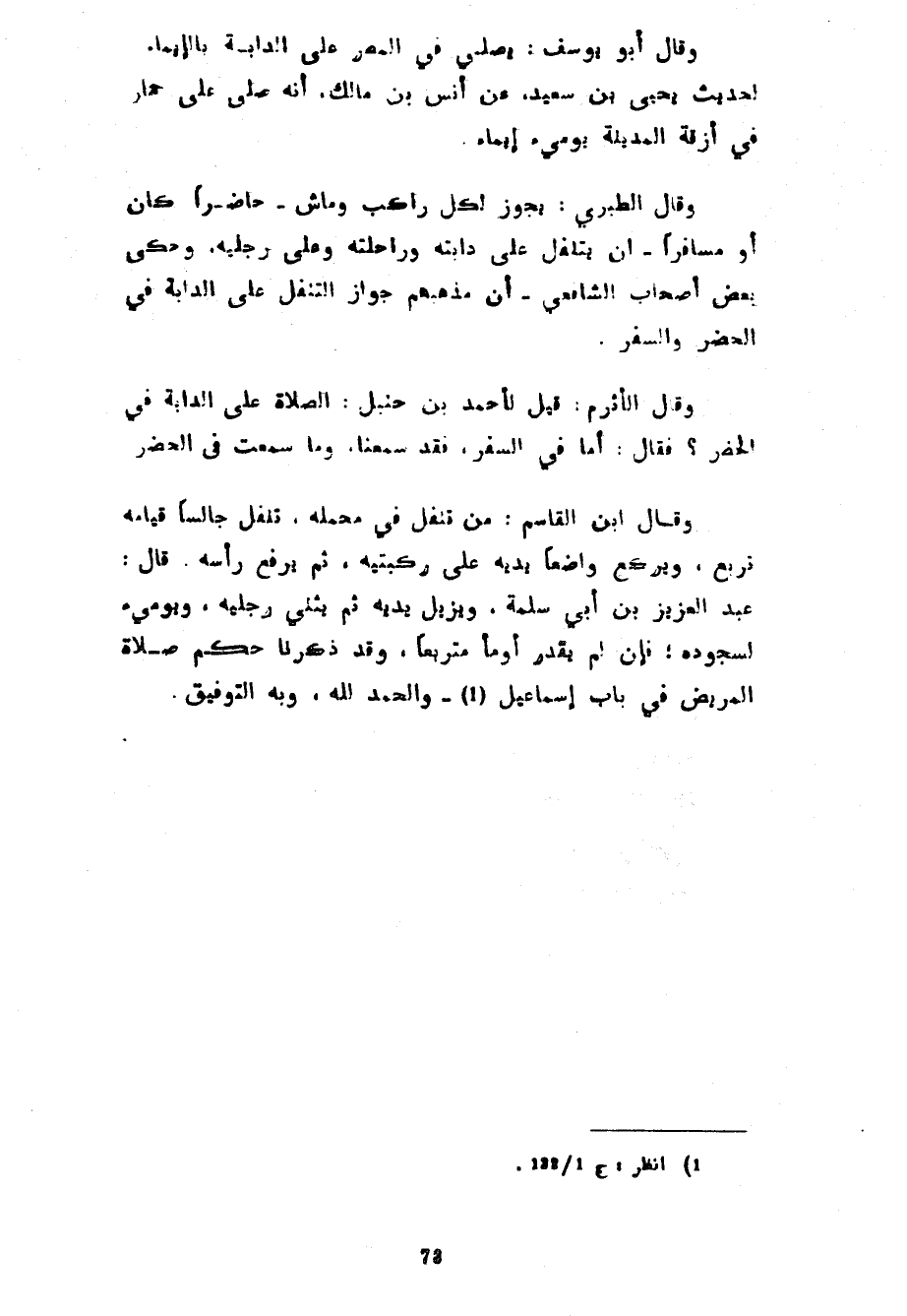 وَقَالَ أَبُو يُوسُفَ يُصَلِّي فِي الْمِصْرِ عَلَى الدَّابَّةِ بِالْإِيمَاءِ لِحَدِيثِ يَحْيَى بْنِ سَعِيدٍ عَنْ أَنَسِ بْنِ مَالِكٍ أَنَّهُ صَلَّى عَلَى حِمَارٍ فِي أَزِقَّةِ الْمَدِينَةِ يُومِئُ إِيمَاءً وَقَالَ الطَّبَرِيُّ يَجُوزُ لِكُلِّ رَاكِبٍ وَمَاشٍ حَاضِرًا كَانَ أَوْ مُسَافِرًا أَنْ يَتَنَفَّلَ عَلَى دَابَّتِهِ وَرَاحِلَتِهِ وَعَلَى رِجْلَيْهِ وَحَكَى بَعْضُ أَصْحَابِ الشَّافِعِيِّ أَنَّ مَذْهَبَهُمْ جَوَازُ التَّنَفُّلِ عَلَى الدَّابَّةِ فِي الْحَضَرِ وَالسَّفَرِ وَقَالَ الْأَثْرَمُ قِيلَ لِأَحْمَدَ بْنِ حَنْبَلٍ الصَّلَاةُ عَلَى الدَّابَّةِ فِي الْحَضَرِ فَقَالَ أَمَّا فِي السَّفَرِ فَقَدْ سَمِعْنَا وَمَا سَمِعْتُ فِي الْحَضَرِ وَقَالَ ابْنُ الْقَاسِمِ مَنْ تَنَفَّلَ فِي مَحْمِلِهِ تَنَفَّلَ جَالِسًا قِيَامُهُ تَرَبُّعٌ وَيَرْكَعُ وَاضِعًا يَدَيْهِ عَلَى رُكْبَتَيْهِ ثُمَّ يَرْفَعُ رَأْسَهُ قَالَ عَبْدُ الْعَزِيزِ بْنُ أَبِي سَلَمَةَ وَيُزِيلُ يَدَيْهِ ثُمَّ يَثْنِي رِجْلَيْهِ وَيُومِئُ لِسُجُودِهِ فَإِنْ لَمْ يَقْدِرْ أَوْمَأَ مُتَرَبِّعًا وَقَدْ ذَكَرْنَا حُكْمَ صَلَاةِ الْمَرِيضِ فِي بَابِ إِسْمَاعِيلَ وَالْحَمْدُ لِلَّهِ وَبِهِ التَّوْفِيقُ