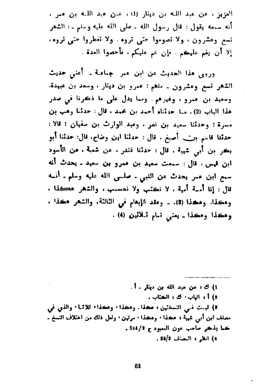 الْعَزِيزِ عَنْ عَبْدِ اللَّهِ بْنِ دِينَارٍ عَنْ عَبْدِ اللَّهِ بْنِ عُمَرَ أَنَّهُ سَمِعَهُ يَقُولُ قَالَ رَسُولُ اللَّهِ صَلَّى اللَّهُ عَلَيْهِ وَسَلَّمَ الشَّهْرُ تِسْعٌ وَعِشْرُونَ وَلَا تَصُومُوا حَتَّى تَرَوْهُ وَلَا تُفْطِرُوا حَتَّى تَرَوْهُ إِلَّا أَنْ يَغُمَّ عَلَيْكُمْ فَإِنَّ غُمَّ عَلَيْكُمْ فَأَحْصُوا الْعِدَّةَ وَرَوَى هَذَا الْحَدِيثَ عَنِ ابْنِ عُمَرَ جَمَاعَةٌ أَعْنِي حَدِيثَ الشَّهْرِ تِسْعٌ وَعِشْرُونَ مِنْهُمْ عَمْرُو بْنُ دِينَارٍ وَسَعْدُ بْنُ عُبَيْدَةَ وَسَعِيدُ بْنُ عَمْرٍو وَغَيْرُهُمْ وَمِمَّا يَدُلُّ عَلَى مَا ذَكَرْنَا فِي صَدْرِ هَذَا الْبَابِ مَا حَدَّثَنَاهُ أَحْمَدُ بْنُ مُحَمَّدٍ قَالَ حَدَّثَنَا وَهْبُ بْنُ مَسَرَّةَ وَحَدَّثَنَا سَعِيدُ بْنُ نَصْرٍ وَعَبْدُ الْوَارِثِ بْنُ سُفْيَانَ قَالَا حَدَّثَنَا قَاسِمُ بْنُ أَصْبَغَ قَالَ حَدَّثَنَا ابْنُ وَضَّاحٍ قَالَ حَدَّثَنَا أَبُو بَكْرِ بْنُ أَبِي شَيْبَةَ قَالَ حَدَّثَنَا غُنْدَرٌ عَنْ شُعْبَةَ عَنِ الْأَسْوَدِ بْنِ قَيْسٍ قَالَ سَمِعْتُ سَعِيدَ بْنَ عَمْرِو بْنِ سَعِيدٍ يُحَدِّثُ أَنَّهُ سَمِعَ ابْنَ عُمَرَ يُحَدِّثُ عَنِ النَّبِيِّ صَلَّى اللَّهُ عَلَيْهِ وَسَلَّمَ أَنَّهُ قَالَ إِنَّا أُمَّةٌ أُمِّيَّةٌ لَا نَكْتُبُ وَلَا نَحْسُبُ وَالشَّهْرُ هَكَذَا وَهَكَذَا وَهَكَذَا وَعِقْدَ الْإِبْهَامَ فِي الثَّالِثَةِ وَالشَّهْرُ هَكَذَا وَهَكَذَا وَهَكَذَا يَعْنِي تَمَامَ ثَلَاثِينَ