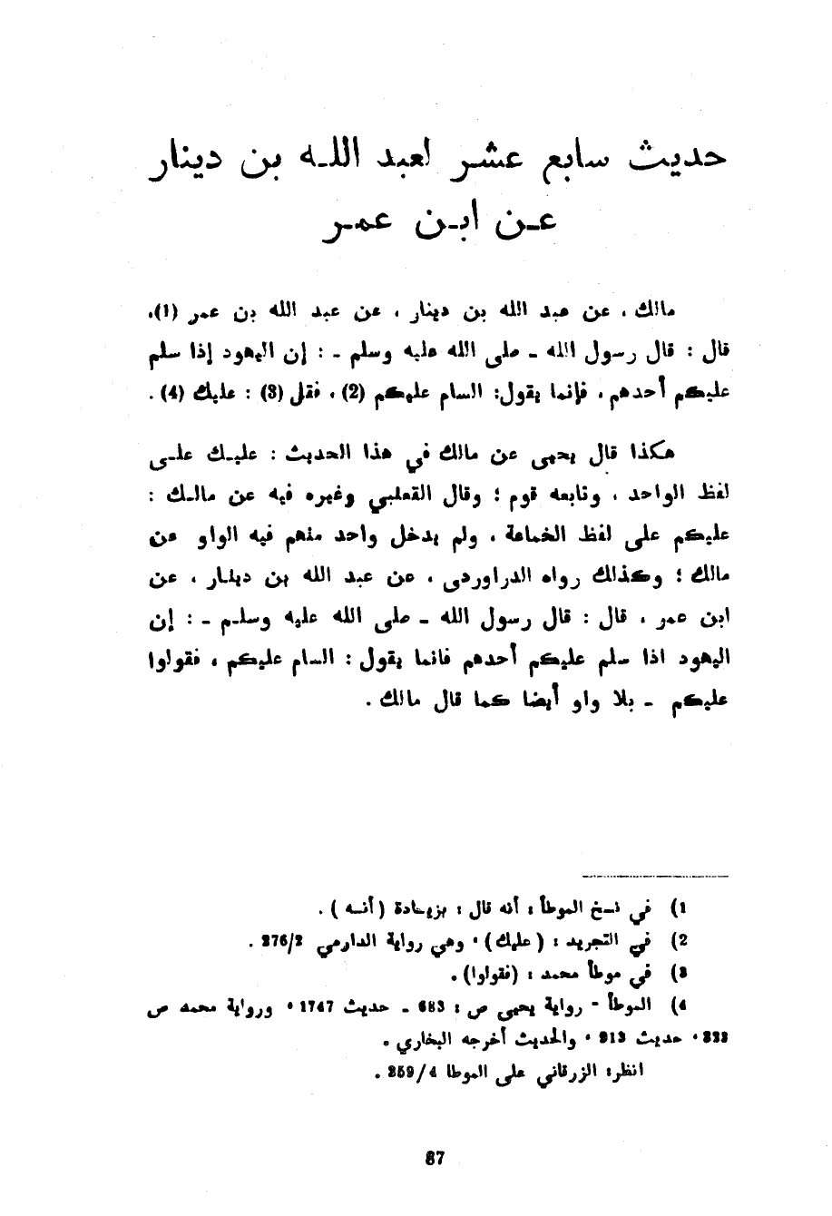 حَدِيثٌ سَابِعَ عَشَرَ لِعَبْدِ اللَّهِ بْنِ دِينَارٍ عَنِ ابْنِ عُمَرَ مَالِكٌ عَنْ عَبْدِ اللَّهِ بْنِ دِينَارٍ عَنْ عَبْدِ اللَّهِ بْنِ عُمَرَ قَالَ قَالَ رَسُولُ اللَّهِ صَلَّى اللَّهُ عَلَيْهِ وَسَلَّمَ إِنَّ الْيَهُودَ إِذَا سَلَّمَ عَلَيْكُمْ أَحَدُهُمْ فَإِنَّمَا يَقُولُ السَّامُ عَلَيْكُمْ فَقُلْ عَلَيْكَ هَكَذَا قَالَ يَحْيَى عَنْ مَالِكٍ فِي هَذَا الْحَدِيثِ عَلَيْكَ عَلَى لَفْظِ الْوَاحِدِ وَتَابَعَهُ قَوْمٌ وَقَالَ الْقَعْنَبِيُّ وَغَيْرُهُ فِيهِ عَنْ مَالِكٍ عَلَيْكُمْ عَلَى لَفْظِ الْجَمَاعَةِ وَلَمْ يُدْخِلْ وَاحِدٌ مِنْهُمْ فِيهِ الْوَاوَ عَنْ مَالِكٍ وَكَذَلِكَ رَوَاهُ الدَّرَاوَرْدِيُّ عَنْ عَبْدِ اللَّهِ بْنِ دِينَارٍ عَنِ ابْنِ عُمَرَ قَالَ قَالَ رَسُولُ اللَّهِ صَلَّى اللَّهُ عَلَيْهِ وَسَلَّمَ إِنَّ الْيَهُودَ إِذَا سَلَّمَ عَلَيْكُمْ أَحَدُهُمْ فَإِنَّمَا يَقُولُ السَّامُ عَلَيْكُمْ فَقُولُوا عَلَيْكُمْ بِلَا وَاوٍ أَيْضًا كَمَا قَالَ مَالِكٌ