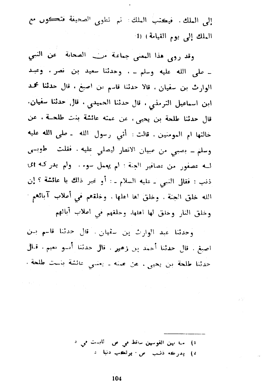 إِلَى الْمَلَكِ فَيَكْتُبُ الْمَلَكُ ثُمَّ تُطْوَى الصَّحِيفَةُ فَتَكُونُ مَعَ الْمَلَكِ إِلَى يَوْمِ الْقِيَامَةِ) وَقَدْ رَوَى هَذَا الْمَعْنَى جَمَاعَةٍ مِنَ الصَّحَابَةِ عَنِ النَّبِيِّ صَلَّى اللَّهُ عَلَيْهِ وَسَلَّمَ وَحَدَّثَنَا سَعِيدُ بْنُ نَصْرٍ وَعَبْدُ الْوَارِثِ بْنُ سُفْيَانَ قَالَا حَدَّثَنَا قَاسِمُ بْنُ أَصْبَغَ قَالَ حَدَّثَنَا مُحَمَّدُ بْنُ إِسْمَاعِيلَ التِّرْمِذِيُّ قَالَ حَدَّثَنَا الْحُمَيْدِيُّ قَالَ حَدَّثَنَا سُفْيَانُ قَالَ حَدَّثَنَا طَلْحَةَ بْنِ يَحْيَى عَنْ عَمَّتِهِ عَائِشَةَ بِنْتِ طَلْحَةَ عَنْ خَالَتِهَا أُمِّ الْمُؤْمِنِينَ قَالَتْ أُتِيَ رَسُولُ اللَّهِ صَلَّى اللَّهُ عَلَيْهِ وَسَلَّمَ بِصَبِيٍّ مِنْ صِبْيَانِ الْأَنْصَارِ لِيُصَلِّيَ عَلَيْهِ فَقُلْتُ طُوبَى لَهُ عُصْفُورٌ مِنْ عصافير الجنة لم يعمل بسوء وَلَمْ يُدْرِكْهُ ذَنْبٌ فَقَالَ النَّبِيُّ عَلَيْهِ السَّلَامُ أَوْ غَيْرَ ذَلِكَ يَا عَائِشَةُ إِنَّ اللَّهَ خَلَقَ الْجَنَّةَ وَخَلَقَ لَهَا أَهْلَهَا وَخَلَقَهُمْ فِي أصلاب آباهئم وَخَلَقَ النَّارَ وَخَلَقَ لَهَا أَهْلَهَا وَخَلَقَهُمْ فِي أَصْلَابِ آبَائِهِمْ وَحَدَّثَنَا عَبْدُ الْوَارِثِ بْنُ سُفْيَانَ قَالَ حَدَّثَنَا قَاسِمُ بْنُ أَصْبَغَ قَالَ حَدَّثَنَا أَحْمَدُ بْنُ زُهَيْرٍ قَالَ حَدَّثَنَا أَبُو نُعَيْمٍ قَالَ حَدَّثَنَا طَلْحَةُ بْنُ يَحْيَى عَنْ عَمَّتِهِ يَعْنِي عَائِشَةَ بِنْتَ طَلْحَةَ