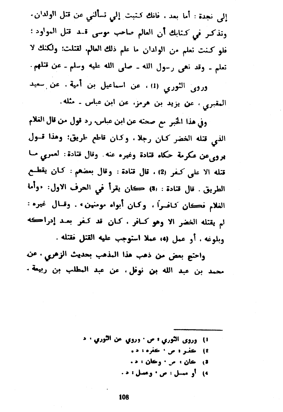 إِلَى نَجْدَةَ أَمَّا بَعْدُ فَإِنَّكَ كَتَبْتَ إِلَيَّ تَسْأَلُنِي عَنْ قَتْلِ الْوِلْدَانِ وَتَذْكُرُ فِي كِتَابِكَ أَنَّ الْعَالِمَ صَاحِبَ مُوسَى قَدْ قَتَلَ الْمَوْلُودَ فَلَوْ كُنْتَ تَعْلَمُ مِنَ الْوِلْدَانِ مَا عَلِمَ ذَلِكَ الْعَالِمُ لَقَتَلْتَ وَلَكِنَّكَ لَا تَعْلَمُ وَقَدْ نَهَى رَسُولُ اللَّهِ صَلَّى اللَّهُ عَلَيْهِ وَسَلَّمَ عَنْ قَتْلِهِمْ وَرَوَى الثَّوْرِيُّ عَنْ إِسْمَاعِيلَ بْنِ أُمَيَّةَ عَنْ سَعِيدٍ الْمَقْبُرِيِّ عَنْ يَزِيدَ بْنِ هُرْمُزٍ عَنِ ابْنِ عَبَّاسٍ مِثْلَهُ وَفِي هَذَا الْخَبَرِ مَعَ صِحَّتِهِ عَنِ ابْنِ عَبَّاسٍ رَدُّ قَوْلِ مَنْ قَالَ الْغُلَامُ الَّذِي قَتَلَهُ الْخَضِرُ كَانَ رَجُلًا وَكَانَ قَاطِعَ طَرِيقٍ وَهَذَا قَوْلٌ يُرْوَى عَنْ عِكْرِمَةَ حَكَاهُ قَتَادَةُ وَغَيْرُهُ عَنْهُ وَقَالَ قَتَادَةُ لَعَمْرِي مَا قَتَلَهُ إِلَّا عَلَى كُفْرٍ قَالَ قَتَادَةُ وَقَالَ بَعْضُهُمْ كَانَ يَقْطَعُ الطَّرِيقَ قَالَ قَتَادَةُ كَانَ يَقْرَأُ فِي الْحَرْفِ الْأَوَّلِ وَأَمَّا الْغُلَامُ فَكَانَ كَافِرًا وَكَانَ أَبَوَاهُ مُؤْمِنَيْنِ وَقَالَ غَيْرُهُ لَمْ يَقْتُلْهُ الْخَضِرُ إِلَّا وَهُوَ كَافِرٌ كَانَ قَدْ كَفَرَ بَعْدَ إِدْرَاكِهِ وَبُلُوغِهِ أَوْ عَمِلَ عَمَلًا اسْتَوْجَبَ عَلَيْهِ الْقَتْلَ فَقَتَلَهُ وَاحْتَجَّ بَعْضُ مَنْ ذَهَبَ هَذَا الْمَذْهَبَ بِحَدِيثِ الزُّهْرِيِّ عَنْ مُحَمَّدِ بْنِ عَبْدِ اللَّهِ بْنِ نَوْفَلٍ عَنْ عَبْدِ الْمُطَّلِبِ بْنِ رَبِيعَةَ