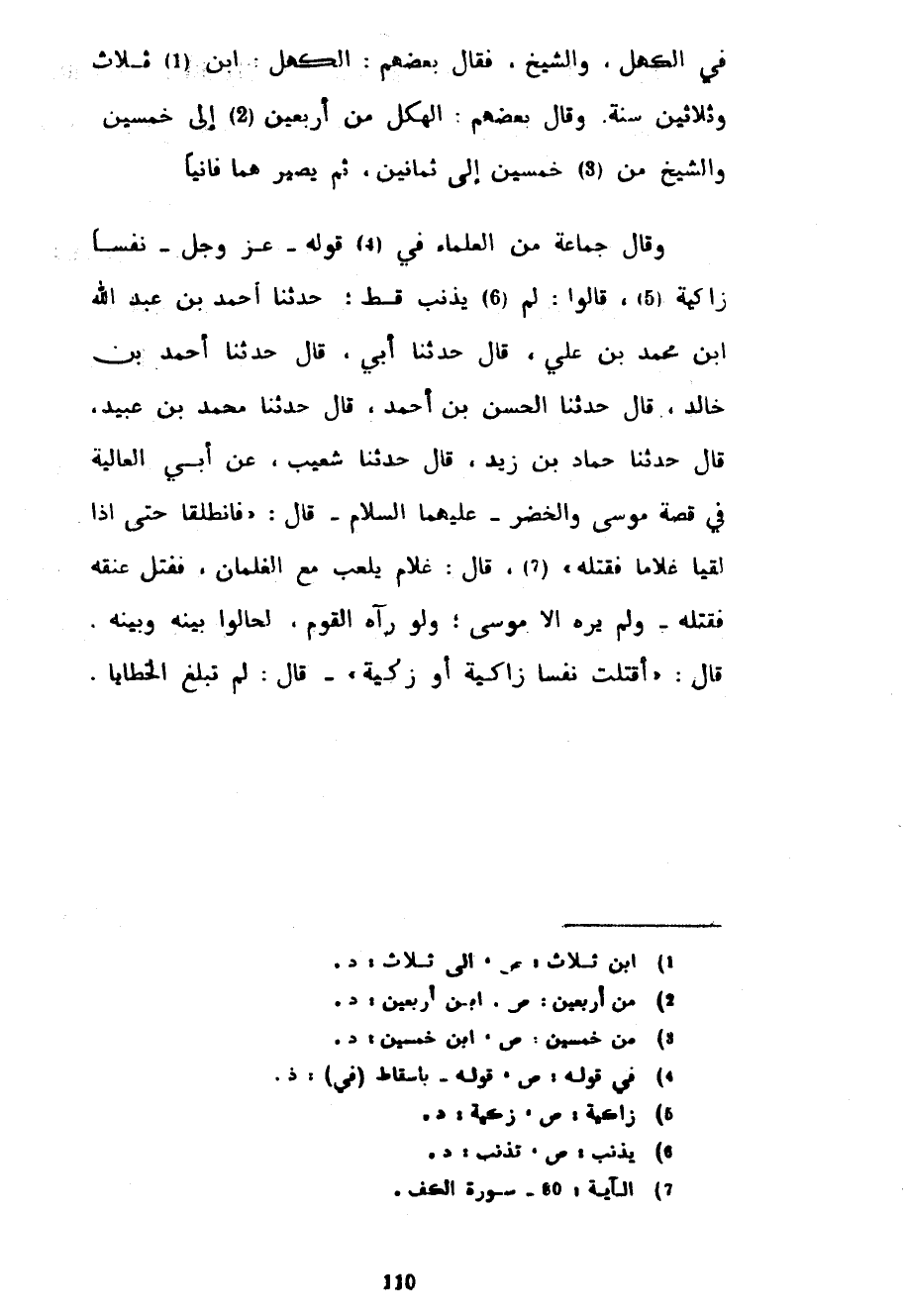 فِي الْكَهْلِ وَالشَّيْخِ فَقَالَ بَعْضُهُمْ الْكَهْلُ ابْنُ ثَلَاثٍ وَثَلَاثِينَ سَنَةً وَقَالَ بَعْضُهُمْ الْكَهْلُ مِنْ أَرْبَعِينَ إِلَى خَمْسِينَ وَالشَّيْخُ مِنْ خَمْسِينَ إِلَى ثَمَانِينَ ثُمَّ يَصِيرُ هَمًّا فَانِيًا وَقَالَ جَمَاعَةٌ مِنَ الْعُلَمَاءِ فِي قَوْلِهِ عَزَّ وَجَلَّ نَفْسًا زَاكِيَةً قَالُوا لَمْ يُذْنِبْ قَطُّ حَدَّثَنَا أَحْمَدُ بْنُ عَبْدِ اللَّهِ بْنِ مُحَمَّدِ بْنِ عَلِيٍّ قَالَ حَدَّثَنَا أَبِي قَالَ حَدَّثَنَا أَحْمَدُ بْنُ خَالِدٍ قَالَ حَدَّثَنَا الْحَسَنُ بْنُ أَحْمَدَ قَالَ حَدَّثَنَا مُحَمَّدُ بْنُ عُبَيْدٍ قَالَ حَدَّثَنَا حَمَّادُ بْنُ زَيْدٍ قَالَ حَدَّثَنَا شُعَيْبٌ عَنْ أَبِي الْعَالِيَةِ فِي قِصَّةِ مُوسَى وَالْخَضِرِ عَلَيْهِمَا السَّلَامُ قَالَ فَانْطَلَقَا حَتَّى إِذَا لَقِيَا غُلَامًا فَقَتَلَهُ قال غلام يلعب مع الغلمان فقتل عُنُقَهُ فَقَتَلَهُ وَلَمْ يَرَهُ إِلَّا مُوسَى وَلَوْ رَآهُ الْقَوْمُ لَحَالُوا بَيْنَهُ وَبَيْنَهُ قَالَ أَقَتَلْتَ نَفْسًا زَاكِيَةً أَوْ زَكِيَّةً قَالَ لَمْ تَبْلُغِ الخطايا