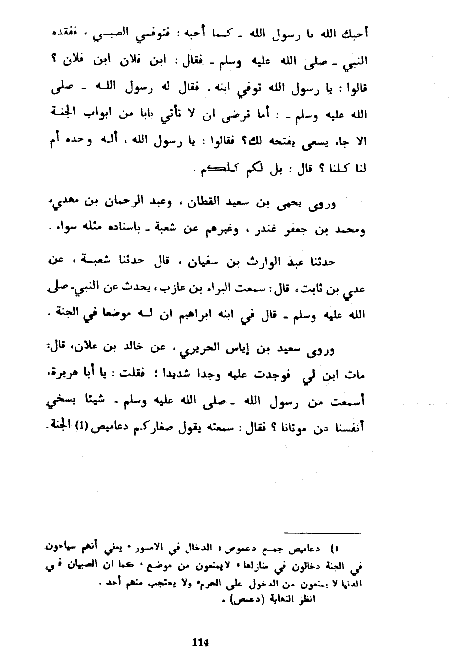 أَحَبَّكَ اللَّهُ يَا رَسُولَ اللَّهِ كَمَا أُحِبُّهُ فَتُوُفِّيَ الصَّبِيُّ فَفَقَدَهُ النَّبِيُّ صَلَّى اللَّهُ عَلَيْهِ وسلم فقال ابن! فُلَانُ ابْنُ فُلَانٍ قَالُوا يَا رَسُولَ اللَّهِ تُوُفِّيَ ابْنُهُ فَقَالَ لَهُ رَسُولُ اللَّهِ صَلَّى اللَّهُ عَلَيْهِ وسلم أماترضى أَنْ لَا تَأْتِيَ بَابًا مِنْ أَبْوَابِ الْجَنَّةِ إِلَّا جَاءَ يَسْعَى يَفْتَحَهُ لَكَ فَقَالُوا يَا رَسُولَ اللَّهِ أَلَهُ وَحْدَهُ أَمْ لَنَا كُلِّنَا قَالَ بَلْ لَكُمْ كُلِّكُمْ وَرَوَى يَحْيَى بْنُ سعيد القطان وعبد الرحمان بْنُ مَهْدِيٍّ وَمُحَمَّدُ بْنُ جَعْفَرٍ غُنْدَرٌ وَغَيْرُهُمْ عَنْ شُعْبَةَ بِإِسْنَادِهِ مِثْلَهُ سَوَاءً حَدَّثَنَا عَبْدُ الْوَارِثِ بْنُ سُفْيَانَ قَالَ حَدَّثَنَا شُعْبَةُ عَنْ عَدِيِّ بْنِ ثَابِتٍ قَالَ سَمِعْتُ الْبَرَاءَ بْنَ عَازِبٍ يُحَدِّثُ عَنِ النَّبِيِّ صَلَّى اللَّهُ عَلَيْهِ وَسَلَّمَ قَالَ في ابنه إبراهيم أنه لَهُ مَوْضِعًا! فِي الْجَنَّةِ وَرَوَى سَعِيدُ بْنُ إِيَاسٍ الْحَرِيرِيُّ عَنْ خَالِدِ بْنِ عَلَّانَ قَالَ مَاتَ ابْنٌ لِي فَوَجَدْتُ عَلَيْهِ وَجْدًا شَدِيدًا فَقُلْتُ يَا أَبَا هُرَيْرَةَ أَسَمِعْتَ مِنْ رَسُولِ اللَّهِ صَلَّى اللَّهُ عَلَيْهِ وَسَلَّمَ شَيْئًا يُسْخِي أَنْفُسَنَا عَنْ مَوْتَانَا فَقَالَ سَمِعْتُهُ يَقُولُ صِغَارُكُمْ دعاميص الجنة