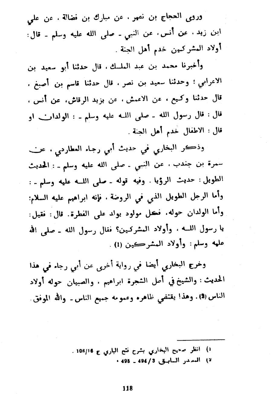 وَرَوَى الْحَجَّاجُ بْنُ نُصَيْرٍ عَنْ مُبَارَكِ بْنِ فُضَالَةَ عَنْ عَلِيِّ بْنِ زَيْدٍ عَنْ أَنَسٍ عَنِ النَّبِيِّ صَلَّى اللَّهُ عَلَيْهِ وَسَلَّمَ قَالَ أَوْلَادُ الْمُشْرِكِينَ خَدَمُ أَهْلِ الْجَنَّةِ وَأَخْبَرَنَا مُحَمَّدُ بْنُ عَبْدِ الْمَلِكِ قَالَ حَدَّثَنَا أَبُو سَعِيدِ بْنُ الْأَعْرَابِيِّ وَحَدَّثَنَا سَعِيدُ بْنُ نَصْرٍ قَالَ حَدَّثَنَا قَاسِمُ بْنُ أَصْبَغَ قَالَ حَدَّثَنَا وَكِيعٌ عن الأعمش عن يزيد الرقاش! عَنْ أَنَسٍ قَالَ قَالَ رَسُولُ اللَّهِ صَلَّى اللَّهُ عَلَيْهِ وَسَلَّمَ الْوِلْدَانُ أَوْ قَالَ الْأَطْفَالُ خَدَمُ أَهْلِ الْجَنَّةِ وَذَكَرَ الْبُخَارِيُّ فِي حَدِيثِ أبي رجاء العطاردي عَنْ سَمُرَةُ بْنُ جُنْدُبٍ عَنِ النَّبِيِّ صَلَّى اللَّهُ عَلَيْهِ وَسَلَّمَ الْحَدِيثَ الطَّوِيلَ حَدِيثَ الرُّؤْيَا وَفِيهِ قَوْلُهُ صَلَّى اللَّهُ عَلَيْهِ وَسَلَّمَ وَأَمَّا الرَّجُلُ الطَّوِيلُ الَّذِي فِي الرَّوْضَةِ فَإِنَّهُ إِبْرَاهِيمُ عَلَيْهِ السَّلَامُ وَأَمَّا الْوِلْدَانُ حَوْلَهُ فَكُلُّ مَوْلُودٍ يُولَدُ عَلَى الْفِطْرَةِ قَالَ فَقِيلَ يَا رَسُولَ اللَّهِ وَأَوْلَادُ الْمُشْرِكِينَ فَقَالَ رَسُولُ اللَّهِ صَلَّى اللَّهُ عَلَيْهِ وَسَلَّمَ وَأَوْلَادُ الْمُشْرِكِينَ وَخَرَّجَ الْبُخَارِيُّ أَيْضًا فِي رِوَايَةٍ أُخْرَى عَنْ أَبِي رَجَاءٍ فِي هَذَا الْحَدِيثِ وَالشَّيْخُ فِي أَصْلِ الشَّجَرَةِ إِبْرَاهِيمُ وَالصِّبْيَانُ حَوْلَهُ أَوْلَادُ النَّاسِ وَهَذَا يَقْتَضِي ظَاهِرُهُ وَعُمُومُهُ جَمِيعَ النَّاسِ والله الموفق