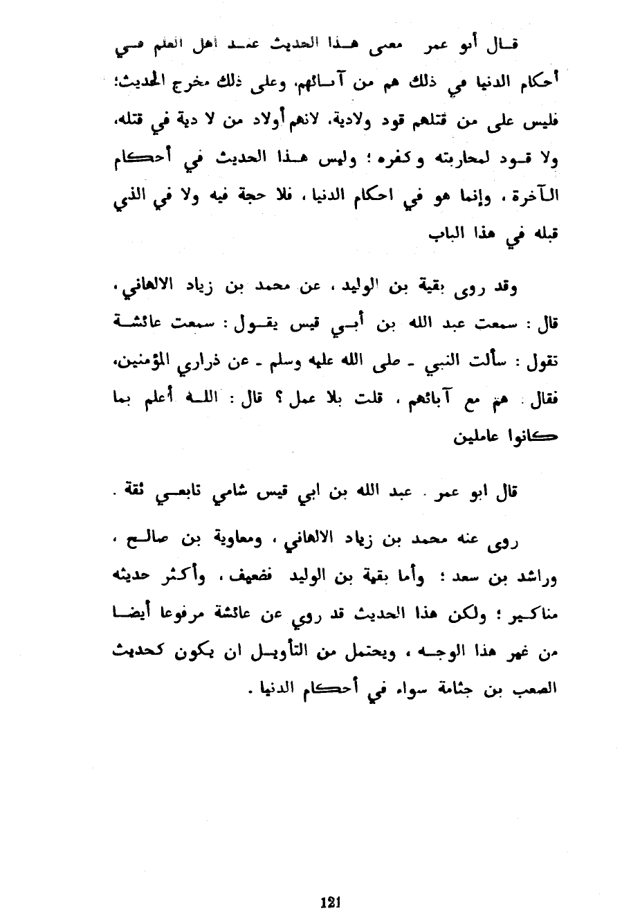 قَالَ أَبُو عُمَرَ مَعْنَى هَذَا الْحَدِيثِ عِنْدَ أَهْلِ الْعِلْمِ فِي أَحْكَامِ الدُّنْيَا فِي ذَلِكَ هُمْ مِنْ آبَائِهِمْ وَعَلَى ذَلِكَ مَخْرَجُ الْحَدِيثِ فَلَيْسَ عَلَى مَنْ قَتَلَهُمْ قَوْدٌ وَلَا دِيَةٌ لِأَنَّهُمْ أَوْلَادُ مَنْ لَا دِيَةَ فِي قَتْلِهِ وَلَا قَوْدَ لِمُحَارَبَتِهِ وَكُفْرِهِ وَلَيْسَ هَذَا الْحَدِيثُ فِي أَحْكَامِ الْآخِرَةِ وَإِنَّمَا هُوَ فِي أَحْكَامِ الدُّنْيَا فَلَا حُجَّةَ فِيهِ وَلَا فِي الَّذِي قَبْلَهُ فِي هَذَا الْبَابِ وَقَدْ رَوَى بَقِيَّةُ بْنُ الْوَلِيدِ عَنْ مُحَمَّدِ بْنِ زِيَادٍ الْأَلْهَانِيِّ قَالَ سَمِعْتُ عَبْدَ اللَّهِ بْنَ أَبِي قَيْسٍ يَقُولُ سَمِعْتُ عَائِشَةَ تَقُولُ سَأَلَتِ النَّبِيَّ صَلَّى اللَّهُ عَلَيْهِ وَسَلَّمَ عَنْ ذَرَارِيِّ الْمُؤْمِنِينَ فَقَالَ هُمْ مَعَ آبَائِهِمْ قُلْتُ بِلَا عَمَلٍ قَالَ اللَّهُ أَعْلَمُ بِمَا كَانُوا عَامِلِينَ قَالَ أَبُو عُمَرَ عَبْدُ اللَّهِ بْنُ أَبِي قَيْسٍ شَامِيٌّ تَابِعِيٌّ ثِقَةٌ رَوَى عَنْهُ مُحَمَّدُ بْنُ زِيَادٍ الْأَلْهَانِيُّ وَمُعَاوِيَةُ بْنُ صَالِحٍ وَرَاشِدُ بْنُ سَعْدٍ وَأَمَّا بَقِيَّةُ بْنُ الْوَلِيدِ فَضَعِيفٌ وَأَكْثَرُ حَدِيثِهِ مَنَاكِيرُ وَلَكِنَّ هَذَا الْحَدِيثَ قَدْ رُوِيَ عَنْ عَائِشَةَ مَرْفُوعًا أَيْضًا مِنْ غَيْرِ هَذَا الْوَجْهِ وَيُحْتَمَلُ مِنَ التَّأْوِيلِ أَنْ يَكُونَ كَحَدِيثِ الصَّعْبِ بْنِ جَثَّامَةَ سَوَاءً فِي أَحْكَامِ الدُّنْيَا