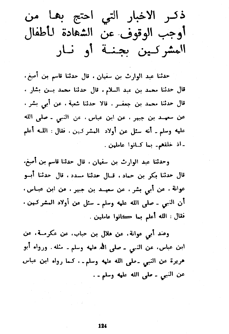حَدَّثَنَا عَبْدُ الْوَارِثِ بْنُ سُفْيَانَ قَالَ حَدَّثَنَا قَاسِمُ بْنُ أَصْبَغَ قَالَ حَدَّثَنَا مُحَمَّدُ بْنُ عَبْدِ السَّلَامِ قَالَ حَدَّثَنَا مُحَمَّدُ بْنُ بَشَّارٍ قَالَ حَدَّثَنَا مُحَمَّدُ بْنُ جَعْفَرٍ قَالَا حَدَّثَنَا شُعْبَةُ عَنْ أَبِي بِشْرٍ عَنْ سَعِيدِ بْنِ جُبَيْرٍ عَنِ ابْنِ عَبَّاسٍ عَنِ النَّبِيِّ صَلَّى اللَّهُ عَلَيْهِ وَسَلَّمَ أَنَّهُ سُئِلَ عَنْ أَوْلَادِ الْمُشْرِكِينَ فَقَالَ اللَّهُ أَعْلَمُ إِذْ خَلَقَهُمْ بِمَا كَانُوا عَامِلِينَ وَحَدَّثَنَا عَبْدُ الْوَارِثِ بْنُ سُفْيَانَ قَالَ حَدَّثَنَا قَاسِمُ بْنُ أَصْبَغَ قَالَ حَدَّثَنَا بَكْرُ بْنُ حَمَّادٍ قَالَ حَدَّثَنَا مُسَدَّدٌ قال حدثنا أبوعوانة عَنْ أَبِي بِشْرٍ عَنْ سَعِيدِ بْنِ جُبَيْرٍ عَنِ ابْنِ عَبَّاسٍ أَنَّ النَّبِيَّ صَلَّى اللَّهُ عَلَيْهِ وَسَلَّمَ سُئِلَ عَنْ أَوْلَادِ الْمُشْرِكِينَ فَقَالَ اللَّهُ أَعْلَمُ بِمَا كَانُوا عَامِلِينَ وَعِنْدَ أَبِي عَوَانَةَ عَنْ هِلَالِ بْنِ حُبَابٍ عَنْ عِكْرِمَةَ عَنِ ابْنِ عَبَّاسٍ عَنِ النَّبِيِّ صَلَّى اللَّهُ عليه وسلم مثله ورواه أبوهريرة عَنِ النَّبِيِّ صَلَّى اللَّهُ عَلَيْهِ وَسَلَّمَ كَمَا رَوَاهُ ابْنُ عَبَّاسٍ عَنِ النَّبِيِّ صَلَّى اللَّهُ عَلَيْهِ وسلم