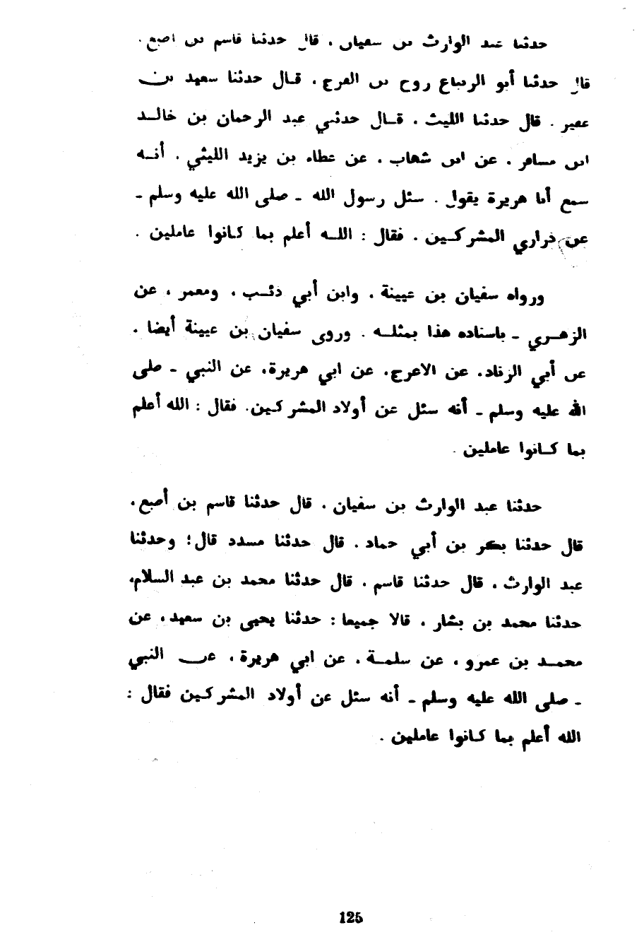 حَدَّثَنَا عَبْدُ الْوَارِثِ بْنُ سُفْيَانَ قَالَ حَدَّثَنَا قَاسِمُ بْنُ أَصْبَغَ قَالَ حَدَّثَنَا أَبُو الزِّنْبَاعِ! رَوْحُ بْنُ الْفَرَجِ قَالَ حَدَّثَنَا سَعِيدُ بْنُ عُفَيْرٍ قَالَ حَدَّثَنَا اللَّيْثُ قَالَ حَدَّثَنِي عَبْدُ الرحمان بْنِ خَالِدِ بْنِ مُسَافِرٍ عَنِ ابْنِ شِهَابٍ عَنْ عَطَاءِ بْنِ يَزِيدَ اللَّيْثِيِّ أَنَّهُ سَمِعَ أَبَا هُرَيْرَةَ يَقُولُ سُئِلَ رَسُولُ اللَّهِ صَلَّى اللَّهُ عَلَيْهِ وَسَلَّمَ عَنْ ذَرَارِيِّ الْمُشْرِكِينَ فَقَالَ اللَّهُ أَعْلَمُ بِمَا كَانُوا عَامِلِينَ وَرَوَاهُ سُفْيَانُ بْنُ عُيَيْنَةَ وَابْنُ أَبِي ذِئْبٍ وَمَعْمَرٌ عَنِ الزُّهْرِيِّ بِإِسْنَادِهِ هَذَا بِمِثْلِهِ وَرَوَى سُفْيَانُ بْنُ عُيَيْنَةَ أَيْضًا عَنْ أَبِي الزِّنَادِ عَنِ الْأَعْرَجِ عَنْ أَبِي هُرَيْرَةَ عَنِ النَّبِيِّ صَلَّى اللَّهُ عَلَيْهِ وَسَلَّمَ أَنَّهُ سُئِلَ عَنْ أَوْلَادِ الْمُشْرِكِينَ فَقَالَ اللَّهُ أَعْلَمُ بِمَا كَانُوا عَامِلِينَ حَدَّثَنَا عَبْدُ الْوَارِثِ بْنُ سُفْيَانَ قَالَ حَدَّثَنَا قَاسِمُ بْنُ أَصْبَغَ قَالَ حَدَّثَنَا بَكْرُ بْنُ أَبِي حَمَّادٍ قَالَ حَدَّثَنَا مُسَدَّدٌ قَالَ وَحَدَّثَنَا عَبْدُ الْوَارِثِ قَالَ حَدَّثَنَا قَاسِمٌ قَالَ حَدَّثَنَا مُحَمَّدُ بْنُ عَبْدِ السَّلَامِ حَدَّثَنَا مُحَمَّدُ بْنُ بَشَّارٍ قَالَا جَمِيعًا حَدَّثَنَا يَحْيَى بْنُ سَعِيدٍ عَنْ مُحَمَّدِ بْنِ عَمْرٍو عَنْ سَلَمَةَ عَنْ أَبِي هُرَيْرَةَ عَنِ النَّبِيِّ صَلَّى الله عليه وسلم أَنَّهُ سُئِلَ عَنْ أَوْلَادِ الْمُشْرِكِينَ فَقَالَ اللَّهُ أَعْلَمُ بِمَا كَانُوا عَامِلِينَ