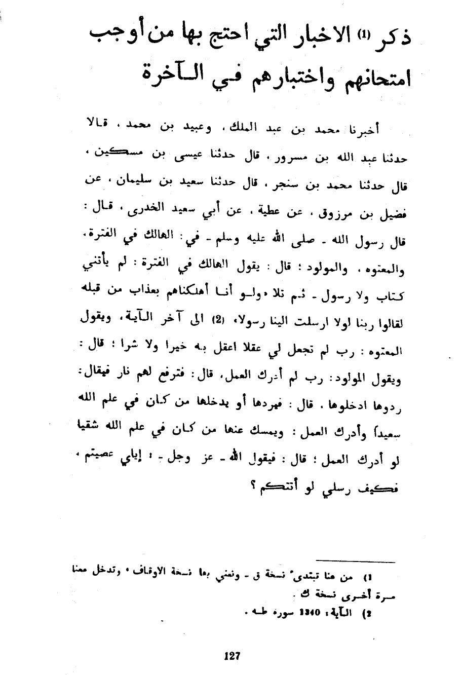 ذكر الأخبار التي احتج بها من أوجب امْتِحَانَهُمْ وَاخْتِبَارَهُمْ فِي الْآخِرَةِ أَخْبَرَنَا مُحَمَّدُ بْنُ عَبْدِ الْمَلِكِ وَعُبَيْدُ بْنُ مُحَمَّدٍ قَالَا حَدَّثَنَا عَبْدُ اللَّهِ بْنُ مَسْرُورٍ قَالَ حَدَّثَنَا عيسى بْنُ مُسَيْكِنِ قَالَ حَدَّثَنَا مُحَمَّدُ بْنُ سَنْجَرٍ قَالَ حَدَّثَنَا سَعِيدُ بْنُ سُلَيْمَانَ عَنْ فُضَيْلِ بْنِ مَرْزُوقٍ عَنْ عَطِيَّةَ عَنْ أَبِي سَعِيدٍ الْخُدْرِيِّ قَالَ قَالَ رَسُولُ اللَّهِ صَلَّى اللَّهُ عَلَيْهِ وَسَلَّمَ فِي الْهَالِكِ فِي الْفَتْرَةِ وَالْمَعْتُوهِ وَالْمَوْلُودِ قَالَ يَقُولُ الْهَالِكُ فِي الْفَتْرَةِ لَمْ يَأْتِنِي كِتَابٌ وَلَا رَسُولٌ ثُمَّ تَلَا وَلَوْ أَنَّا أَهْلَكْنَاهُمْ بِعَذَابٍ مِنْ قَبْلِهِ لَقَالُوا رَبَّنَا لَوْلَا أَرْسَلْتَ إِلَيْنَا رَسُولًا إِلَى آخِرِ الْآيَةِ وَيَقُولُ الْمَعْتُوهُ رَبِّ لَمْ تَجْعَلْ لِي عَقْلًا أَعْقِلُ بِهِ خَيْرًا وَلَا شَرًّا قَالَ وَيَقُولُ الْمَوْلُودُ رَبِّ لَمْ أُدْرِكِ الْعَمَلَ قَالَ فَتُرْفَعُ لَهُمْ نَارٌ فَيُقَالُ رِدُوهَا ادْخُلُوهَا قَالَ فَيَرِدُهَا أَوْ يَدْخُلُهَا مَنْ كَانَ فِي عِلْمِ اللَّهِ سعيدا وأدرك الْعَمَلَ وَيُمْسِكُ عَنْهَا مَنْ كَانَ فِي عِلْمِ اللَّهِ شَقِيًّا لَوْ أَدْرَكَ الْعَمَلَ قَالَ فَيَقُولُ اللَّهُ عَزَّ وَجَلَّ إِيَّايَ عَصَيْتُمْ فَكَيْفَ رُسُلِي لو أتتكم