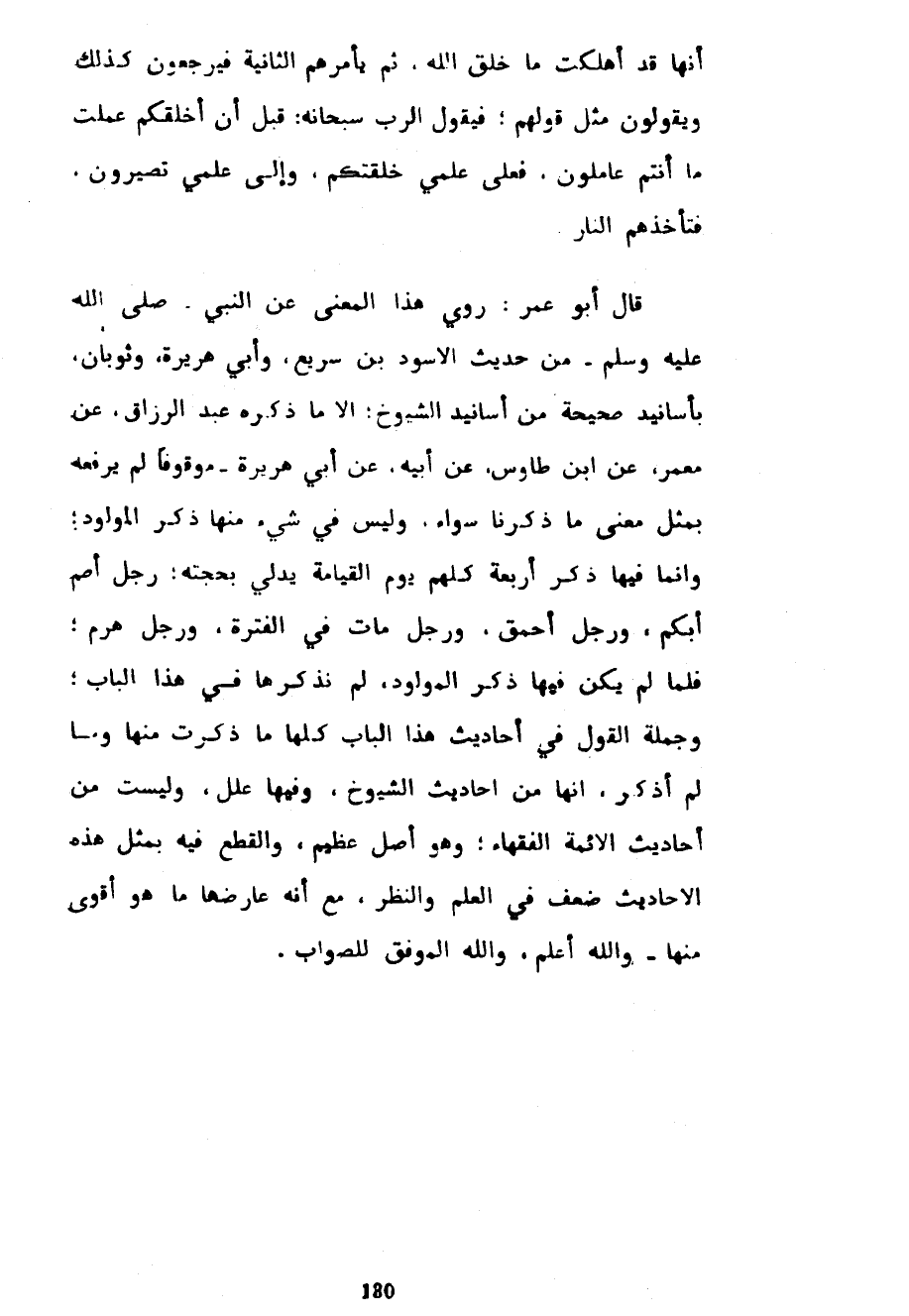 أَنَّهَا قَدْ أَهْلَكَتْ مَا خَلَقَ اللَّهُ ثُمَّ يَأْمُرُهُمُ الثَّانِيَةَ فَيَرْجِعُونَ كَذَلِكَ وَيَقُولُونَ مِثْلَ قَوْلِهِمْ فَيَقُولُ الرَّبُّ سُبْحَانَهُ قَبْلَ أَنْ أَخْلُقَكُمْ عَلِمْتُ مَا أَنْتُمْ عَامِلُونَ فَعَلَى عِلْمِي خَلَقْتُكُمْ وَإِلَى عِلْمِي تَصِيرُونَ فَتَأْخُذُهُمُ النَّارُ قَالَ أَبُو عُمَرَ رَوَى هَذَا الْمَعْنَى عَنِ النَّبِيِّ صَلَّى اللَّهُ عَلَيْهِ وَسَلَّمَ مِنْ حَدِيثِ الْأَسْوَدِ بْنِ سَرِيعٍ وأبي هريرة وثوبان بأسانيد صحية مِنْ أَسَانِيدِ الشُّيُوخِ إِلَّا مَا ذَكَرَهُ عَبْدُ الرَّزَّاقِ عَنْ مَعْمَرٍ عَنِ ابْنِ طَاوُسٍ عَنْ أَبِيهِ عَنْ أَبِي هُرَيْرَةَ مَوْقُوفًا لَمْ يَرْفَعْهُ بِمِثْلِ مَعْنَى مَا ذَكَرْنَا سَوَاءً وَلَيْسَ فِي شَيْءٍ مِنْهَا ذِكْرُ الْمَوْلُودِ وَإِنَّمَا فِيهَا ذِكْرُ أَرْبَعَةٍ كُلُّهُمْ يَوْمَ الْقِيَامَةِ يُدْلِي بِحُجَّتِهِ رَجُلٌ أَصَمُّ أَبْكَمُ وَرَجُلٌ أَحْمَقُ وَرَجُلٌ مَاتَ فِي الْفَتْرَةِ وَرَجُلٌ هَرِمٌ فَلَمَّا لَمْ يَكُنْ فِيهَا ذِكْرُ الْمَوْلُودِ لَمْ نَذْكُرْهَا فِي هَذَا الْبَابِ وَجُمْلَةُ الْقَوْلِ فِي أَحَادِيثِ هَذَا الْبَابِ كُلِّهَا مَا ذَكَرْتُ مِنْهَا وَمَا لَمْ أَذْكُرْ أَنَّهَا مِنْ أَحَادِيثِ الشُّيُوخِ وَفِيهَا عِلَلٌ وَلَيْسَتْ مِنْ أَحَادِيثِ الْأَئِمَّةِ الْفُقَهَاءِ وَهُوَ أَصْلٌ عَظِيمٌ وَالْقَطَعُ فِيهِ بِمِثْلِ هَذِهِ الْأَحَادِيثِ ضَعْفٌ فِي الْعِلْمِ وَالنَّظَرِ مَعَ أَنَّهُ عَارَضَهَا مَا هُوَ أَقْوَى مِنْهَا وَاللَّهُ أَعْلَمُ وَاللَّهُ الْمُوَفِّقُ لِلصَّوَابِ