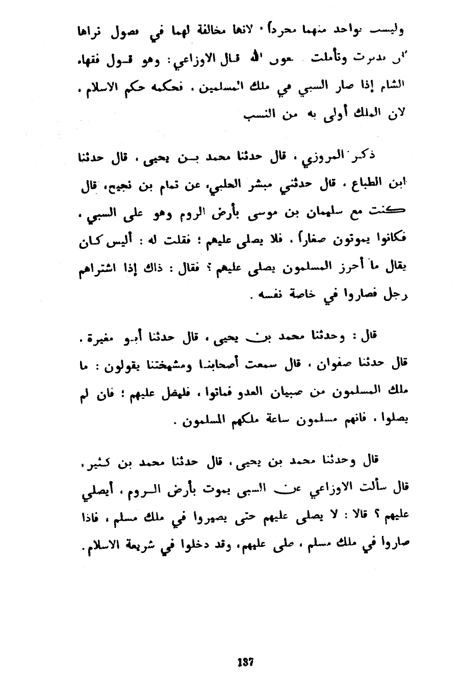 وَلَيْسَتْ بِوَاحِدٍ مِنْهُمَا مُجَرَّدًا لِأَنَّهَا مُخَالِفَةٌ لَهُمَا فِي فُصُولٍ تَرَاهَا إِنْ تَدَبَّرْتَ وَتَأَمَّلْتَ بِعَوْنِ اللَّهِ قَالَ الْأَوْزَاعِيُّ وَهُوَ قَوْلُ فُقَهَاءِ الشَّامِ إِذَا صَارَ السَّبْيُ فِي مِلْكِ الْمُسْلِمِينَ فَحُكْمُهُ حُكْمُ الْإِسْلَامِ لِأَنَّ الْمِلْكَ أَوْلَى بِهِ مِنَ النَّسَبِ ذَكَرَ الْمَرْوَزِيُّ قَالَ حَدَّثَنَا مُحَمَّدُ بْنُ يَحْيَى قَالَ حَدَّثَنَا ابْنُ الطَّبَّاعِ قَالَ حَدَّثَنِي مُبَشِّرٌ الْحَلَبِيُّ عَنْ تَمَّامِ بْنِ نَجِيحٍ قَالَ كُنْتُ مَعَ سُلَيْمَانَ بْنِ مُوسَى بِأَرْضِ الرُّومِ وَهُوَ عَلَى السَّبْيِ فَكَانُوا يَمُوتُونَ صِغَارًا فَلَا يُصَلَّى عَلَيْهِمْ فَقُلْتُ لَهُ أَلَيْسَ كَانَ يُقَالُ مَا أَحْرَزَ الْمُسْلِمُونَ يُصَلَّى عَلَيْهِمْ فَقَالَ ذَاكَ إِذَا اشْتَرَاهُمْ رَجُلٌ فَصَارُوا فِي خَاصَّةِ نَفْسِهِ قَالَ وَحَدَّثَنَا مُحَمَّدُ بْنُ يَحْيَى قَالَ حَدَّثَنَا أَبُو مُغِيرَةَ قَالَ حَدَّثَنَا صَفْوَانُ قَالَ سَمِعْتُ أَصْحَابَنَا وَمَشْيَخَتَنَا يَقُولُونَ مَا مَلَكَ الْمُسْلِمُونَ مِنْ صِبْيَانِ الْعَدُوِّ فَمَاتُوا فَلْيُصَلَّ عَلَيْهِمْ فَإِنْ لَمْ يُصَلُّوا فَإِنَّهُمْ مُسْلِمُونَ سَاعَةَ مَلَكَهُمُ الْمُسْلِمُونَ قَالَ وَحَدَّثَنَا مُحَمَّدِ بْنِ يَحْيَى قَالَ حَدَّثَنَا مُحَمَّدُ بْنُ كَثِيرٍ قَالَ سَأَلْتُ الْأَوْزَاعِيَّ عَنِ السَّبْيِ يموت بأرض الروم أيصلى عليهم قالا! لَا يُصَلَّى عَلَيْهِمْ حَتَّى يَصِيرُوا فِي مِلْكِ مُسْلِمٍ فَإِذَا صَارُوا فِي مِلْكِ مُسْلِمٍ صُلِّيَ عَلَيْهِمْ وَقَدْ دَخَلُوا فِي شَرِيعَةِ الْإِسْلَامِ