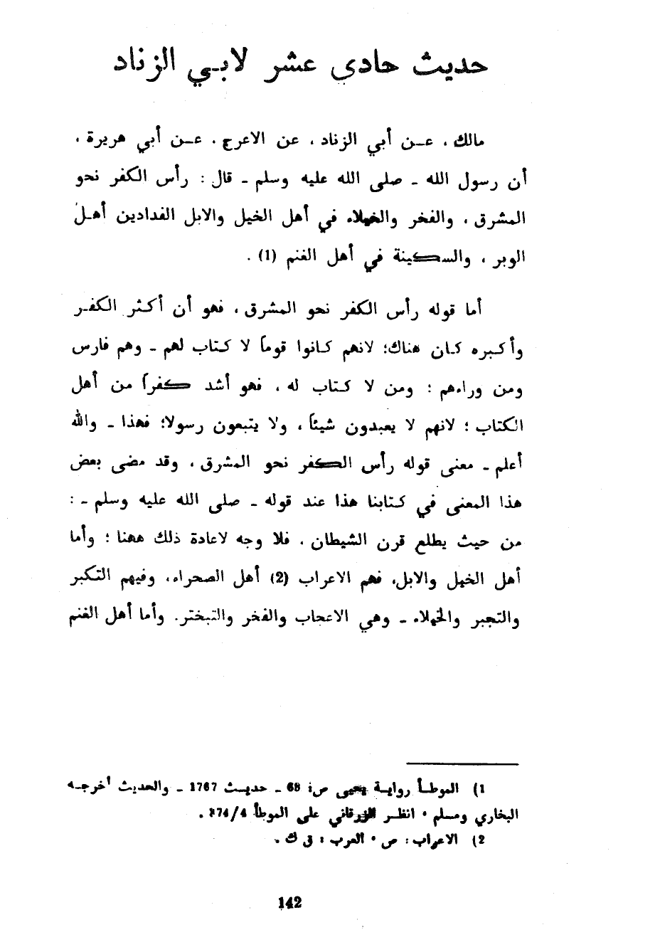 حَدِيثٌ حَادِي عَشَرَ لِأَبِي الزِّنَادِ مَالِكٌ عَنْ أَبِي الزِّنَادِ عَنِ الْأَعْرَجِ عَنْ أَبِي هُرَيْرَةَ أَنَّ رَسُولَ اللَّهِ صَلَّى اللَّهُ عَلَيْهِ وسلم قَالَ رَأْسُ الْكُفْرِ نَحْوَ الْمَشْرِقِ وَالْفَخْرُ وَالْخُيَلَاءُ في أهل الخيل والإبل الفدادين أَهْلِ الْوَبَرِ وَالسَّكِينَةُ فِي أَهْلِ الْغَنَمِ أَمَّا قَوْلُهُ رَأْسُ الْكُفْرِ نَحْوَ الْمَشْرِقِ فَهُوَ أَنَّ أَكْثَرَ الْكُفْرِ وَأَكْبَرَهُ كَانَ هُنَاكَ لِأَنَّهُمْ كَانُوا قَوْمًا لَا كِتَابَ لَهُمْ وَهُمْ فَارِسُ وَمَنْ وَرَاءَهُمْ وَمَنْ لَا كِتَابَ لَهُ فَهُوَ أَشَدُّ كُفْرًا مِنْ أَهْلِ الْكِتَابِ لِأَنَّهُمْ لَا يَعْبُدُونَ شَيْئًا وَلَا يَتَّبِعُونَ رَسُولًا فَهَذَا وَاللَّهُ أَعْلَمُ معنى قوله ررأس الْكُفْرِ نَحْوَ الْمَشْرِقِ وَقَدْ مَضَى بَعْضُ هَذَا الْمَعْنَى فِي كِتَابِنَا هَذَا عِنْدَ قَوْلِهِ صَلَّى اللَّهُ عَلَيْهِ وَسَلَّمَ مِنْ حَيْثُ يَطْلُعُ قَرْنُ الشَّيْطَانِ فَلَا وَجْهَ لِإِعَادَةِ ذَلِكَ هَهُنَا وَأَمَّا أَهْلُ الْخَيْلِ وَالْإِبِلِ فَهُمُ الْأَعْرَابُ أَهْلُ الصَّحَرَاءِ وَفِيهِمُ التَّكَبُّرُ وَالتَّجَبُّرُ وَالْخُيَلَاءُ وَهِيَ الْإِعْجَابُ وَالْفَخْرُ وَالتَّبَخْتُرُ وَأَمَّا أَهْلُ الْغَنَمِ