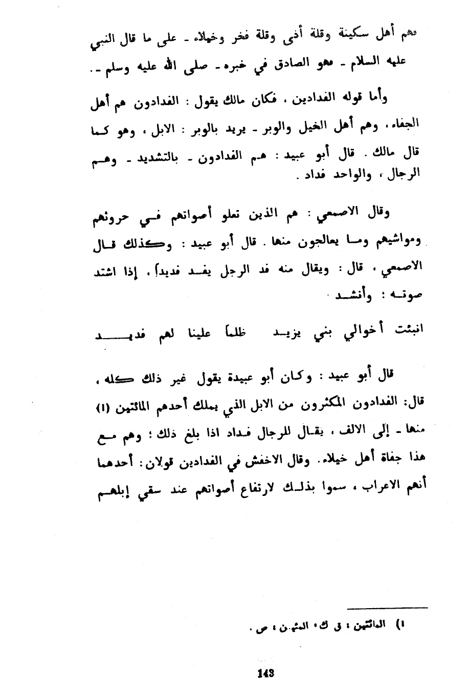 فَهُمْ أَهْلُ سَكِينَةٍ وَقِلَّةِ أَذًى وَقِلَّةِ فَخْرٍ وَخُيَلَاءَ عَلَى مَا قَالَ النَّبِيُّ عَلَيْهِ السَّلَامُ فَهُوَ الصَّادِقُ فِي خَبَرِهِ صَلَّى اللَّهُ عَلَيْهِ وَسَلَّمَ وَأَمَّا قَوْلُهُ الْفَدَّادِينَ فَكَانَ مَالِكٌ يَقُولُ الْفَدَّادُونَ هُمْ أَهْلُ الْجَفَاءِ وَهُمْ أَهْلُ الْخَيْلِ وَالْوَبَرِ يُرِيدُ بِالْوَبَرِ الْإِبِلَ وَهُوَ كَمَا قَالَ مَالِكٌ قَالَ أَبُو عُبَيْدٍ هُمُ الْفَدَّادُونَ بِالتَّشْدِيدِ وَهُمُ الرِّجَالُ وَالْوَاحِدُ فَدَّادٌ وَقَالَ الْأَصْمَعِيُّ هُمُ الَّذِينَ تَعْلُو أَصْوَاتُهُمْ فِي حُرُوثِهِمْ وَمَوَاشِيهِمْ وَمَا يُعَالَجُونَ مِنْهَا قَالَ أَبُو عُبَيْدٍ وَكَذَلِكَ قَالَ الْأَصْمَعِيُّ قَالَ وَيُقَالُ مِنْهُ فَدَّ الرَّجُلُ يَفِدُّ فَدِيدًا إِذَا اشْتَدَّ صَوْتُهُ وَأَنْشَدَ ... أَنْبَئْتُ أَخْوَالِي بَنِي يَزِيدَ ... ظُلْمًا عَلَيْنَا لَهُمْ فَدِيدُ ... قَالَ أَبُو عُبَيْدٍ وَكَانَ أَبُو عُبَيْدَةَ يَقُولُ غَيْرَ ذَلِكَ كُلِّهِ قَالَ الْفَدَّادُونَ الْمُكْثِرُونَ مِنَ الْإِبِلِ الَّذِي يَمْلِكُ أَحَدُهُمُ الْمِائَتَيْنِ مِنْهَا إِلَى الْأَلْفِ يُقَالُ لِلرِّجَالِ فَدَّادٌ إِذَا بَلَغَ ذَلِكَ وَهُمْ مَعَ هَذَا جُفَاةٌ أَهْلُ خُيَلَاءَ وَقَالَ الْأَخْفَشُ فِي الْفَدَّادِينَ قَوْلَانِ أَحَدُهُمَا أَنَّهُمُ الْأَعْرَابُ سُمُّوا بِذَلِكَ لِارْتِفَاعِ أَصْوَاتِهِمْ عِنْدَ سَقْيِ إِبِلِهِمْ
