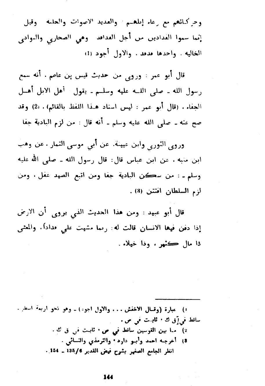 وَحَرَكَاتِهِمْ مَعَ رِعَاءِ إِبِلِهِمْ وَالْفَدِيدُ الْأَصْوَاتُ وَالْجَلَبَةُ وَقِيلَ إِنَّمَا سُمُّوُا الْفَدَّادِينَ مِنْ أَجْلِ الْفَدَافِدِ وَهِيَ الصَّحَارِي وَالْبَوَادِي الْخَالِيَةُ وَاحِدُهَا فَدْفَدٌ وَالْأَوَّلُ أَجْوَدُ قَالَ أَبُو عُمَرَ وَرُوِيَ مِنْ حَدِيثِ قَيْسِ بْنِ عَاصِمٍ أَنَّهُ سَمِعَ رَسُولَ اللَّهِ صَلَّى اللَّهُ عَلَيْهِ وَسَلَّمَ يَقُولُ أَهْلُ الْإِبِلِ أَهْلُ الْجَفَاءِ (قَالَ أَبُو عُمَرَ لَيْسَ إِسْنَادُ هَذَا اللَّفْظِ بِالْقَائِمِ) وَقَدْ صَحَّ عَنْهُ صَلَّى اللَّهُ عَلَيْهِ وَسَلَّمَ أَنَّهُ قَالَ مَنْ لَزِمَ الْبَادِيَةَ جَفَا وَرَوَى الثَّوْرِيُّ وَابْنُ عُيَيْنَةَ عَنْ أَبِي مُوسَى التَّمَّارِ عَنْ وَهْبِ بْنِ مُنَبِّهٍ عَنِ ابْنِ عَبَّاسٍ قَالَ قَالَ رَسُولُ اللَّهِ صَلَّى اللَّهُ عَلَيْهِ وَسَلَّمَ مَنْ سَكَنَ الْبَادِيَةَ جَفَا وَمَنِ اتَّبَعَ الصَّيْدَ غَفَلَ وَمَنْ لَزِمَ السُّلْطَانَ افْتَتَنَ قَالَ أَبُو عُبَيْدٍ وَمِنْ هَذَا الْحَدِيثِ الَّذِي يُرْوَى أَنَّ الْأَرْضَ إِذَا دُفِنَ فِيهَا الْإِنْسَانُ قَالَتْ لَهُ رُبَّمَا مَشَيْتَ عَلَيَّ فَدَّادًا وَالْمَعْنَى ذَا مَالٍ كَثِيرٍ وَذَا خُيَلَاءَ