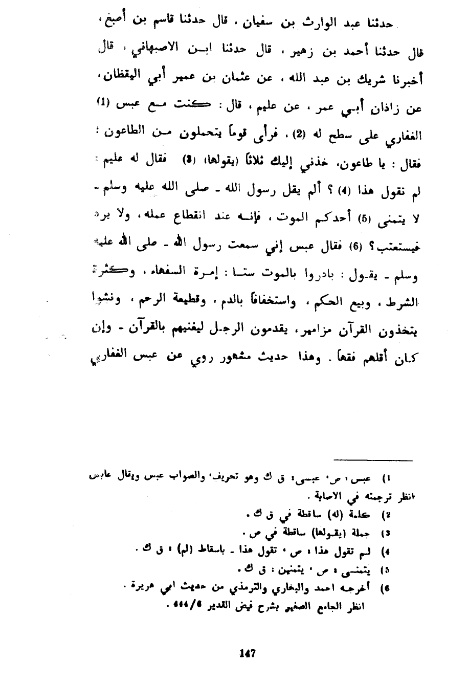 حَدَّثَنَا عَبْدُ الْوَارِثِ بْنُ سُفْيَانَ قَالَ حَدَّثَنَا قَاسِمُ بْنُ أَصْبَغَ قَالَ حَدَّثَنَا أَحْمَدُ بْنُ زُهَيْرٍ قَالَ حَدَّثَنَا ابْنُ الْأَصْبَهَانِيِّ قَالَ أَخْبَرَنَا شَرِيكُ بْنُ عَبْدِ اللَّهِ عَنْ عُثْمَانَ بْنِ عُمَيْرٍ أَبِي الْيَقْظَانِ عَنْ زَاذَانَ أَبِي عُمَرَ عن عليم قال كنت مع عبس الْغِفَارِيِّ عَلَى سَطْحٍ لَهُ فَرَأَى قَوْمًا يَتَحَمَّلُونَ مِنَ الطَّاعُونِ فَقَالَ يَا طَاعُونُ خُذْنِي إِلَيْكَ ثَلَاثًا (يَقُولُهَا) فَقَالَ لَهُ عُلَيْمٌ لِمَ تَقُولُ هَذَا أَلَمْ يَقُلْ رَسُولُ اللَّهِ صَلَّى اللَّهُ عَلَيْهِ وَسَلَّمَ لَا يَتَمَنَّى أَحَدُكُمُ الْمَوْتَ فَإِنَّهُ عِنْدَ انْقِطَاعِ عَمَلِهِ وَلَا يُرَدُّ فَيُسْتَعْتَبُ فَقَالَ عبس إِنِّي سَمِعْتُ رَسُولَ اللَّهِ صَلَّى اللَّهُ عَلَيْهِ وَسَلَّمَ يَقُولُ بَادِرُوا بِالْمَوْتِ سِتًّا إِمْرَةَ السُّفَهَاءِ وكثرةالشرط وَبَيْعَ الْحُكْمِ وَاسْتِخْفَافًا بِالدَّمِ وَقَطِيعَةَ الرَّحِمِ وَنَشْوًا يَتَّخِذُونَ الْقُرْآنَ مَزَامِيرَ يُقَدِّمُونَ الرَّجُلَ لِيُغَنِّيَهُمْ بِالْقُرْآنِ وَإِنْ كَانَ أَقَلَّهُمْ فِقْهًا وَهَذَا حَدِيثٌ مَشْهُورٌ روي عن عبس الغفاري
