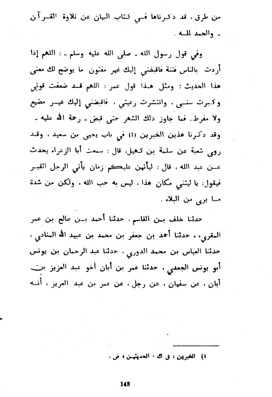 مِنْ طُرُقٍ قَدْ ذَكَرْنَاهَا فِي كِتَابِ الْبَيَانِ عَنْ تِلَاوَةِ الْقُرْآنِ وَالْحَمْدُ لِلَّهِ وَفِي قَوْلِ رَسُولِ اللَّهِ صَلَّى اللَّهُ عَلَيْهِ وَسَلَّمَ اللَّهُمَّ إِذَا أَرَدْتَ بِالنَّاسِ فِتْنَةً فَاقْبِضْنِي إِلَيْكَ غَيْرَ مَفْتُونٍ مَا يُوَضِّحُ لَكَ مَعْنَى هَذَا الْحَدِيثِ وَمِثْلُ هَذَا قَوْلُ عُمَرَ اللَّهُمَّ قَدْ ضَعُفَتْ قُوَّتِي وَكَبُرَتْ سِنِّي وَانْتَشَرَتْ رَعِيَّتِي فَاقْبِضْنِي إِلَيْكَ غَيْرَ مُضَيِّعٍ وَلَا مُفَرِّطٍ فَمَا جَاوَزَ ذَلِكَ الشَّهْرَ حَتَّى قُبِضَ رَحْمَةُ اللَّهِ عَلَيْهِ وَقَدْ ذَكَرْنَا هَذَيْنِ الْخَبَرَيْنِ فِي بَابِ يَحْيَى بْنِ سَعِيدٍ وَقَدْ رَوَى شُعْبَةُ عَنْ سَلَمَةَ بْنِ كُهَيْلٍ قَالَ سَمِعْتُ أَبَا الزَّعْرَاءِ يُحَدِّثُ عَنْ عَبْدِ اللَّهِ قَالَ لَيَأْتِيَنَّ عَلَيْكُمْ زَمَانٌ يَأْتِي الرَّجُلُ الْقَبْرَ فَيَقُولُ يَا لَيْتَنِي مَكَانَ هَذَا لَيْسَ بِهِ حُبُّ اللَّهِ وَلَكِنْ مِنْ شِدَّةِ مَا يَرَى مِنَ الْبَلَاءِ حَدَّثَنَا خَلَفُ بْنُ الْقَاسِمِ حَدَّثَنَا أَحْمَدُ بْنُ صَالِحِ بْنِ عُمَرَ الْمُقْرِئُ حَدَّثَنَا أَحْمَدُ بْنُ جَعْفَرِ بْنِ مُحَمَّدِ بْنِ عُبَيْدِ اللَّهِ الْمُنَادِي حَدَّثَنَا الْعَبَّاسُ بْنُ مُحَمَّدٍ الدُّورِيُّ حَدَّثَنَا عبد الرحمان بن يونس أبو يوسن الْجَعْدِيُّ حَدَّثَنَا عُمَرُ بْنُ أَبَانَ أَخُو عَبْدِ الْعَزِيزِ بْنِ أَبَانَ عَنْ سُفْيَانَ عَنْ رَجُلٍ عَنْ عُمَرَ بْنِ عَبْدِ الْعَزِيزِ أَنَّهُ