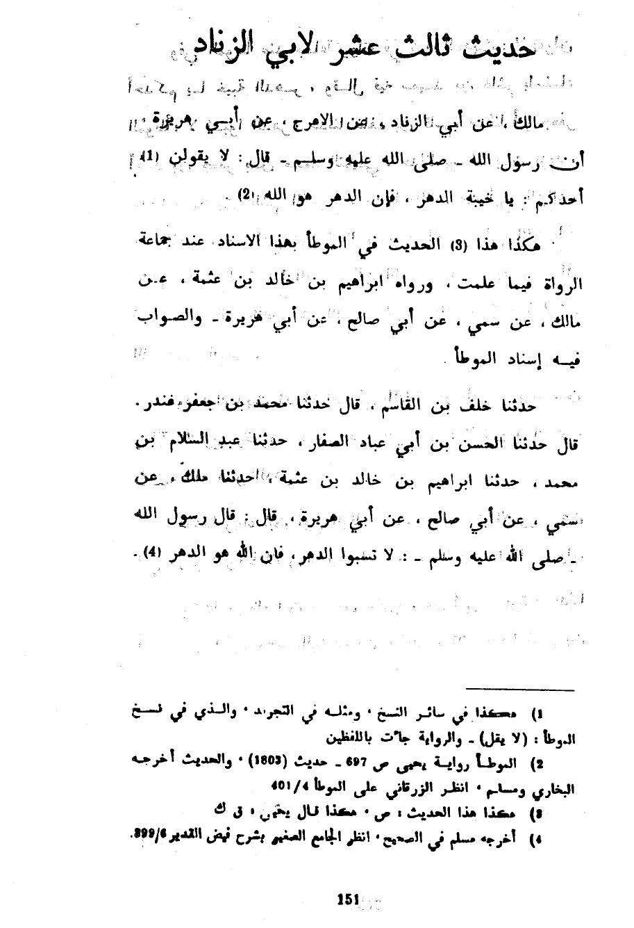 حَدِيثٌ ثَالِثَ عَشَرَ لِأَبِي الزِّنَادِ مَالِكٌ عَنْ أَبِي الزِّنَادِ عَنِ الْأَعْرَجِ عَنْ أَبِي هُرَيْرَةَ أَنَّ رَسُولَ اللَّهِ صَلَّى اللَّهُ عَلَيْهِ وسلم قَالَ لَا يَقُولَنَّ أَحَدُكُمْ يَا خَيْبَةَ الدَّهْرِ فَإِنَّ الدَّهْرَ هُوَ اللَّهُ هَكَذَا هَذَا الْحَدِيثُ فِي الْمُوَطَّأِ بِهَذَا الْإِسْنَادِ عِنْدَ جَمَاعَةِ الرُّوَاةِ فِيمَا عَلِمْتُ وَرَوَاهُ إِبْرَاهِيمُ بْنُ خَالِدِ بْنِ عَثْمَةَ عَنْ مَالِكٍ عَنْ سُمَيٍّ عَنْ أَبِي صَالِحٍ عَنْ أَبِي هُرَيْرَةَ وَالصَّوَابُ فِيهِ إِسْنَادُ الْمُوَطَّأِ حَدَّثَنَا خَلَفُ بْنُ الْقَاسِمِ قَالَ حَدَّثَنَا مُحَمَّدُ بْنُ جَعْفَرٍ غُنْدَرٌ قَالَ حَدَّثَنَا الْحَسَنُ بْنُ أَبِي عَبَّادٍ الصَّفَّارُ حَدَّثَنَا عَبْدُ السَّلَامِ بْنُ مُحَمَّدٍ حَدَّثَنَا إِبْرَاهِيمُ بْنُ خَالِدِ بْنِ عَثْمَةَ حَدَّثَنَا مَلِكٌ عَنْ سُمَيٍّ عَنْ أَبِي صَالِحٍ عَنْ أَبِي هُرَيْرَةَ قَالَ قَالَ رَسُولُ اللَّهِ صَلَّى اللَّهُ عَلَيْهِ وَسَلَّمَ لَا تَسُبُّوا الدَّهْرَ فَإِنَّ اللَّهَ هُوَ الدَّهْرُ