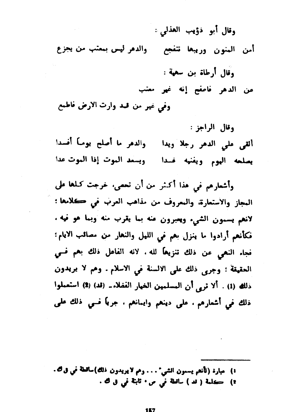 وَقَالَ أَبُو ذُؤَيْبٍ الْهُذَلِيُّ ... أَمِنَ الْمَنُونِ وَرَيْبِهَا تَتَفَجَّعُ ... وَالدَّهْرُ لَيْسَ بِمُعْتِبٍ مَنْ يَجْزَعُ ... وَقَالَ أَرْطَاةُ بْنُ سُهَيَّةَ ... عَنِ الدَّهْرِ فَاصْفَحْ إِنَّهُ غَيْرُ مُعْتَبِ ... وَفِي غَيْرِ مَنْ قَدْ وَارَتِ الأرض فاطمع ... وقال الراجز ... ألقى علي الجهر رِجْلًا وَيَدَا ... وَالدَّهْرُ مَا أَصْلَحَ يَوْمًا أَفْسَدَا ... ... يُصْلِحُهُ الْيَوْمَ وَيُفْنِيهِ غَدَا ... وَيُسْعِدُ الْمَوْتَ إِذَا الْمَوْتُ عَدَا ... وَأَشْعَارُهُمْ فِي هَذَا أَكْثَرُ مِنْ أَنْ تُحْصَى خَرَجَتْ كُلُّهَا عَلَى الْمَجَازِ وَالِاسْتِعَارَةِ وَالْمَعْرُوفِ مِنْ مَذَاهِبِ الْعَرَبِ فِي كَلَامِهَا لِأَنَّهُمْ يُسَمُّونَ الشَّيْءَ وَيُعَبِّرُونَ عَنْهُ بِمَا يَقْرُبُ مِنْهُ وَبِمَا هُوَ فِيهِ فَكَأَنَّهُمْ أَرَادُوا مَا يَنْزِلُ بِهِمْ فِي اللَّيْلِ وَالنَّهَارِ مِنْ مَصَائِبِ الْأَيَّامِ فَجَاءَ النَّهْيُ عَنْ ذَلِكَ تَنْزِيهًا لِلَّهِ لِأَنَّهُ الْفَاعِلُ ذَلِكَ بِهِمْ فِي الْحَقِيقَةِ وَجَرَى ذَلِكَ عَلَى الْأَلْسِنَةِ فِي الْإِسْلَامِ وَهُمْ لَا يُرِيدُونَ ذَلِكَ أَلَا تَرَى أَنَّ الْمُسْلِمِينَ الْخِيَارَ الْفُضَلَاءَ (قَدِ) اسْتَعْمَلُوا ذَلِكَ فِي أَشْعَارِهِمْ عَلَى دِينِهِمْ وَإِيمَانِهِمْ جَرْيًا فِي ذَلِكَ عَلَى