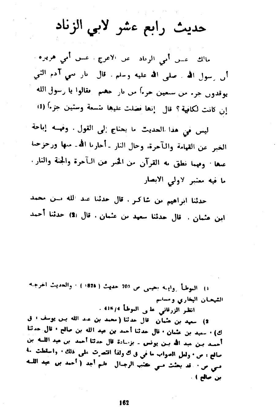 حَدِيثٌ رَابِعَ عَشَرَ لِأَبِي الزِّنَادِ مَالِكٌ عَنْ أَبِي الزِّنَادِ عَنِ الْأَعْرَجِ عَنْ أَبِي هُرَيْرَةَ أَنَّ رَسُولَ اللَّهِ صَلَّى اللَّهُ عَلَيْهِ وسلم قَالَ نَارُ بَنِي آدَمَ الَّتِي يُوقِدُونَ جُزْءٌ مِنْ سَبْعِينَ جُزْءًا مِنْ نَارِ جَهَنَّمَ فَقَالُوا يَا رَسُولَ اللَّهِ إِنْ كَانَتْ لَكَافِيَةً قَالَ إِنَّهَا فَضُلَتْ عَلَيْهَا بِتِسْعَةٍ وَسِتِّينَ جُزْءًا لَيْسَ فِي هَذَا الْحَدِيثِ مَا يَحْتَاجُ إِلَى الْقَوْلِ وَفِيهِ إِبَاحَةُ الْخَبَرِ عَنِ الْقِيَامَةِ وَالْآخِرَةِ وَحَالِ النَّارِ أَجَارَنَا اللَّهُ مِنْهَا وَزَحْزَحَنَا عَنْهَا وَفِيمَا نَطَقَ بِهِ الْقُرْآنُ مِنَ الْخَبَرِ عَنِ الْآخِرَةِ وَالْجَنَّةِ وَالنَّارِ مَا فِيهِ مُعْتَبَرٌ لِأُولِي الْأَبْصَارِ حَدَّثَنَا إِبْرَاهِيمُ بْنُ شَاكِرٍ قَالَ حَدَّثَنَا عَبْدُ اللَّهِ بْنُ مُحَمَّدِ بْنِ عُثْمَانَ قَالَ حَدَّثَنَا سَعِيدُ بن عثمان قال حدثنا أحمد