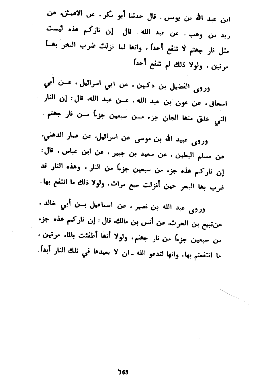 ابن عَبْدِ اللَّهِ بْنِ يُونُسَ قَالَ حَدَّثَنَا أَبُو بَكْرٍ عَنِ الْأَعْمَشِ عَنْ زَيْدِ بْنِ وَهْبٍ عَنْ عَبْدِ اللَّهِ قَالَ إِنَّ نَارَكُمْ هَذِهِ لَيْسَتْ مِثْلَ نَارِ جَهَنَّمَ لَا تَنْفَعُ أَحَدًا وَإِنَّهَا لَمَّا نَزَلَتْ ضُرِبَ الْبَحْرُ بِهَا مَرَّتَيْنِ وَلَوْلَا ذَلِكَ لَمْ تَنْفَعْ أَحَدًا وَرَوَى الْفُضَيْلُ! بْنُ دُكَيْنٍ عَنْ أَبِي إِسْرَائِيلَ عَنْ أَبِي إِسْحَاقَ عَنْ عَوْنِ بْنِ عَبْدِ اللَّهِ عَنْ عَبْدِ اللَّهِ قَالَ إِنَّ النَّارَ الَّتِي خُلِقَ مِنْهَا الْجَانُّ جُزْءٌ مِنْ سَبْعِينَ جُزْءًا مِنْ نَارِ جَهَنَّمَ وَرَوَى عُبَيْدُ اللَّهِ بْنُ مُوسَى بْنُ إِسْرَائِيلَ عَنْ عَمَّارٍ الدُّهْنِيِّ عَنْ مُسْلِمٍ الْبَطِينَ عَنْ سَعِيدِ بْنِ جُبَيْرٍ عَنِ ابْنِ عَبَّاسٍ قَالَ إِنَّ نَارَكُمْ هَذِهِ جُزْءٌ مِنْ سَبْعِينَ جُزْءًا مِنَ النَّارِ وَهَذِهِ النَّارُ قَدْ ضُرِبَ بِهَا الْبَحْرُ حِينَ أُنْزِلَتْ سَبْعَ مَرَّاتٍ وَلَوْلَا ذَلِكَ مَا انْتُفِعَ بِهَا وَرَوَى عَبْدُ اللَّهِ بْنُ نُصَيْرٍ عَنْ إِسْمَاعِيلَ بْنِ أَبِي خالد عن تبيع بن الحرث عَنْ أَنَسِ بْنِ مَالِكٍ قَالَ إِنَّ نَارَكُمْ هَذِهِ جُزْءٌ مِنْ سَبْعِينَ جُزْءًا مِنْ نَارِ جَهَنَّمَ وَلَوْلَا أَنَّهَا أُطْفِئَتْ بِالْمَاءِ مَرَّتَيْنِ مَا انْتَفَعْتُمْ بِهَا وَإِنَّهَا لَتَدْعُو اللَّهَ أَنْ لَا يُعِيدَهَا فِي تِلْكَ النَّارِ أَبَدًا