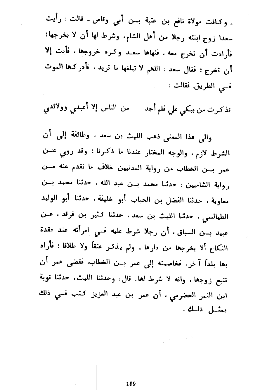 وَكَانَتْ مَوْلَاةَ نَافِعِ بْنِ عُتْبَةَ بْنِ أَبِي وَقَّاصٍ قَالَتْ رَأَيْتُ سَعْدًا زَوْجَ ابْنَتِهِ رَجُلًا مِنْ أَهْلِ الشَّامِ وَشَرَطَ لَهَا أَنْ لَا يُخْرِجَهَا فَأَرَادَتْ أَنْ تَخْرُجَ مَعَهُ فَنَهَاهَا سَعْدٌ وَكَرِهَ خُرُوجَهَا فَأَبَتْ إِلَّا أَنْ تَخْرُجَ فَقَالَ سَعْدٌ اللَّهُمَّ لَا تُبَلِّغْهَا مَا تُرِيدُ فَأَدْرَكَهَا الْمَوْتُ فِي الطَّرِيقِ فَقَالَتْ ... تَذَكَّرْتُ مَنْ يَبْكِي عَلَيَّ فَلَمْ أَجِدْ ... مِنَ النَّاسِ إِلَّا أَعْبُدِي وَوَلَائِدِي ... وَإِلَى هَذَا الْمَعْنَى ذَهَبَ اللَّيْثُ بْنُ سَعْدٍ وَطَائِفَةٌ إِلَى أَنَّ الشَّرْطَ لَازِمٌ وَالْوَجْهُ الْمُخْتَارُ عِنْدَنَا مَا ذَكَرْنَا وَقَدْ رُوِيَ عَنْ عُمَرَ بْنِ الْخَطَّابِ مِنْ رِوَايَةِ الْمَدَنِيِّينَ خِلَافَ مَا تَقَدَّمَ عَنْهُ مِنْ رِوَايَةِ الشَّامِيِّينَ حَدَّثَنَا مُحَمَّدُ بْنُ عَبْدِ اللَّهِ حَدَّثَنَا مُحَمَّدُ بْنُ مُعَاوِيَةَ حَدَّثَنَا الْفَضْلُ بْنُ الْحُبَابِ أَبُو خَلِيفَةَ حَدَّثَنَا أَبُو الْوَلِيدِ الطَّيَالِسِيُّ حَدَّثَنَا اللَّيْثُ بْنُ سعيد حَدَّثَنَا كَثِيرُ بْنُ فَرْقَدٍ عَنْ عُبَيْدِ بْنِ السَّبَّاقِ أَنَّ رَجُلًا شُرِطَ عَلَيْهِ فِي امْرَأَتِهِ عِنْدَ عُقْدَةِ النِّكَاحِ أَلَّا يُخْرِجَهَا مِنْ دَارِهَا وَلَمْ يَذْكُرْ عِتْقًا وَلَا طَلَاقًا فَأَرَادَ بِهَا بلدا آخر فخصامته إِلَى عُمَرَ بْنِ الْخَطَّابِ فَقَضَى عُمَرُ أَنْ تَتَّبِعَ زَوْجَهَا وَأَنَّهُ لَا شَرْطَ لَهَا قَالَ وَحَدَّثَنَا اللَّيْثُ حَدَّثَنَا تَوْبَةُ بْنُ النَّمِرِ الْحَضْرَمِيُّ أَنَّ عُمَرَ بْنَ عَبْدِ الْعَزِيزِ كَتَبَ فِي ذَلِكَ بِمِثْلِ ذَلِكَ