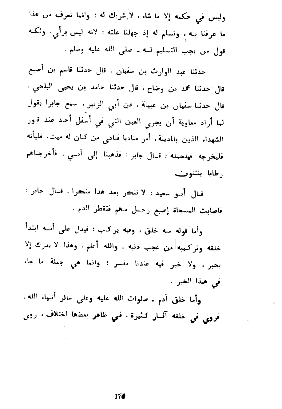 وَلَيْسَ فِي حُكْمِهِ إِلَّا مَا شَاءَ لَا شَرِيكَ لَهُ وَإِنَّمَا نَعْرِفُ مِنْ هَذَا مَا عَرَفْنَا بِهِ وَنُسَلِّمُ لَهُ إِذْ جَهِلْنَا عِلَّتَهُ لِأَنَّهُ لَيْسَ بِرَأْيٍ وَلَكِنَّهُ قَوْلُ مَنْ يَجِبُ التَّسْلِيمُ لَهُ صَلَّى اللَّهُ عَلَيْهِ وَسَلَّمَ حَدَّثَنَا عَبْدُ الْوَارِثِ بْنُ سُفْيَانَ قَالَ حَدَّثَنَا قَاسِمُ بْنُ أَصْبَغَ قَالَ حَدَّثَنَا مُحَمَّدُ بْنُ وَضَّاحٍ قَالَ حَدَّثَنَا حَامِدُ بْنُ يَحْيَى الْبَلْخِيُّ قَالَ حَدَّثَنَا سُفْيَانُ بْنُ عُيَيْنَةَ عَنْ أَبِي الزُّبَيْرِ سَمِعَ جَابِرًا يَقُولُ لَمَّا أَرَادَ مُعَاوِيَةُ أَنْ يُجْرِيَ الْعَيْنَ الَّتِي فِي أَسْفَلِ أُحُدٍ عِنْدَ قُبُورِ الشُّهَدَاءِ الَّذِينَ بِالْمَدِينَةِ أَمَرَ مُنَادِيًا فَنَادَى مَنْ كَانَ لَهُ مَيِّتٌ فَلْيَأْتِهِ فَلْيُخْرِجْهُ فَلْيَحْمِلْهُ قَالَ جَابِرٌ فَذَهَبْنَا إِلَى أَبِي فَأَخْرَجْنَاهُمْ رِطَابًا يَنْثَنُونَ قَالَ أَبُو سعيد لا ينكر بَعْدَ هَذَا مُنْكَرًا قَالَ جَابِرٌ فَأَصَابَتِ الْمِسْحَاةُ أَصْبُعَ رَجُلٍ مِنْهُمْ فَتَقَطَّرَ الدَّمُ وَأَمَّا قَوْلُهُ مِنْهُ خُلِقَ وَفِيهِ يُرَكَّبُ فَيَدُلُّ عَلَى أَنَّهُ ابْتُدِأَ خَلْقُهُ وَتَرْكِيبُهُ مِنْ عَجْبِ ذَنَبِهِ وَاللَّهُ أَعْلَمُ وَهَذَا لَا يُدْرَكُ إِلَّا بِخَبَرٍ وَلَا خَبَرَ فِيهِ عِنْدَنَا مُفَسَّرٌ وَإِنَّمَا هِيَ جُمْلَةُ مَا جَاءَ فِي هَذَا الْخَبَرِ وَأَمَّا خَلْقُ آدَمَ صَلَوَاتُ اللَّهِ عَلَيْهِ وَعَلَى سَائِرِ أَنْبِيَاءِ اللَّهِ فَرُوِيَ فِي خَلْقِهِ آثَارٌ كَثِيرَةٌ فِي ظَاهِرِ بَعْضِهَا اخْتِلَافٌ رَوَى