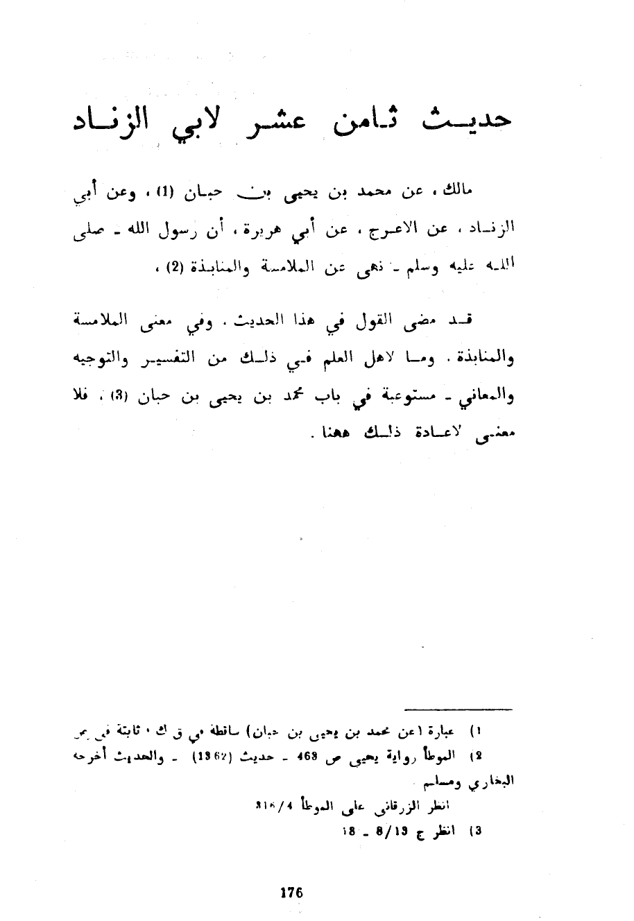 حَدِيثٌ ثَامِنَ عَشَرَ لِأَبِي الزِّنَادِ مَالِكٌ عَنْ مُحَمَّدِ بْنِ يَحْيَى بْنِ حِبَّانَ وَعَنْ أَبِي الزِّنَادِ عَنِ الْأَعْرَجِ عَنْ أَبِي هُرَيْرَةَ أَنَّ رَسُولَ اللَّهِ صَلَّى اللَّهُ عَلَيْهِ وَسَلَّمَ نَهَى عَنِ الْمُلَامَسَةِ وَالْمُنَابَذَةِ قَدْ مَضَى الْقَوْلُ فِي هَذَا الْحَدِيثِ وَفِي مَعْنَى الْمُلَامَسَةِ وَالْمُنَابَذَةِ وَمَا لِأَهْلِ الْعِلْمِ فِي ذَلِكَ مِنَ التَّفْسِيرِ وَالتَّوْجِيهِ وَالْمَعَانِي مُسْتَوْعَبَةً فِي بَابِ مُحَمَّدِ بْنِ يَحْيَى بْنِ حِبَّانَ فَلَا مَعْنَى لِإِعَادَةِ ذَلِكَ هَهُنَا