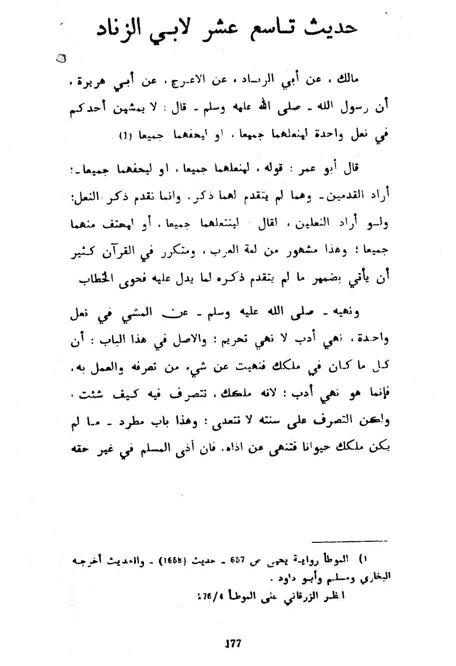 حَدِيثٌ تَاسِعَ عَشَرَ لِأَبِي الزِّنَادِ مَالِكٌ عَنْ أَبِي الزِّنَادِ عَنِ الْأَعْرَجِ عَنْ أَبِي هُرَيْرَةَ أَنَّ رَسُولَ اللَّهِ صَلَّى اللَّهُ عَلَيْهِ وَسَلَّمَ قَالَ لَا يَمْشِيَنَّ أَحَدُكُمْ فِي نَعْلٍ وَاحِدَةٍ لِيَنْعَلْهُمَا جَمِيعًا أَوْ لِيُحْفِهِمَا جَمِيعًا قَالَ أَبُو عُمَرَ قَوْلُهُ لِيَنْعَلْهُمَا جَمِيعًا أَوْ لِيُحْفِهِمَا جَمِيعًا أَرَادَ الْقَدَمَيْنِ وَهُمَا لَمْ يَتَقَدَّمْ لَهُمَا ذِكْرٌ وَإِنَّمَا تَقَدَّمَ ذِكْرُ النَّعْلِ وَلَوْ أَرَادَ النَّعْلَيْنِ لَقَالَ لِيَنْتَعِلْهُمَا جَمِيعًا أَوْ لِيَحْتَفِ مِنْهُمَا جَمِيعًا وَهَذَا مَشْهُورٌ مِنْ لُغَةِ الْعَرَبِ وَمُتَكَرِّرٌ فِي الْقُرْآنِ كَثِيرٌ أَنْ يَأْتِيَ بِضَمِيرِ مَا لَمْ يَتَقَدَّمْ ذِكْرُهُ لِمَا يَدُلُّ عَلَيْهِ فَحْوَى الْخِطَابِ وَنَهْيُهُ صَلَّى اللَّهُ عَلَيْهِ وَسَلَّمَ عَنِ الْمَشْيِ فِي نَعْلٍ وَاحِدَةٍ نَهْيُ أَدَبٍ لَا نَهْيُ تَحْرِيمٍ وَالْأَصْلُ فِي هَذَا الْبَابِ أَنَّ كُلَّ مَا كَانَ فِي مِلْكِكَ فَنُهِيتَ عَنْ شَيْءٍ مِنْ تَصَرُّفِهِ وَالْعَمَلِ بِهِ فَإِنَّمَا هُوَ نَهْيُ أَدَبٍ لِأَنَّهُ مِلْكُكَ تَتَصَرَّفُ فِيهِ كَيْفَ شِئْتَ وَلَكِنَّ التَّصَرُّفَ عَلَى سُنَّتِهِ لَا تَتَعَدَّى وَهَذَا بَابٌ مُطَّرِدٌ مَا لَمْ يَكُنْ مِلْكُكَ حَيَوَانًا فَتَنْهَى عَنْ أَذَاهُ فَإِنَّ أَذَى الْمُسْلِمِ فِي غير حقه
