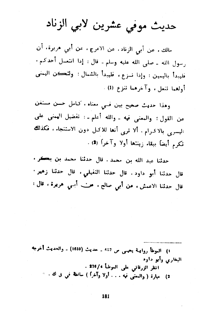 حَدِيثٌ مُوفِي عِشْرِينَ لِأَبِي الزِّنَادِ مَالِكٌ عَنْ أَبِي الزِّنَادِ عَنِ الْأَعْرَجِ عَنْ أَبِي هُرَيْرَةَ أَنَّ رَسُولَ اللَّهِ صَلَّى اللَّهُ عَلَيْهِ وسلم قَالَ إِذَا انْتَعَلَ أَحَدُكُمْ فَلْيَبْدَأْ بِالْيَمِينِ وَإِذَا نَزَعَ فَلْيَبْدَأْ بِالشِّمَالِ وَلْتَكُنِ الْيُمْنَى أَوَّلَهُمَا تُنْعَلُ وَآخِرَهُمَا تُنْزَعُ وَهَذَا حَدِيثٌ صَحِيحٌ بَيِّنٌ فِي مَعْنَاهُ كَامِلٌ حَسَنٌ مُسْتَغْنٍ عَنِ الْقَوْلِ وَالْمَعْنَى فِيهِ وَاللَّهُ أَعْلَمُ تَفْضِيلُ الْيُمْنَى عَلَى الْيُسْرَى بِالْإِكْرَامِ أَلَا تَرَى أَنَّهَا لِلْأَكْلِ دُونَ الِاسْتِنْجَاءِ فَكَذَلِكَ تُكْرَمُ أَيْضًا بِبَقَاءِ زِينَتِهَا أَوَّلًا وَآخِرًا حَدَّثَنَا عَبْدُ اللَّهِ بْنُ مُحَمَّدٍ قَالَ حَدَّثَنَا مُحَمَّدُ بْنُ بَكْرٍ قَالَ حَدَّثَنَا أَبُو دَاوُدَ قَالَ حَدَّثَنَا النُّفَيْلِيُّ قَالَ حَدَّثَنَا زُهَيْرٌ قَالَ حَدَّثَنَا الْأَعْمَشِ عَنْ أَبِي صَالِحٍ عَنْ أَبِي هُرَيْرَةَ قَالَ