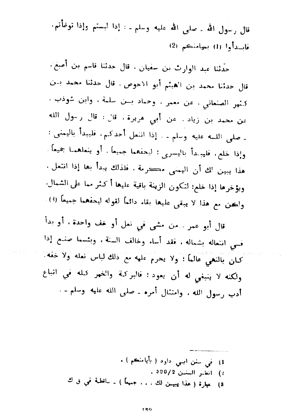 قَالَ رَسُولُ اللَّهِ صَلَّى اللَّهُ عَلَيْهِ وَسَلَّمَ إذا لبستم وإذا توضأتم فابدأوا بِمَيَامِنِكُمْ حَدَّثَنَا عَبْدُ الْوَارِثِ بْنُ سُفْيَانَ قَالَ حَدَّثَنَا قَاسِمُ بْنُ أَصْبَغَ قَالَ حَدَّثَنَا مُحَمَّدُ بْنُ الْهَيْثَمِ أَبُو الْأَحْوَصِ قَالَ حَدَّثَنَا مُحَمَّدُ بْنُ كَثِيرٍ الصَّنْعَانِيُّ عَنْ مَعْمَرٍ وَحَمَّادِ بْنِ سَلَمَةَ وَابْنِ شَوْذَبٍ عَنْ مُحَمَّدِ بْنِ زِيَادٍ عَنْ أَبِي هُرَيْرَةَ قَالَ قَالَ رَسُولُ اللَّهِ صَلَّى اللَّهُ عَلَيْهِ وَسَلَّمَ إِذَا انْتَعَلَ أَحَدُكُمْ فَلْيَبْدَأْ بِالْيُمْنَى وَإِذَا خَلَعَ فَلْيَبْدَأْ بِالْيُسْرَى لِيُحْفِهِمَا جَمِيعًا أَوْ يُنْعِلْهُمَا جَمِيعًا هَذَا يُبَيِّنُ لَكَ أَنَّ الْيُمْنَى مُكَرَّمَةٌ فَلِذَلِكَ يَبْدَأُ بِهَا إِذَا انْتَعَلَ وَيُؤَخِّرُهَا إِذَا خَلَعَ لِتَكُونَ الزِّينَةُ بَاقِيَةً عَلَيْهَا أَكْثَرَ مِمَّا عَلَى الشِّمَالِ وَلَكِنْ مَعَ هَذَا لَا يُبْقِي عَلَيْهَا بَقَاءً دَائِمًا لِقَوْلِهِ لِيُحْفِهِمَا جَمِيعًا قَالَ أَبُو عُمَرَ مَنْ مَشَى فِي نَعْلٍ أَوْ خُفٍّ وَاحِدَةٍ أَوْ بَدَأَ فِي انْتِعَالِهِ بِشِمَالِهِ فَقَدْ أَسَاءَ وَخَالَفَ السُّنَّةَ وَبِئْسَمَا صَنَعَ إِذَا كَانَ بِالنَّهْيِ عَالِمًا وَلَا يَحْرُمُ عَلَيْهِ مَعَ ذَلِكَ لِبَاسُ نَعْلِهِ وَلَا خُفِّهِ وَلَكِنَّهُ لَا يَنْبَغِي لَهُ أَنْ يَعُودَ فَالْبَرَكَةُ وَالْخَيْرُ كُلُّهُ فِي اتِّبَاعِ أَدَبِ رَسُولِ اللَّهِ وَامْتِثَالِ أَمْرِهِ صَلَّى اللَّهُ عَلَيْهِ وَسَلَّمَ