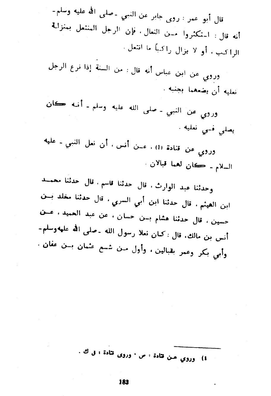 قَالَ أَبُو عُمَرَ رَوَى جَابِرٍ عَنِ النَّبِيِّ صَلَّى اللَّهُ عَلَيْهِ وَسَلَّمَ أَنَّهُ قَالَ اسْتَكْثِرُوا مِنَ النِّعَالِ فَإِنَّ الرَّجُلَ الْمُنْتَعِلَ بِمَنْزِلَةِ الرَّاكِبِ أَوْ لَا يَزَالُ رَاكِبًا مَا انْتَعَلَ وَرَوِيَ عَنِ ابْنِ عَبَّاسٍ أَنَّهُ قَالَ مَنْ السُّنَّةِ إِذَا نَزَعَ الرَّجُلُ نَعْلَيْهِ أَنْ يَضَعَهُمَا بِجَنْبِهِ وَرُوِيَ عَنِ النَّبِيِّ صَلَّى اللَّهُ عَلَيْهِ وَسَلَّمَ أَنَّهُ كَانَ يُصَلِّي فِي نَعْلَيْهِ وَرُوِيَ عَنْ قَتَادَةَ عَنْ أَنَسٍ أَنَّ نَعْلَ النَّبِيِّ عَلَيْهِ السَّلَامُ كَانَ لَهُمَا قِبَالَانِ وَحَدَّثَنَا عَبْدُ الْوَارِثِ قَالَ حَدَّثَنَا قَاسِمٌ قَالَ حَدَّثَنَا مُحَمَّدُ بْنُ الْهَيْثَمِ قَالَ حَدَّثَنَا ابْنُ أَبِي السَّرِيِّ قَالَ حَدَّثَنَا مَخْلَدُ بْنُ حُسَيْنٍ قَالَ حَدَّثَنَا هِشَامُ بْنُ حَسَّانٍ عَنْ عَبْدِ الْحَمِيدِ عَنْ أَنَسِ بْنِ مَالِكٍ قَالَ كَانَ نَعْلَا رَسُولِ اللَّهِ صَلَّى اللَّهُ عَلَيْهِ وَسَلَّمَ وَأَبِي بَكْرٍ وَعُمَرَ بِقِبَالَيْنِ وَأَوَّلُ مَنْ شَسَعَ عُثْمَانُ بْنُ عَفَّانَ