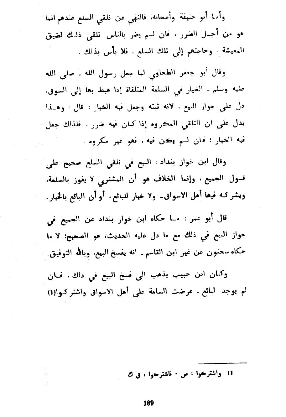 وَأَمَّا أَبُو حَنِيفَةَ وَأَصْحَابُهُ فَالنَّهْيُ عَنْ تَلَقِّي السِّلَعِ عِنْدَهُمْ إِنَّمَا هُوَ مِنْ أَجْلِ الضَّرَرِ فَإِنْ لَمْ يَضُرَّ بِالنَّاسِ تَلَقِّي ذَلِكَ لِضِيقِ الْمَعِيشَةِ وَحَاجَتِهِمْ إِلَى تِلْكَ السِّلَعِ فَلَا بَأْسَ بِذَلِكَ وَقَالَ أَبُو جَعْفَرٍ الطَّحَاوِيُّ لَمَّا جَعَلَ رَسُولُ اللَّهِ صَلَّى اللَّهُ عَلَيْهِ وَسَلَّمَ الْخِيَارَ فِي السِّلْعَةِ الْمُتَلَقَّاةِ إِذَا هَبَطَ بِهَا إِلَى السُّوقِ دَلَّ عَلَى جَوَازِ الْبَيْعِ لِأَنَّهُ ثَبَّتَهُ وَجَعَلَ فِيهِ الْخِيَارَ قَالَ وَهَذَا يَدُلُّ عَلَى أَنَّ التَّلَقِّيَ الْمَكْرُوهَ إِذَا كَانَ فِيهِ ضَرَرٌ فَلِذَلِكَ جُعِلَ فِيهِ الْخِيَارُ فَإِنْ لَمْ يَكُنْ فِيهِ فَهُوَ غَيْرُ مَكْرُوهٍ وَقَالَ ابْنُ خُوَازِ بنداد الْبَيْعُ فِي تَلَقِّي السِّلَعِ صَحِيحٌ عَلَى قَوْلِ الْجَمِيعِ وَإِنَّمَا الْخِلَافُ هُوَ أَنَّ الْمُشْتَرِيَ لَا يَفُوزُ بِالسِّلْعَةِ وَيَشْرَكُهُ فِيهَا أَهْلُ الْأَسْوَاقِ وَلَا خِيَارَ لِلْبَائِعِ أَوْ أَنَّ الْبَائِعَ بِالْخِيَارِ قَالَ أبو عمر ما حكاه ابن خواز بنداد عَنِ الْجَمِيعِ فِي جَوَازِ الْبَيْعِ فِي ذَلِكَ مَعَ مَا دَلَّ عَلَيْهِ الْحَدِيثُ هُوَ الصَّحِيحُ لَا مَا حَكَاهُ سَحْنُونٌ عَنْ غَيْرِ ابْنِ الْقَاسِمِ أَنَّهُ يُفْسَخُ الْبَيْعُ وَبِاللَّهِ التَّوْفِيقُ وَكَانَ ابْنُ حَبِيبٍ يَذْهَبُ إِلَى فَسْخِ الْبَيْعِ فِي ذَلِكَ فَإِنْ لَمْ يُوجَدِ الْبَائِعُ عُرِضَتِ السِّلْعَةُ علىأهل الأسواق واشتركوا