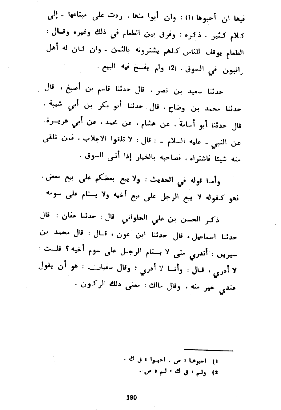 فِيهَا إِنْ أَحَبُّوهَا وَإِنْ أَبَوْا مِنْهَا رُدَّتْ عَلَى مُبْتَاعِهَا إِلَى كَلَامٍ كَثِيرٍ ذَكَرَهُ وَفَرَّقَ بَيْنَ الطَّعَامِ فِي ذَلِكَ وَغَيْرِهِ وَقَالَ الطَّعَامُ يُوقَفُ لِلنَّاسِ كُلِّهِمْ يَشْتَرُونَهُ بِالثَّمَنِ وَإِنْ كَانَ لَهُ أَهْلٌ رَاتِبُونَ فِي السُّوقِ وَلَمْ يُفْسَخْ فِيهِ الْبَيْعُ حَدَّثَنَا سَعِيدُ بْنُ نَصْرٍ قَالَ حَدَّثَنَا قَاسِمُ بْنُ أَصْبَغَ قَالَ حَدَّثَنَا مُحَمَّدُ بْنُ وَضَّاحٍ قال حدثنا بو بَكْرِ بْنُ أَبِي شَيْبَةَ قَالَ حَدَّثَنَا أَبُو أُسَامَةَ عَنْ هِشَامٍ عَنْ مُحَمَّدٍ عَنْ أَبِي هُرَيْرَةَ عَنِ النَّبِيِّ عَلَيْهِ السَّلَامُ قَالَ لَا تَلَقَّوُا الْأَجْلَابَ فَمَنْ تَلَقَّى مِنْهُ شَيْئًا فَاشْتَرَاهُ فَصَاحِبُهُ بِالْخِيَارِ إِذَا أَتَى السُّوقَ وَأَمَّا قَوْلُهُ في الحديث لا يَبِعْ بَعْضُكُمْ عَلَى بَيْعِ بَعْضٍ فَهُوَ كَقَوْلِهِ لَا يَبِعِ الرَّجُلُ عَلَى بَيْعِ أَخِيهِ وَلَا يَسْتَامُ عَلَى سَوْمِهِ ذَكَرُ الْحَسَنُ بْنُ عَلِيٍّ الْحُلْوَانِيُّ قَالَ حَدَّثَنَا عَفَّانُ قَالَ حَدَّثَنَا إِسْمَاعِيلُ قَالَ حَدَّثَنَا ابْنِ عَوْنٍ قَالَ قَالَ مُحَمَّدُ بْنُ سِيرِينَ أَتَدْرِي مَتَى لَا يَسْتَامُ الرَّجُلُ عَلَى سَوْمِ أَخِيهِ قُلْتُ لَا أَدْرِي قَالَ وَأَنَا لَا أَدْرِي وَقَالَ سُفْيَانُ هُوَ أَنْ يَقُولَ عِنْدِي خَيْرٌ مِنْهُ وَقَالَ مَالِكٌ مَعْنَى ذلك الركون