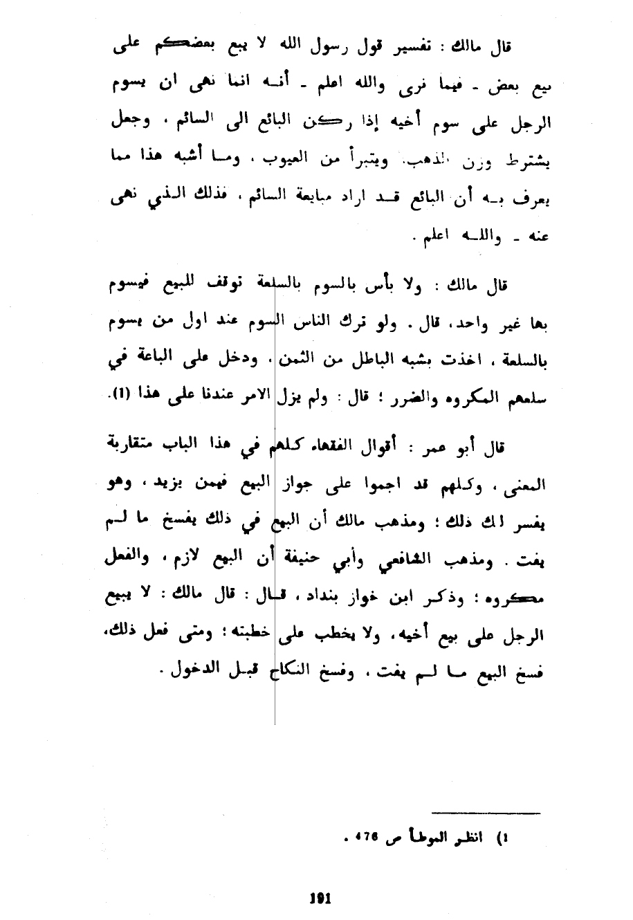 قَالَ مَالِكٌ تَفْسِيرُ قَوْلِ رَسُولِ اللَّهِ لَا يَبِعْ بَعْضُكُمْ عَلَى بَيْعِ بَعْضٍ فِيمَا نَرَى وَاللَّهُ أَعْلَمُ أَنَّهُ إِنَّمَا نَهَى أَنْ يَسُومَ الرَّجُلُ عَلَى سَوْمِ أَخِيهِ إِذَا رَكَنَ الْبَائِعُ إِلَى السَّائِمِ وَجَعَلَ يَشْتَرِطُ وَزْنَ الذَّهَبِ وَيَتَبَرَّأُ مِنَ الْعُيُوبِ وَمَا أَشْبَهَ هَذَا مِمَّا يُعْرَفُ بِهِ أَنَّ الْبَائِعَ قَدْ أَرَادَ مُبَايَعَةَ السَّائِمِ فَذَلِكَ الَّذِي نَهَى عَنْهُ وَاللَّهُ أَعْلَمُ قَالَ مَالِكٌ وَلَا بَأْسَ بِالسَّوْمِ بِالسِّلْعَةِ تُوقَفُ لِلْبَيْعِ فَيَسُومُ بِهَا غَيْرُ وَاحِدٍ قَالَ وَلَوْ تَرَكَ النَّاسُ السَّوْمَ عِنْدَ أَوَّلِ مَنْ يَسُومُ بِالسِّلْعَةِ أُخِذَتْ بِشِبْهِ الْبَاطِلِ مِنَ الثَّمَنِ وَدَخَلَ عَلَى الْبَاعَةِ فِي سِلَعِهِمُ الْمَكْرُوهُ وَالضَّرَرُ قَالَ وَلَمْ يَزَلِ الْأَمْرُ عِنْدَنَا عَلَى هَذَا قَالَ أَبُو عُمَرَ أَقْوَالُ الْفُقَهَاءِ كُلُّهُمْ فِي هَذَا الْبَابِ مُتَقَارِبَةُ الْمَعْنَى وَكُلُّهُمْ قَدْ أَجْمَعُوا عَلَى جَوَازِ الْبَيْعِ فِيمَنْ يَزِيدُ وَهُوَ يُفَسِّرُ لَكَ ذَلِكَ وَمَذْهَبُ مَالِكٍ أَنَّ الْبَيْعَ فِي ذَلِكَ يُفْسَخُ مَا لَمْ يَفُتْ وَمَذْهَبُ الشَّافِعِيِّ وَأَبِي حَنِيفَةَ أَنَّ الْبَيْعَ لَازِمٌ وَالْفِعْلَ مَكْرُوهٌ وَذَكَرَ ابْنُ خَوَازِ بَنْدَادَ قَالَ قَالَ مَالِكٌ لَا يَبِيعُ الرَّجُلُ عَلَى بَيْعِ أَخِيهِ وَلَا يَخْطُبُ عَلَى خِطْبَتِهِ وَمَتَى فَعَلَ ذَلِكَ فُسِخَ الْبَيْعُ مَا لَمْ يَفُتْ وَفُسِخَ النِّكَاحُ قَبْلَ الدُّخُولِ
