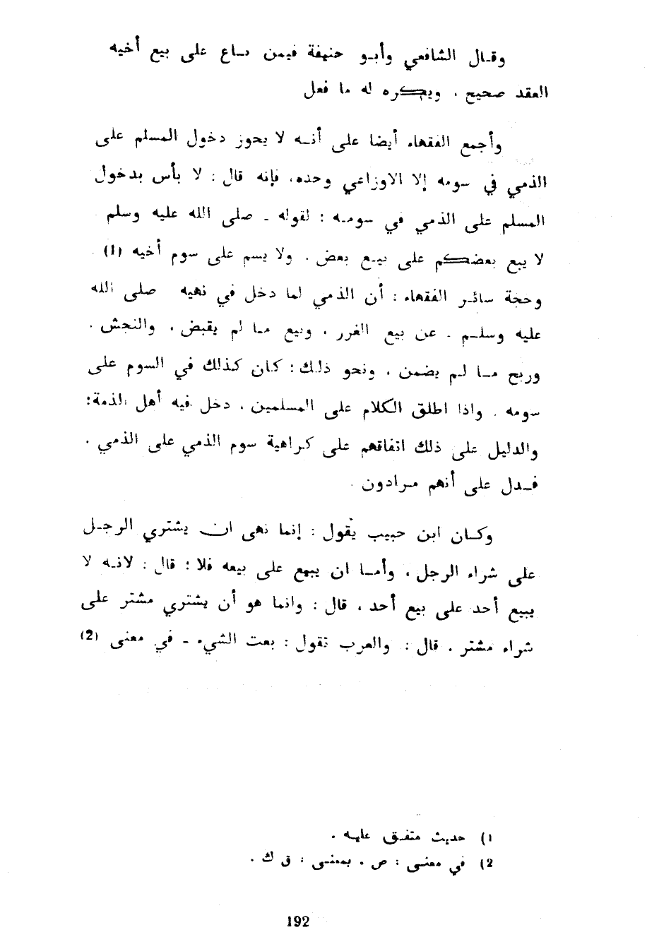 وَقَالَ الشَّافِعِيُّ وَأَبُو حَنِيفَةَ فِيمَنْ بَاعَ عَلَى بَيْعِ أَخِيهِ الْعَقْدُ صَحِيحٌ وَيُكْرَهُ لَهُ مَا فَعَلَ وَأَجْمَعَ الْفُقَهَاءُ أَيْضًا عَلَى أَنَّهُ لَا يَجُوزُ دُخُولُ الْمُسْلِمِ عَلَى الذِّمِّيِّ فِي سَوْمِهِ إِلَّا الْأَوْزَاعِيُّ وَحْدَهُ فَإِنَّهُ قَالَ لَا بَأْسَ بِدُخُولِ الْمُسْلِمِ عَلَى الذِّمِّيِّ فِي سَوْمِهِ لِقَوْلِهِ صَلَّى اللَّهُ عَلَيْهِ وَسَلَّمَ لَا يَبِعْ بَعْضُكُمْ عَلَى بَيْعِ بَعْضٍ وَلَا يَسُمْ عَلَى سَوْمِ أَخِيهِ وَحُجَّةُ سَائِرِ الْفُقَهَاءِ أَنَّ الذِّمِّيَّ لَمَّا دَخَلَ فِي نَهْيِهِ صَلَّى اللَّهُ عَلَيْهِ وَسَلَّمَ عَنْ بَيْعِ الْغَرَرِ وَبَيْعِ مَا لَمْ يُقْبَضْ وَالنَّجْشِ وَرِبْحِ مَا لَمْ يُضَمَّنْ وَنَحْوِ ذَلِكَ كَانَ كَذَلِكَ فِي السَّوْمِ عَلَى سَوْمِهِ وَإِذَا أَطْلَقَ الْكَلَامَ عَلَى الْمُسْلِمِينَ دَخَلَ فِيهِ أَهْلُ الذِّمَّةِ وَالدَّلِيلُ عَلَى ذَلِكَ اتِّفَاقُهُمْ عَلَى كَرَاهِيَةِ سَوْمِ الذِّمِّيِّ عَلَى الذِّمِّيِّ فَدَلَّ عَلَى أَنَّهُمْ مُرَادُونَ وَكَانَ ابْنُ حَبِيبٍ يَقُولُ إِنَّمَا نُهِيَ أَنْ يَشْتَرِيَ الرَّجُلُ عَلَى شِرَاءِ الرَّجُلِ وَأَمَّا أَنْ يَبِيعَ عَلَى بَيْعِهِ فَلَا قَالَ لِأَنَّهُ لَا يَبِيعُ أَحَدٌ عَلَى بَيْعِ أَحَدٍ قَالَ وَإِنَّمَا هُوَ أَنْ يَشْتَرِيَ مُشْتَرٍ عَلَى شِرَاءِ مُشْتَرٍ قَالَ وَالْعَرَبُ تَقُولُ بِعْتُ الشَّيْءَ فِي معنى