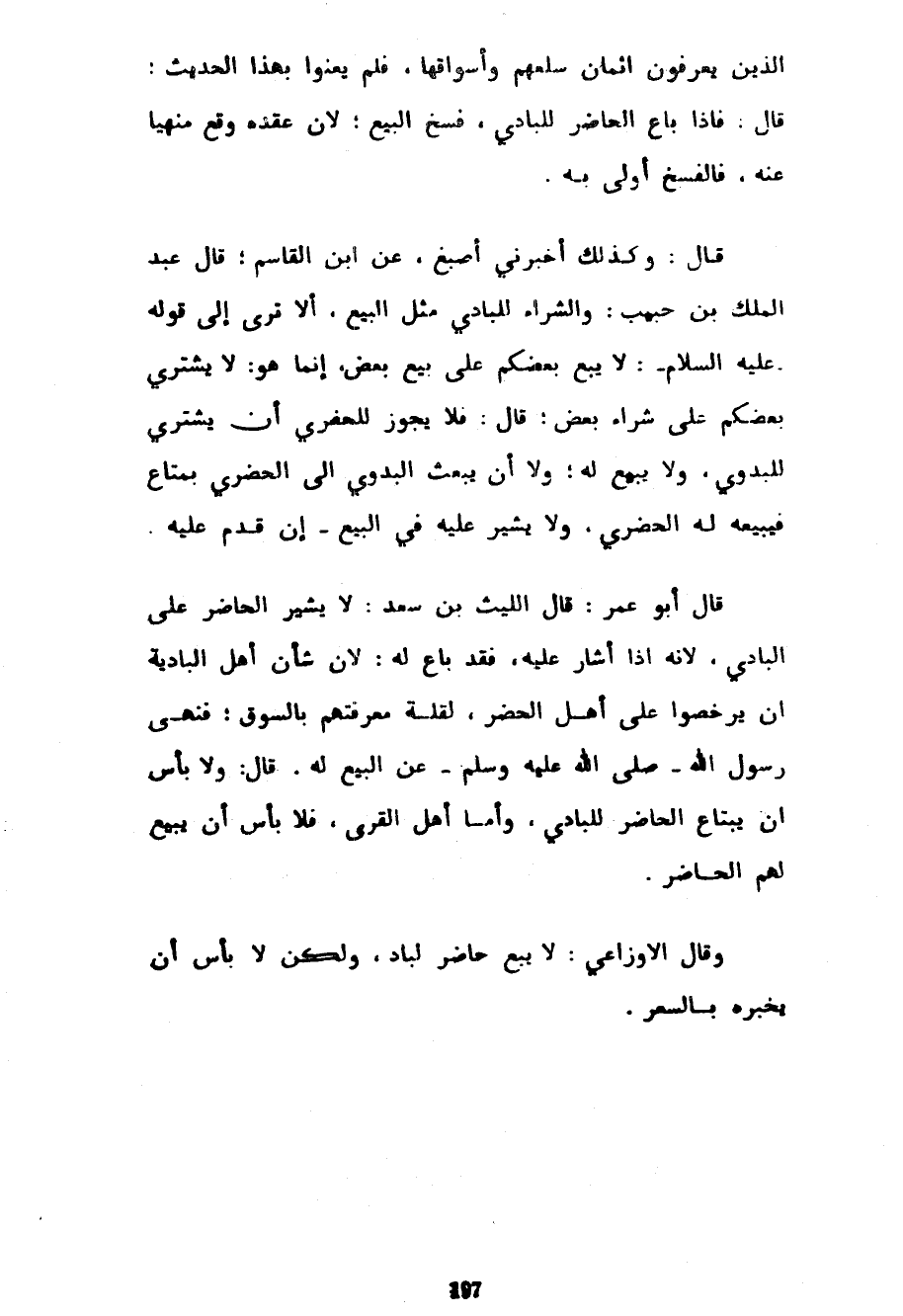 الَّذِينَ يَعْرِفُونَ أَثْمَانَ سِلَعِهِمْ وَأَسْوَاقَهَا فَلَمْ يُعْنُوا بِهَذَا الْحَدِيثِ قَالَ فَإِذَا بَاعَ الْحَاضِرُ لِلْبَادِي فُسِخَ الْبَيْعُ لِأَنَّ عَقْدَهُ وَقَعَ مَنْهِيًّا عَنْهُ فَالْفَسْخُ أَوْلَى بِهِ قَالَ وَكَذَلِكَ أَخْبَرَنِي أَصْبَغُ عَنِ ابْنِ الْقَاسِمِ قَالَ عَبْدُ الْمَلِكِ بْنُ حَبِيبٍ وَالشِّرَاءُ لِلْبَادِي مِثْلَ الْبَيْعِ أَلَا تَرَى إِلَى قَوْلِهِ عَلَيْهِ السَّلَامُ لَا يَبِعْ بَعْضُكُمْ عَلَى بَيْعِ بَعْضٍ إِنَّمَا هُوَ لَا يَشْتَرِي بَعْضُكُمْ عَلَى شِرَاءِ بَعْضٍ قَالَ فَلَا يَجُوزُ لِلْحَضَرِيِّ أَنْ يَشْتَرِيَ لِلْبَدَوِيِّ وَلَا يَبِيعَ لَهُ وَلَا أَنْ يَبْعَثَ الْبَدَوِيُّ إِلَى الْحَضَرِيِّ بِمَتَاعٍ فَيَبِيعُهُ لَهُ الْحَضَرِيُّ وَلَا يُشِيرُ عَلَيْهِ فِي الْبَيْعِ إِنْ قَدِمَ عَلَيْهِ قَالَ أَبُو عُمَرَ قَالَ اللَّيْثُ بْنُ سَعْدٍ لَا يُشِيرُ الْحَاضِرُ عَلَى الْبَادِي لِأَنَّهُ إِذَا أَشَارَ عَلَيْهِ فَقَدْ بَاعَ لَهُ لِأَنَّ شَأْنَ أَهْلِ الْبَادِيَةِ أَنْ يُرَخِّصُوا عَلَى أَهْلِ الْحَضَرِ لِقِلَّةِ مَعْرِفَتِهِمْ بِالسُّوقِ فَنَهَى رَسُولُ اللَّهِ صَلَّى اللَّهُ عَلَيْهِ وَسَلَّمَ عَنِ الْبَيْعِ لَهُ قَالَ وَلَا بَأْسَ أَنْ يَبْتَاعَ الْحَاضِرُ لِلْبَادِي وَأَمَّا أَهْلُ الْقُرَى فَلَا بَأْسَ أَنْ يَبِيعَ لَهُمُ الْحَاضِرُ وَقَالَ الْأَوْزَاعِيُّ لَا يَبِعْ حَاضِرٌ لِبَادٍ وَلَكِنْ لَا بَأْسَ أَنْ يُخْبِرَهُ بِالسِّعْرِ
