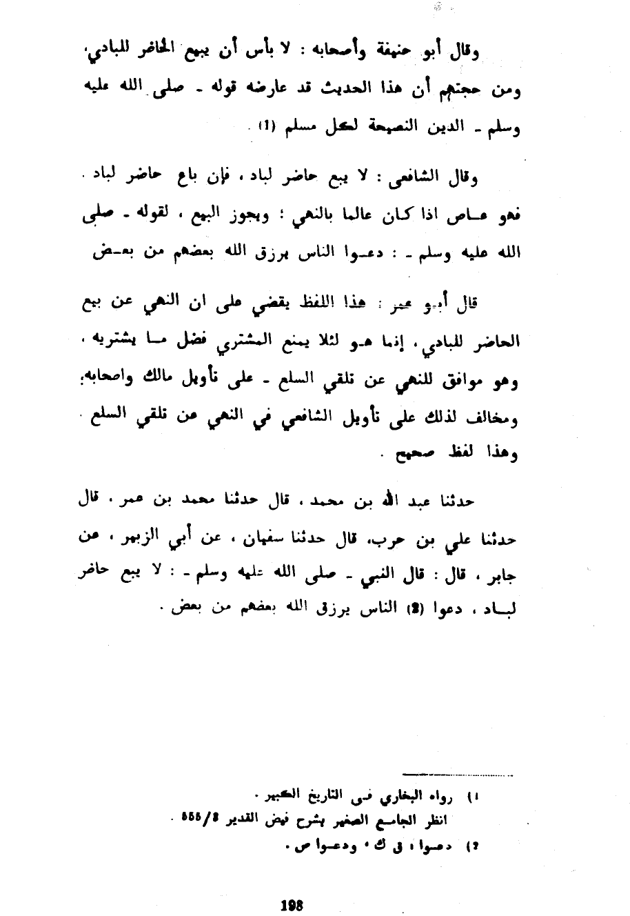 وَقَالَ أَبُو حَنِيفَةَ وَأَصْحَابُهُ لَا بَأْسَ أَنْ يَبِيعَ الْحَاضِرُ لِلْبَادِي وَمِنْ حُجَّتِهِمْ أَنَّ هَذَا الْحَدِيثَ قَدْ عَارَضَهُ قَوْلُهُ صَلَّى اللَّهُ عَلَيْهِ وَسَلَّمَ الدِّينُ النَّصِيحَةُ لِكُلِّ مُسْلِمٍ وَقَالَ الشَّافِعِيُّ لَا يَبِعْ حَاضِرٌ لِبَادٍ فَإِنْ بَاعَ حَاضِرٌ لِبَادٍ فَهُوَ عَاصٍ إِذَا كَانَ عَالِمًا بِالنَّهْيِ وَيَجُوزُ الْبَيْعُ لِقَوْلِهِ صَلَّى اللَّهُ عَلَيْهِ وَسَلَّمَ دَعُوا النَّاسَ يَرْزُقُ الله بعضهم من بعض قال أبوعمر هَذَا اللَّفْظُ يَقْضِي عَلَى أَنَّ النَّهْيَ عَنْ بَيْعِ الْحَاضِرِ لِلْبَادِي إِنَّمَا هُوَ لِئَلَّا يَمْنَعَ الْمُشْتَرِيَ فَضْلَ مَا يَشْتَرِيهِ وَهُوَ مُوَافِقٌ لِلنَّهْيِ عَنْ تَلَقِّي السِّلَعِ عَلَى تَأْوِيلِ مَالِكٍ وَأَصْحَابِهِ وَمُخَالِفٌ لِذَلِكَ عَلَى تَأْوِيلِ الشَّافِعِيِّ فِي النَّهْيِ عَنْ تَلَقِّي السِّلَعِ وَهَذَا لَفْظٌ صَحِيحٌ حَدَّثَنَا عَبْدُ اللَّهِ بْنُ مُحَمَّدٍ قَالَ حَدَّثَنَا محمد بْنِ عُمَرَ قَالَ حَدَّثَنَا عَلِيُّ بْنُ حَرْبٍ قَالَ حَدَّثَنَا سُفْيَانُ عَنْ أَبِي الزُّبَيْرِ عَنْ جَابِرٍ قَالَ قَالَ النَّبِيُّ صَلَّى اللَّهُ عَلَيْهِ وَسَلَّمَ لَا يَبِعْ حَاضِرٌ لِبَادٍ دَعُوا النَّاسَ يَرْزُقُ اللَّهُ بَعْضَهُمْ مِنْ بَعْضٍ