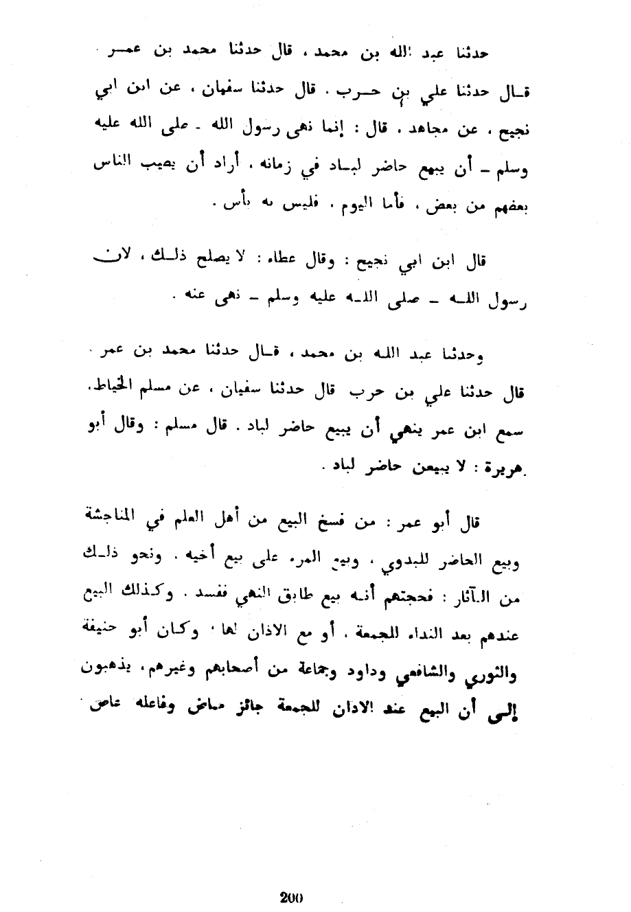 حَدَّثَنَا عَبْدُ اللَّهِ بْنُ مُحَمَّدٍ قَالَ حَدَّثَنَا مُحَمَّدُ بْنِ عُمَرَ قَالَ حَدَّثَنَا عَلِيُّ بْنُ حَرْبٍ قَالَ حَدَّثَنَا سُفْيَانُ عَنِ ابْنِ أَبِي نَجِيحٍ عَنْ مُجَاهِدٍ قَالَ إِنَّمَا نَهَى رَسُولُ اللَّهِ صَلَّى اللَّهُ عَلَيْهِ وَسَلَّمَ أَنْ يَبِيعَ حَاضِرٌ لِبَادٍ فِي زَمَانِهِ أَرَادَ أَنْ يُصِيبَ النَّاسُ بَعْضُهُمْ مِنْ بَعْضٍ فَأَمَّا الْيَوْمَ فَلَيْسَ بِهِ بَأْسٌ قَالَ ابْنُ أَبِي نَجِيحٍ وَقَالَ عَطَاءٌ لَا يَصْلُحُ ذَلِكَ لِأَنَّ رَسُولَ اللَّهِ صَلَّى اللَّهُ عَلَيْهِ وَسَلَّمَ نَهَى عَنْهُ وَحَدَّثَنَا عَبْدُ اللَّهِ بْنُ مُحَمَّدٍ حَدَّثَنَا مُحَمَّدُ بْنِ عُمَرَ قَالَ حَدَّثَنَا عَلِيُّ بْنُ حَرْبٍ قَالَ حَدَّثَنَا سُفْيَانُ عَنْ مُسْلِمٍ الْخَيَّاطِ سَمِعَ ابْنَ عُمَرَ يَنْهَى أَنْ يَبِيعَ حَاضِرٌ لِبَادٍ قَالَ مُسْلِمٌ وَقَالَ أَبُو هُرَيْرَةَ لَا يَبِيعَنَّ حَاضِرٌ لِبَادٍ قَالَ أَبُو عُمَرَ مَنْ فَسَخَ الْبَيْعَ من أهل لعلم فِي الْمُنَاجَشَةِ وَبَيْعِ الْحَاضِرِ لِلْبَدَوِيِّ وَبَيْعِ الْمَرْءِ عَلَى بَيْعِ أَخِيهِ وَنَحْوِ ذَلِكَ مِنَ الْآثَارِ فَحُجَّتُهُمْ أَنَّهُ بَيْعٌ طَابَقَ النَّهْيَ فَفَسَدَ وَكَذَلِكَ الْبَيْعُ عِنْدَهُمْ بَعْدَ النِّدَاءِ لِلْجُمُعَةِ أَوْ مَعَ الْأَذَانِ لَهَا وَكَانَ أَبُو حَنِيفَةَ وَالثَّوْرِيُّ وَالشَّافِعِيُّ وَدَاوُدُ وَجَمَاعَةٌ مِنْ أَصْحَابِهِمْ وَغَيْرُهُمْ يَذْهَبُونَ إِلَى أَنَّ الْبَيْعَ عِنْدَ الْأَذَانِ لِلْجُمُعَةِ جَائِزٌ مَاضٍ وفاعله عاص