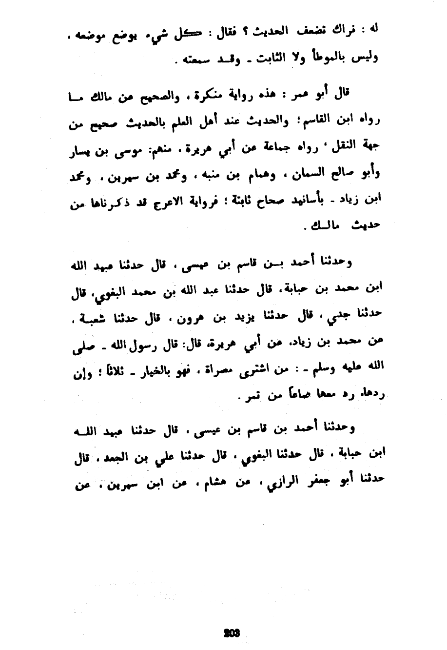 لَهُ نَرَاكَ تُضْعِفُ الْحَدِيثَ فَقَالَ كُلُّ شَيْءٍ يُوضَعُ مَوْضِعَهُ وَلَيْسَ بِالْمُوَطَّأِ وَلَا الثَّابِتِ وَقَدْ سَمِعْتُهُ قَالَ أَبُو عُمَرَ هَذِهِ رِوَايَةٌ مُنْكَرَةٌ وَالصَّحِيحُ عَنْ مَالِكٍ مَا رَوَاهُ ابْنُ الْقَاسِمِ وَالْحَدِيثُ عِنْدَ أَهْلِ الْعِلْمِ بِالْحَدِيثِ صَحِيحٌ مِنْ جِهَةِ النَّقْلِ رَوَاهُ جَمَاعَةٌ عَنْ أَبِي هُرَيْرَةَ مِنْهُمْ مُوسَى بْنُ يَسَارٍ وَأَبُو صَالِحٍ السَّمَّانُ وَهَمَّامُ بْنُ مُنَبِّهٍ وَمُحَمَّدُ بْنُ سِيرِينَ وَمُحَمَّدُ بْنُ زِيَادٍ بِأَسَانِيدَ صِحَاحٍ ثَابِتَةٍ فَرِوَايَةُ الْأَعْرَجِ قَدْ ذَكَرْنَاهَا مِنْ حَدِيثِ مَالِكٍ وَحَدَّثَنَا أَحْمَدُ بْنُ قَاسِمِ بْنِ عِيسَى قَالَ حَدَّثَنَا عُبَيْدُ الله بن حمد بْنِ حَبَابَةَ قَالَ حَدَّثَنَا عَبْدُ اللَّهِ بْنُ مُحَمَّدٍ الْبَغَوِيُّ قَالَ حَدَّثَنَا جَدِّي قَالَ حَدَّثَنَا يَزِيدُ بْنُ هَارُونَ قَالَ حَدَّثَنَا شُعْبَةُ عَنْ مُحَمَّدِ بْنِ زِيَادٍ عَنْ أَبِي هُرَيْرَةَ قَالَ قَالَ رَسُولُ اللَّهِ صَلَّى اللَّهُ عَلَيْهِ وَسَلَّمَ مَنِ اشْتَرَى مُصَرَّاةً فَهُوَ بِالْخِيَارِ ثَلَاثًا وَإِنْ رَدَّهَا رَدَّ مَعَهَا صَاعًا مِنْ تَمْرٍ وَحَدَّثَنَا أَحْمَدُ بْنُ قَاسِمِ بْنِ عِيسَى قَالَ حَدَّثَنَا عُبَيْدُ اللَّهِ بْنِ حُبَابَةَ قَالَ حَدَّثَنَا الْبَغَوِيُّ قَالَ حَدَّثَنَا عَلِيُّ بْنُ الْجَعْدِ قَالَ حَدَّثَنَا أَبُو جَعْفَرٍ الرَّازِيُّ عَنْ هِشَامٍ عَنِ ابْنِ سِيرِينَ عَنْ