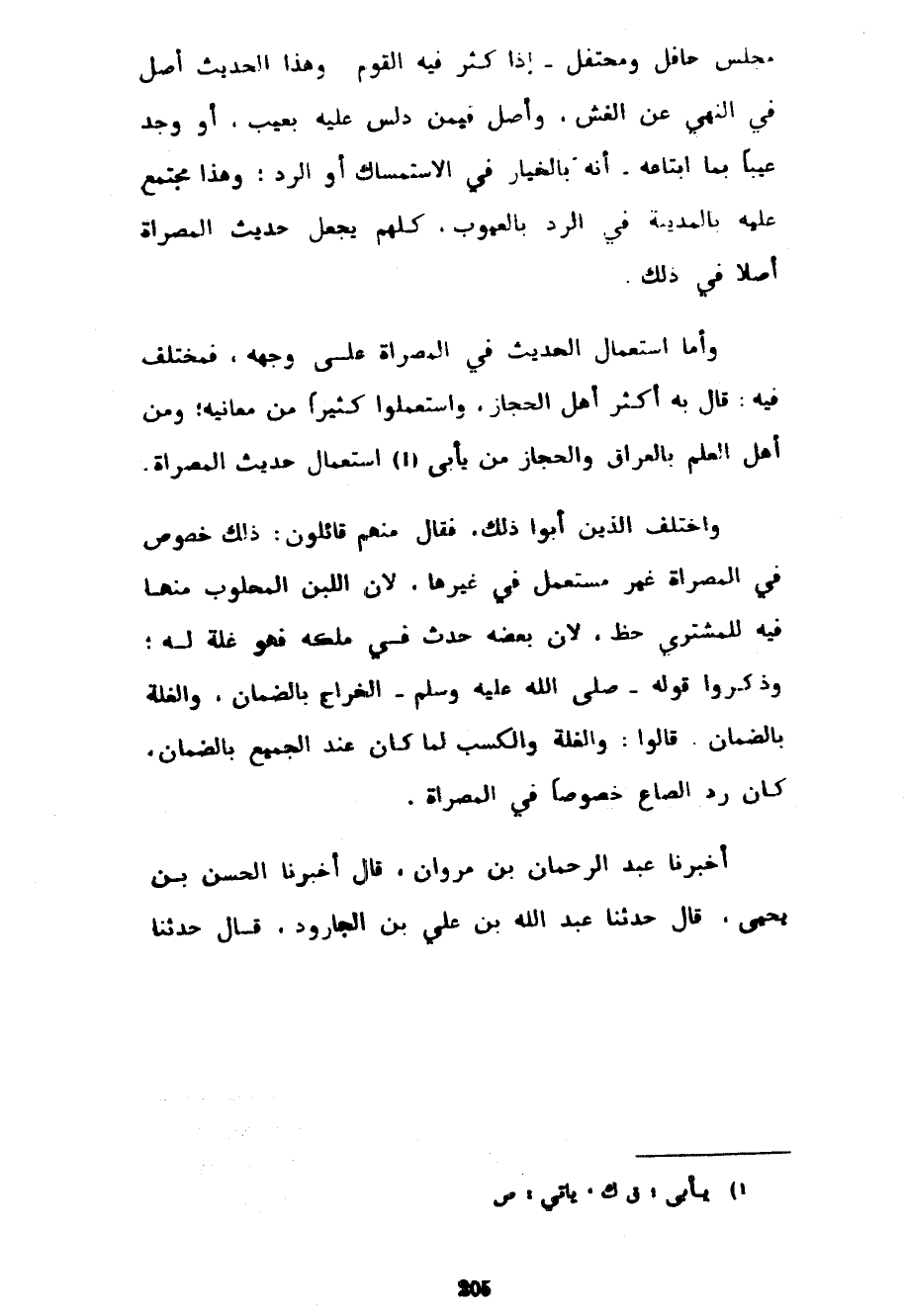 مَجْلِسٌ حَافِلٌ وَمُحْتَفِلٌ إِذَا كَثُرَ فِيهِ الْقَوْمُ وَهَذَا الْحَدِيثُ أَصْلٌ فِي النَّهْيِ عَنِ الْغِشِّ وَأَصْلٌ فِيمَنْ دُلِّسَ عَلَيْهِ بِعَيْبٍ أَوْ وَجَدَ عَيْبًا بِمَا ابْتَاعَهُ أَنَّهُ بِالْخِيَارِ فِي الِاسْتِمْسَاكِ أَوِ الرَّدِّ وَهَذَا مُجْتَمَعٌ عَلَيْهِ بِالْمَدِينَةِ فِي الرَّدِّ بِالْعُيُوبِ كُلُّهُمْ يَجْعَلُ حَدِيثَ الْمُصَرَّاةِ أَصْلًا فِي ذَلِكَ وَأَمَّا اسْتِعْمَالُ الْحَدِيثِ فِي الْمُصَرَّاةِ عَلَى وَجْهِهِ فَمُخْتَلَفٌ فِيهِ قَالَ بِهِ أَكْثَرُ أَهْلِ الْحِجَازِ وَاسْتَعْمَلُوا كَثِيرًا مِنْ مَعَانِيهِ وَمِنْ أَهْلِ الْعِلْمِ بِالْعِرَاقِ وَالْحِجَازِ مَنْ يَأْبَى اسْتِعْمَالَ حَدِيثِ الْمُصَرَّاةِ وَاخْتَلَفَ الَّذِينَ أَبَوْا ذَلِكَ فَقَالَ مِنْهُمْ قَائِلُونَ ذَلِكَ خُصُوصٌ فِي الْمُصَرَّاةِ غَيْرُ مُسْتَعْمَلٍ فِي غَيْرِهَا لِأَنَّ اللَّبَنَ الْمَحْلُوبَ مِنْهَا فِيهِ لِلْمُشْتَرِي حَظٌّ لِأَنَّ بَعْضَهُ حَدَثَ فِي مِلْكِهِ فَهُوَ غَلَّةٌ لَهُ وَذَكَرُوا قَوْلَهُ صَلَّى اللَّهُ عَلَيْهِ وَسَلَّمَ الْخَرَاجُ بِالضَّمَانِ وَالْغَلَّةُ بِالضَّمَانِ قَالُوا وَالْغَلَّةُ وَالْكَسْبُ لَمَّا كَانَ عِنْدَ الْجَمِيعِ بِالضَّمَانِ كَانَ رَدُّ الصَّاعِ خُصُوصًا فِي الْمُصَرَّاةِ أخبرنا عبد الرحمان بْنُ مَرْوَانَ قَالَ أَخْبَرَنَا الْحَسَنُ بْنُ يَحْيَى قَالَ حَدَّثَنَا عَبْدُ اللَّهِ بْنُ عَلِيِّ بْنِ الْجَارُودِ قَالَ حَدَّثَنَا