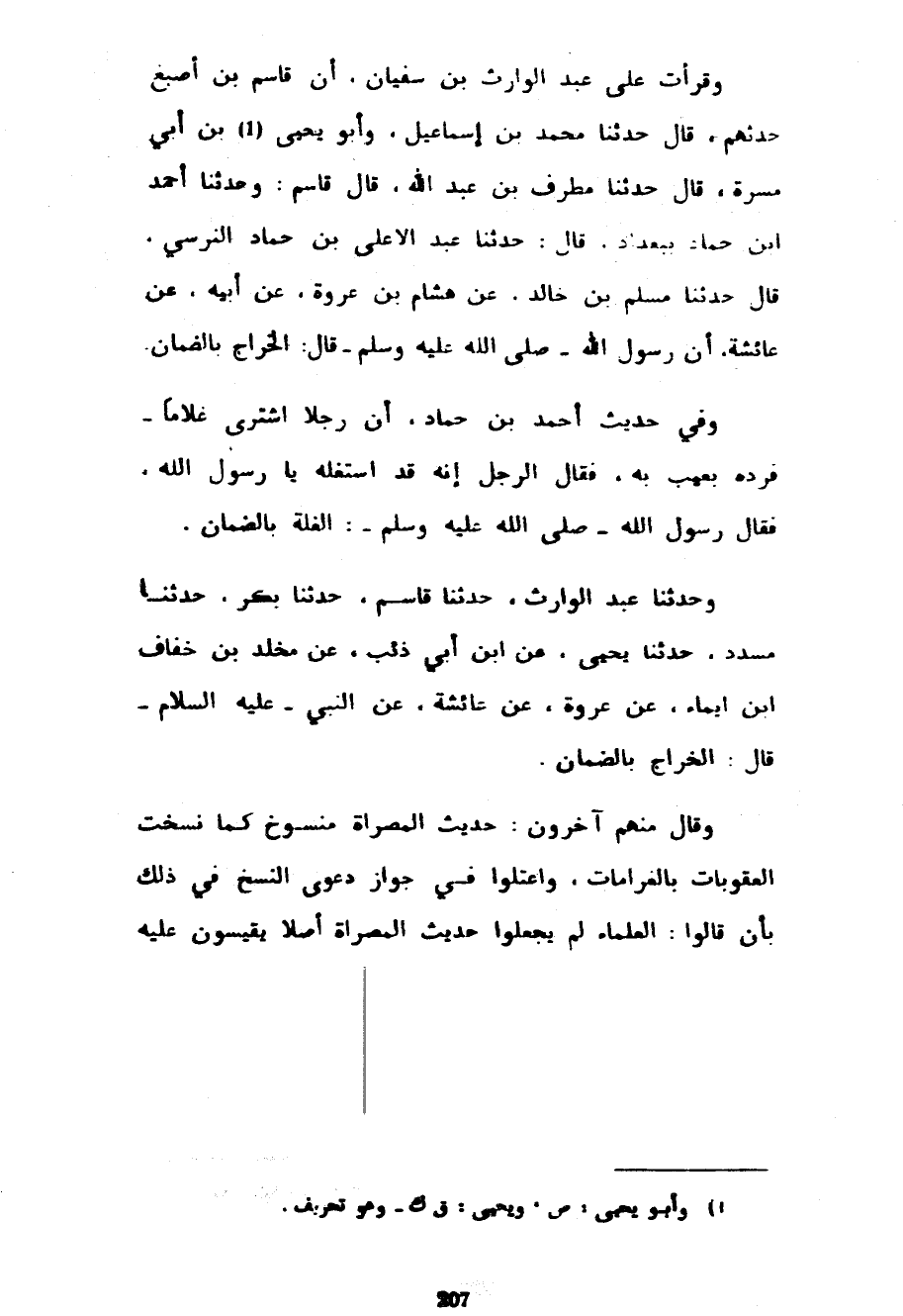 وَقَرَأْتُ عَلَى عَبْدِ الْوَارِثِ بْنِ سُفْيَانَ أَنَّ قَاسِمَ بْنَ أَصْبَغَ حَدَّثَهُمْ قَالَ حَدَّثَنَا مُحَمَّدُ بْنُ إِسْمَاعِيلَ وَأَبُو يَحْيَى بْنُ أَبِي مَسَرَّةَ قَالَ حَدَّثَنَا مُطَرِّفٌ بْنُ عَبْدِ اللَّهِ قَالَ قَاسِمٌ وَحَدَّثَنَا أَحْمَدُ بْنُ حَمَّادٍ بِبَغْدَادَ قَالَ حَدَّثَنَا عَبْدُ الْأَعْلَى بْنُ حَمَّادٍ النَّرْسِيُّ قَالَ حَدَّثَنَا مُسْلِمُ بْنُ خَالِدٍ عَنْ هِشَامِ بْنِ عُرْوَةَ عَنْ أَبِيهِ عَنْ عَائِشَةَ أَنَّ رَسُولَ اللَّهِ صَلَّى اللَّهُ عَلَيْهِ وَسَلَّمَ قَالَ الْخَرَاجُ بِالضَّمَانِ وَفِي حَدِيثِ أَحْمَدَ بْنِ حَمَّادٍ أَنَّ رَجُلًا اشْتَرَى غُلَامًا فَرَدَّهُ بِعَيْبٍ بِهِ فَقَالَ الرَّجُلُ إِنَّهُ قَدِ اسْتَغَلَّهُ يَا رَسُولَ اللَّهِ فَقَالَ رَسُولُ اللَّهِ صَلَّى اللَّهُ عَلَيْهِ وَسَلَّمَ الْغَلَّةُ بِالضَّمَانِ وَحَدَّثَنَا عَبْدُ الْوَارِثِ حَدَّثَنَا قَاسِمٌ حَدَّثَنَا بَكْرٌ حَدَّثَنَا مُسَدَّدٌ حَدَّثَنَا يَحْيَى عَنِ ابْنِ أَبِي ذِئْبٍ عَنْ مَخْلَدِ بْنِ خُفَافِ بْنِ إِيمَاءَ عَنْ عُرْوَةَ عَنْ عَائِشَةَ عَنِ النبي عليه السلام الْخَرَاجُ بِالضَّمَانِ وَقَالَ مِنْهُمْ آخَرُونَ حَدِيثُ الْمُصَرَّاةِ مَنْسُوخٌ كَمَا نُسِخَتِ الْعُقُوبَاتُ بِالْغَرَامَاتِ وَاعْتَلُّوا فِي جَوَازِ دَعْوَى النَّسْخِ فِي ذَلِكَ بِأَنْ قَالُوا الْعُلَمَاءُ لَمْ يَجْعَلُوا حَدِيثَ الْمُصَرَّاةِ أَصْلًا يَقِيسُونَ عليه