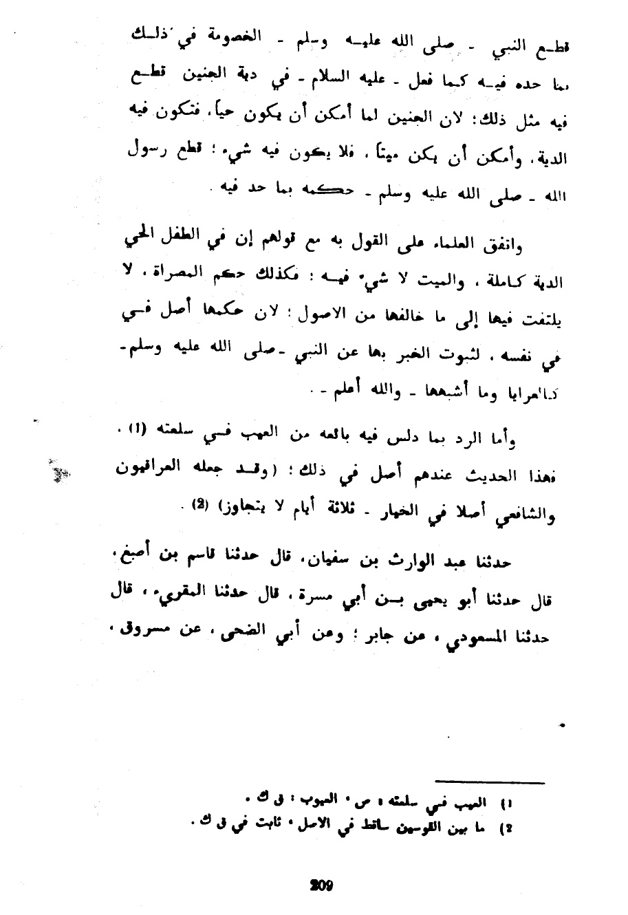 قَطَعَ النَّبِيُّ صَلَّى اللَّهُ عَلَيْهِ وَسَلَّمَ الْخُصُومَةَ فِي ذَلِكَ بِمَا حَدَّهُ فِيهِ كَمَا فَعَلَ عَلَيْهِ السَّلَامُ فِي دِيَةِ الْجَنِينِ قَطَعَ فِيهِ مِثْلَ ذَلِكَ لِأَنَّ الْجَنِينَ لَمَّا أَمْكَنَ أَنْ يَكُونَ حَيًّا فَتَكُونُ فِيهِ الدِّيَةُ وَأَمْكَنَ أَنْ يكن مَيِّتًا فَلَا يَكُونُ فِيهِ شَيْءٌ قَطَعَ رَسُولُ اللَّهِ صَلَّى اللَّهُ عَلَيْهِ وَسَلَّمَ حُكْمَهُ بِمَا حَدَّ فِيهِ وَاتَّفَقَ الْعُلَمَاءُ عَلَى الْقَوْلِ بِهِ مَعَ قَوْلِهِمْ أَنَّ فِي الطِّفْلِ الْحَيِّ الدِّيَةَ كَامِلَةً وَالْمَيِّتُ لَا شَيْءَ فِيهِ فَكَذَلِكَ حُكْمُ الْمُصَرَّاةِ لَا يُلْتَفَتُ فِيهَا إِلَى مَا خَالَفَهَا مِنَ الْأُصُولِ لِأَنَّ حُكْمَهَا أَصْلٌ فِي نَفْسِهِ لِثُبُوتِ الْخَبَرِ بِهَا عَنِ النَّبِيِّ صَلَّى اللَّهُ عَلَيْهِ وَسَلَّمَ كَالْعَرَايَا وَمَا أَشْبَهَهَا وَاللَّهُ أَعْلَمُ وَأَمَّا الرَّدُّ بِمَا دَلَّسَ فِيهِ بَائِعُهُ مِنَ الْعَيْبِ فِي سِلْعَتِهِ فَهَذَا الْحَدِيثُ عِنْدَهُمْ أَصْلٌ فِي ذَلِكَ (وَقَدْ جَعَلَهُ الْعِرَاقِيُّونَ وَالشَّافِعِيُّ أَصْلًا فِي الْخِيَارِ ثَلَاثَةَ أَيَّامٍ لَا يُتَجَاوَزُ) حَدَّثَنَا عَبْدُ الْوَارِثِ بْنُ سُفْيَانَ قَالَ حَدَّثَنَا قَاسِمُ بْنُ أَصْبَغَ قَالَ حَدَّثَنَا أَبُو يَحْيَى بْنُ أَبِي مَسَرَّةَ قَالَ حَدَّثَنَا الْمُقْرِئُ قَالَ حَدَّثَنَا الْمَسْعُودِيُّ عَنْ جَابِرٍ وَعَنْ أَبِي الضُّحَى عَنْ مسروق