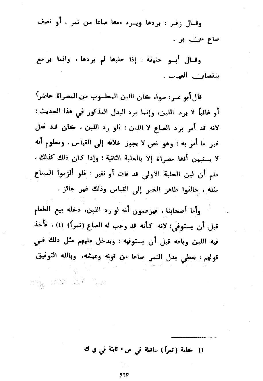 وَقَالَ رُوِيَ عَنْ زَيْدِ بْنِ الْهُذَيْلِ فِي نَوَادِرَ تُنْسَبُ إِلَيْهِ فِيمَنِ اشْتَرَى شَاةً مُصَرَّاةً قَالَ هُوَ بِالْخِيَارِ ثَلَاثًا لِيَحْلِبَهَا فَإِنْ شَاءَ رَدَّهَا وَرَدَّ مَعَهَا صَاعًا مِنْ تَمْرٍ أَوْ نِصْفَ صَاعٍ مِنْ بُرٍّ قَالَ وَإِنِ اشْتَرَاهَا وَلَيْسَتْ بِمُحَفَّلَةٍ فَاحْتَلَبَهَا فَلَيْسَ لَهُ أَنْ يَرُدَّهَا وَلَكِنَّهُ يَرْجِعُ بِنُقْصَانِ الْعَيْبِ لِأَنَّا اتَّبَعْنَا الْأَثَرَ فِي الْمُحَفَّلَةِ فَإِنْ حَدَثَ فِي الْمُحَفَّلَةِ عَيْبٌ فَإِنَّهُ يَرُدُّ النُّقْصَانَ إِلَّا أَنْ يَرْضَى الْبَائِعُ أَنْ يَأْخُذَهَا كَمَا هِيَ قَالَ أَبُو عُمَرَ تَلْخِيصُ اخْتِلَافِ الْفُقَهَاءِ فِي هَذَا الْبَابِ أَنْ نَقُولَ قَالَ مَالِكٌ مَنِ اشْتَرَى مُصَرَّاةً فَاحْتَلَبَهَا ثَلَاثًا فَإِنْ رَضِيَهَا أَمْسَكَهَا وَإِنْ سَخِطَهَا لِاخْتِلَافِ لَبَنِهَا رَدَّهَا وَرَدَّ مَعَهَا صَاعًا مِنْ قُوتِ ذَلِكَ الْبَلَدِ تَمْرًا كَانَ أَوْ بُرًّا أَوْ غَيْرَ ذَلِكَ وَبِهِ قَالَ الطَّبَرِيُّ وَقَالَ عِيسَى بْنُ دِينَارٍ فِي مَذْهَبِ مَالِكٍ لَوْ عَلِمَ مُشْتَرِي الْمُصَرَّاةِ أَنَّهَا مُصَرَّاةٌ بِإِقْرَارِ الْبَائِعِ فَرَدَّهَا قَبْلَ أَنْ يَحْلِبَهَا لَمْ يَكُنْ عَلَيْهِ غُرْمٌ لِأَنَّهُ لَمْ يَحْلِبِ اللَّبَنَ الَّذِي مِنْ أَجْلِهِ يُلْزَمُ غُرْمَ الصَّاعِ قَالَ أَبُو عُمَرَ هَذَا مَا لَا خِلَافَ فِيهِ قَالَ عِيسَى وَلَوْ حَلَبَهَا مَرَّةً ثُمَّ حَلَبَهَا ثَانِيَةً فَنَقَصَ لَبَنُهَا ردها ورد معها صاعا