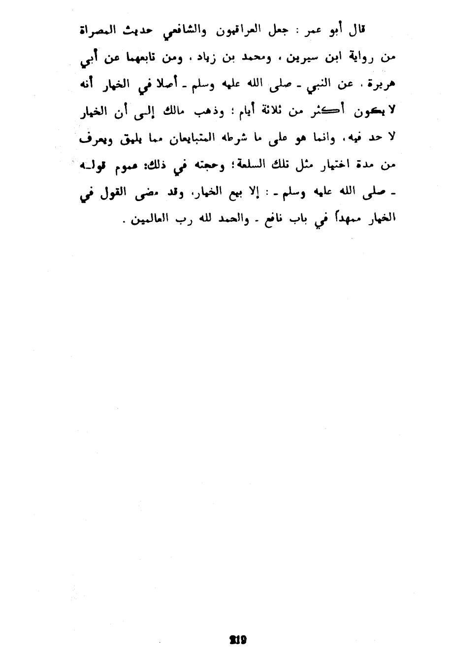 قَالَ أَبُو عُمَرَ جَعَلَ الْعِرَاقِيُّونَ وَالشَّافِعِيُّ حَدِيثَ الْمُصَرَّاةِ مِنْ رِوَايَةِ ابْنِ سِيرِينَ وَمُحَمَّدِ بْنِ زِيَادٍ وَمَنْ تَابَعَهُمَا عَنْ أَبِي هُرَيْرَةَ عَنِ النَّبِيِّ صَلَّى اللَّهُ عَلَيْهِ وَسَلَّمَ أَصْلًا فِي الْخِيَارِ أَنَّهُ لَا يَكُونُ أَكْثَرَ مِنْ ثَلَاثَةِ أَيَّامٍ وَذَهَبَ مَالِكٌ إِلَى أَنَّ الْخِيَارَ لَا حَدَّ فِيهِ وَإِنَّمَا هُوَ عَلَى مَا شَرَطَهُ الْمُتَبَايِعَانِ مِمَّا يَلِيقُ وَيُعْرَفُ مِنْ مُدَّةِ اخْتِيَارِ مِثْلِ تِلْكَ السِّلْعَةِ وَحُجَّتُهُ فِي ذَلِكَ عُمُومُ قَوْلِهِ صَلَّى اللَّهُ عَلَيْهِ وَسَلَّمَ إِلَّا بَيْعَ الْخِيَارِ وَقَدْ مَضَى الْقَوْلُ فِي الْخِيَارِ مُمَهَّدًا فِي بَابِ نَافِعٍ وَالْحَمْدُ لِلَّهِ رَبِّ الْعَالَمِينَ