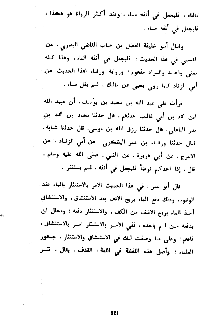 مَالِكٍ فَلْيَجْعَلْ فِي أَنْفِهِ مَاءً وَعِنْدَ أَكْثَرِ الرُّوَاةِ هُوَ هَكَذَا فَلْيَجْعَلْ فِي أَنْفِهِ مَاءً وَقَالَ أَبُو خَلِيفَةَ الْفَضْلُ بْنُ حُبَابٍ الْقَاضِي الْبَصْرِيُّ عَنِ الْقَعْنَبِيِّ فِي هَذَا الْحَدِيثِ فَلْيَجْعَلْ فِي أَنْفِهِ مَاءً وَهَذَا كُلُّهُ مَعْنًى وَاحِدٌ وَالْمُرَادُ مَفْهُومٌ وَرِوَايَةُ وَرْقَاءَ لِهَذَا الْحَدِيثِ عَنْ أَبِي الزِّنَادِ كَمَا رَوَى يَحْيَى عَنْ مَالِكٍ لَمْ يَقُلْ مَاءً قَرَأْتُ عَلَى عَبْدِ اللَّهِ بْنِ مُحَمَّدِ بْنِ يُوسُفَ أَنَّ عُبَيْدَ اللَّهِ بن محمد بن بي غَالِبٍ حَدَّثَهُمْ قَالَ حَدَّثَنَا مُحَمَّدُ بْنُ مُحَمَّدِ بْنِ بَدْرِ الْبَاهِلِيُّ قَالَ حَدَّثَنَا رِزْقُ اللَّهِ بْنُ مُوسَى قَالَ حَدَّثَنَا شَبَابَةُ قَالَ حَدَّثَنَا وَرْقَاءُ بْنُ عُمَرَ الْيَشْكُرِيُّ عَنْ أَبِي الزِّنَادِ عَنِ الْأَعْرَجِ عَنْ أَبِي هُرَيْرَةَ عَنِ النَّبِيِّ صَلَّى اللَّهُ عَلَيْهِ وَسَلَّمَ قَالَ إِذَا أَحَدُكُمْ تَوَضَّأَ فَلْيَجْعَلْ فِي أَنْفِهِ ثُمَّ يَسْتَنْثِرُ قَالَ أَبُو عُمَرَ فِي هَذَا الْحَدِيثِ الْأَمْرُ بِالِاسْتِنْثَارِ بِالْمَاءِ عِنْدَ الْوُضُوءِ وَذَلِكَ دَفْعُ الْمَاءِ بِرِيحِ الْأَنْفِ بَعْدَ الِاسْتِنْشَاقِ وَالِاسْتِنْشَاقُ أَخْذُ الْمَاءِ بِرِيحِ الْأَنْفِ مِنَ الْكَفِّ وَالِاسْتِنْثَارُ دَفْعُهُ وَمُحَالٌ أَنْ يَدْفَعَهُ مَنْ لَمْ يَأْخُذْهُ فَفِي الْأَمْرِ بِالِاسْتِنْثَارِ أَمْرٌ بِالِاسْتِنْشَاقِ فَافْهَمْ وَعَلَى مَا وَصَفْتُ لَكَ فِي الِاسْتِنْشَاقِ وَالِاسْتِنْثَارِ جُمْهُورُ الْعُلَمَاءِ وَأَصْلُ هَذِهِ اللَّفْظَةِ فِي اللُّغَةِ الْقَذْفُ يُقَالُ نَثَرَ