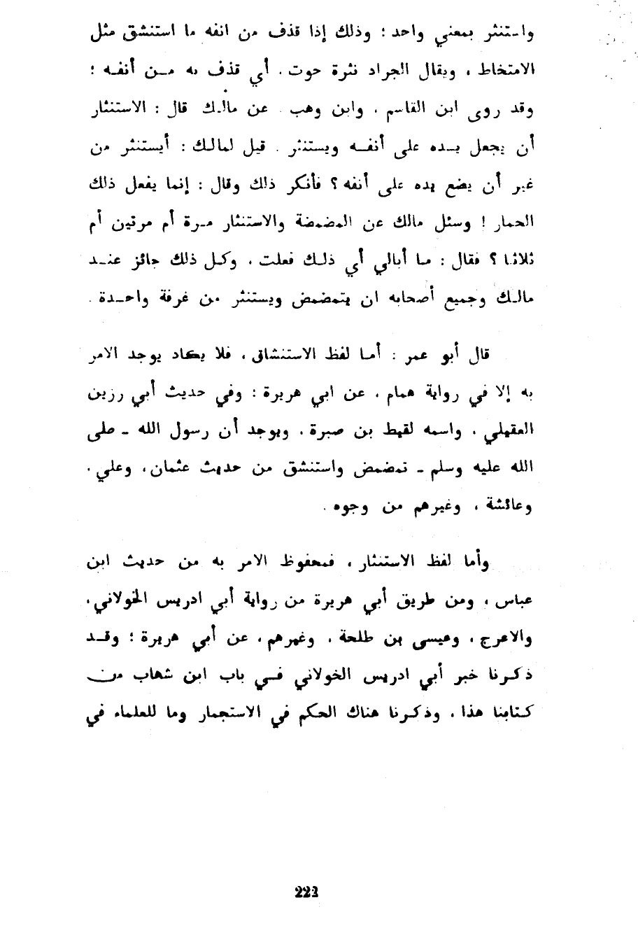 وَاسْتَنْثَرَ بِمَعْنًى وَاحِدٍ وَذَلِكَ إِذَا قَذَفَ مِنْ أَنْفِهِ مَا اسْتَنْشَقَ مِثْلَ الِامْتِخَاطِ وَيُقَالُ الْجَرَادُ نَثْرَةُ حُوتٍ أَيْ قَذَفَ بِهِ مِنْ أَنْفِهِ وَقَدْ رَوَى ابْنُ الْقَاسِمِ وَابْنُ وَهْبٍ عَنْ مَالِكٍ قَالَ الِاسْتِنْثَارَ أَنْ يَجْعَلَ يَدَهُ عَلَى أَنْفِهِ وَيَسْتَنْثِرَ قِيلَ لِمَالِكٍ أَيَسْتَنْثِرُ مِنْ غَيْرِ أَنْ يَضَعَ يَدَهُ عَلَى أَنْفِهِ فَأَنْكَرَ ذَلِكَ وَقَالَ إِنَّمَا يَفْعَلُ ذَلِكَ الْحِمَارُ وَسُئِلَ مَالِكٌ عَنِ الْمَضْمَضَةِ وَالِاسْتِنْثَارِ مَرَّةً أَمْ مَرَّتَيْنِ أَمْ ثَلَاثًا فَقَالَ مَا أُبَالِي أَيَّ ذَلِكَ فَعَلْتُ وَكُلُّ ذَلِكَ جَائِزٌ عِنْدَ مَالِكٍ وَجَمِيعِ أَصْحَابِهِ أَنْ يَتَمَضْمَضَ وَيَسْتَنْثِرَ مِنْ غَرْفَةٍ وَاحِدَةٍ قَالَ أَبُو عُمَرَ أَمَّا لَفْظُ الِاسْتِنْشَاقِ فَلَا يَكَادُ يُوجَدُ الْأَمْرُ بِهِ إِلَّا فِي رِوَايَةِ هَمَّامٍ عَنْ أَبِي هُرَيْرَةَ وَفِي حَدِيثِ أَبِي رَزِينٍ العقيلي واسمه ليقط بْنُ صَبِرَةَ وَيُوجَدُ أَنَّ رَسُولَ اللَّهِ صَلَّى اللَّهُ عَلَيْهِ وَسَلَّمَ تَمَضْمَضَ وَاسْتَنْشَقَ مِنْ حَدِيثِ عُثْمَانَ وَعَلِيٍّ وَعَائِشَةَ وَغَيْرِهِمْ مِنْ وُجُوهٍ وَأَمَّا لَفْظُ الِاسْتِنْثَارِ فَمَحْفُوظٌ الْأَمْرُ بِهِ مِنْ حَدِيثِ ابْنِ عَبَّاسٍ وَمِنْ طَرِيقِ أَبِي هُرَيْرَةَ مِنْ رِوَايَةِ أَبِي إِدْرِيسَ الْخَوْلَانِيِّ وَالْأَعْرَجِ وَعِيسَى بْنِ طَلْحَةَ وَغَيْرِهِمْ عَنْ أَبِي هُرَيْرَةَ وَقَدْ ذَكَرْنَا خَبَرَ أَبِي إِدْرِيسَ الْخَوْلَانِيِّ فِي بَابِ ابْنِ شِهَابٍ مِنْ كِتَابِنَا هَذَا وَذَكَرْنَا هُنَاكَ الْحُكْمَ فِي الِاسْتِجْمَارِ وَمَا لِلْعُلَمَاءِ فِي