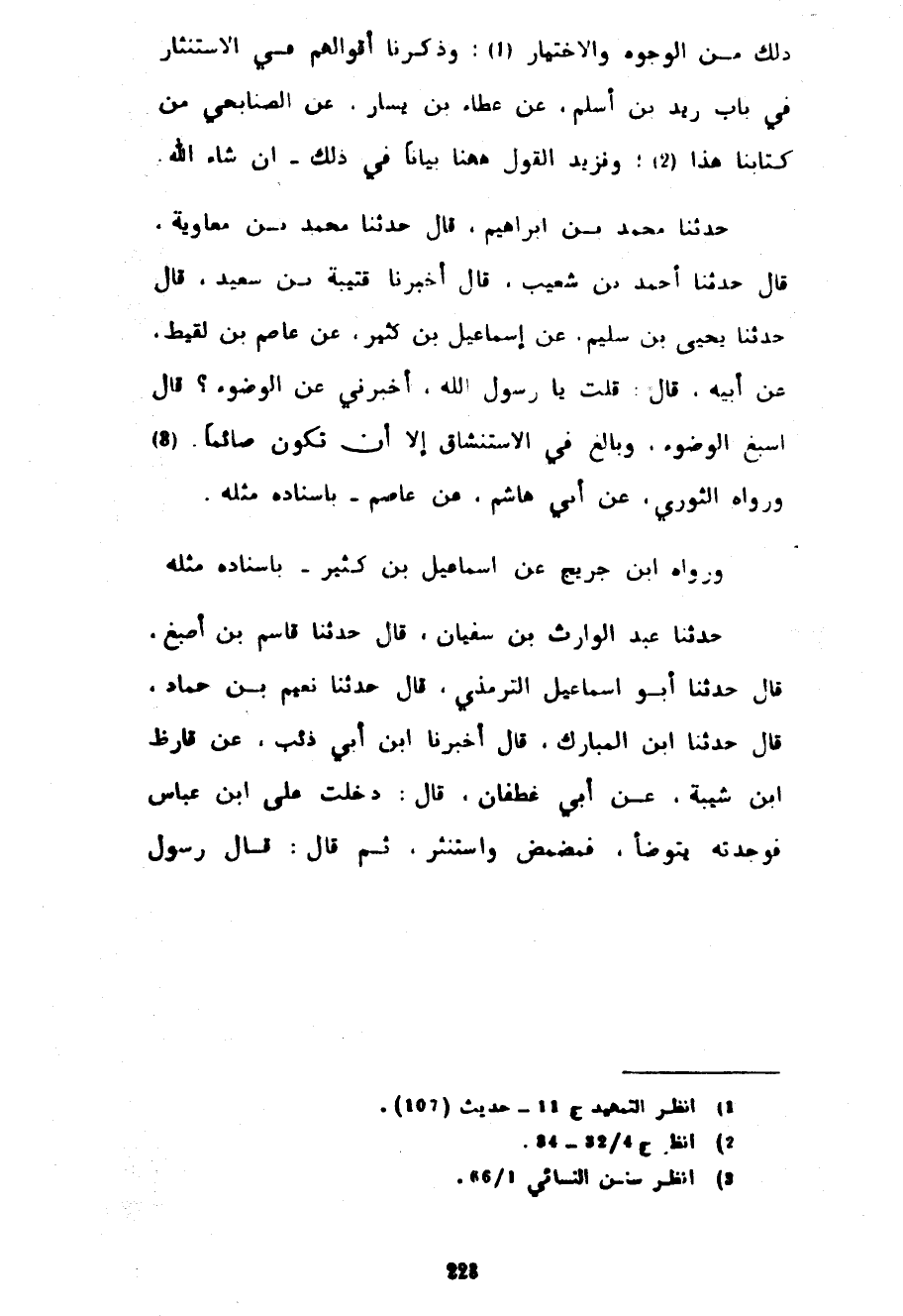ذَلِكَ مِنَ الْوُجُوهِ وَالِاخْتِيَارِ وَذَكَرْنَا أَقْوَالَهُمْ فِي الِاسْتِنْثَارِ فِي بَابِ زَيْدِ بْنِ أَسْلَمَ عَنْ عَطَاءِ بْنِ يَسَارٍ عَنِ الصَّنَابِحِيِّ مِنْ كِتَابِنَا هَذَا ونزيد القول ههنا بَيَانًا فِي ذَلِكَ إِنْ شَاءَ اللَّهُ حَدَّثَنَا مُحَمَّدُ بْنُ إِبْرَاهِيمَ قَالَ حَدَّثَنَا مُحَمَّدُ بْنُ مُعَاوِيَةَ قَالَ حَدَّثَنَا أَحْمَدُ بْنُ شُعَيْبٍ قَالَ أَخْبَرَنَا قُتَيْبَةُ بْنُ سَعِيدٍ قَالَ حَدَّثَنَا يَحْيَى بْنُ سُلَيْمٍ عَنْ إِسْمَاعِيلَ بْنِ كَثِيرٍ عَنْ عَاصِمِ بْنِ لَقِيطٍ عَنْ أَبِيهِ قَالَ قُلْتُ يَا رَسُولَ اللَّهِ أَخْبِرْنِي عَنِ الْوُضُوءِ قَالَ أَسْبِغِ الْوُضُوءَ وَبَالِغْ فِي الِاسْتِنْشَاقِ إِلَّا أَنْ تَكُونَ صَائِمًا وَرَوَاهُ الثَّوْرِيُّ عَنْ أَبِي هَاشِمٍ عَنْ عَاصِمٍ بِإِسْنَادِهِ مِثْلَهُ وَرَوَاهُ ابْنُ جُرَيْجٍ عَنْ إِسْمَاعِيلَ بْنِ كَثِيرٍ بِإِسْنَادِهِ مِثْلَهُ حَدَّثَنَا عَبْدُ الْوَارِثِ بْنُ سُفْيَانَ قَالَ حَدَّثَنَا قَاسِمُ بْنُ أَصْبَغَ قَالَ حَدَّثَنَا أَبُو إِسْمَاعِيلَ التِّرْمِذِيُّ قَالَ حَدَّثَنَا نُعَيْمُ بْنُ حَمَّادٍ قَالَ حَدَّثَنَا ابْنُ الْمُبَارَكِ قَالَ أَخْبَرَنَا ابْنُ أَبِي ذِئْبٍ عَنْ قَارِظِ بْنِ شَيْبَةَ عَنْ أَبِي غَطَفَانَ قَالَ دَخَلْتُ عَلَى ابْنِ عَبَّاسٍ فَوَجَدْتُهُ يَتَوَضَّأُ فَمَضْمَضَ وَاسْتَنْثَرَ ثُمَّ قَالَ قَالَ رَسُولُ