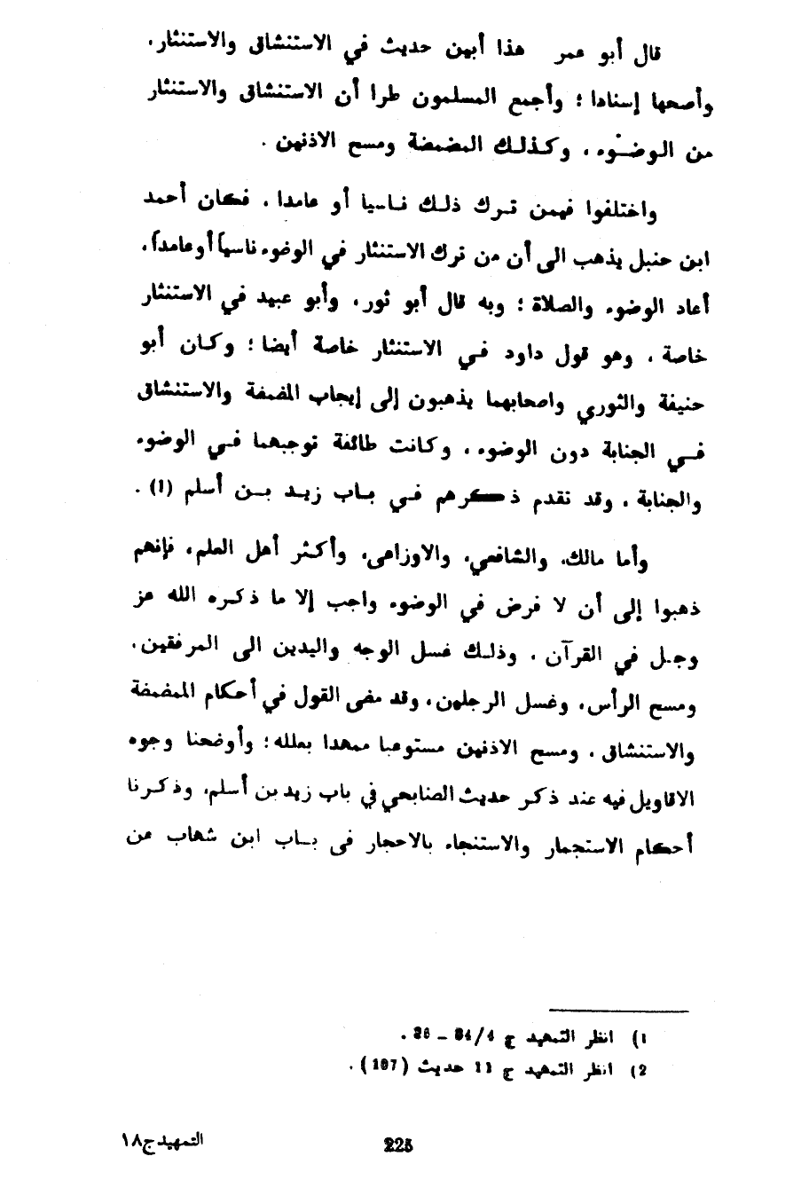 قَالَ أَبُو عُمَرَ هَذَا أَبْيَنُ حَدِيثٍ فِي الِاسْتِنْشَاقِ وَالِاسْتِنْثَارِ وَأَصَحُّهَا إِسْنَادًا وَأَجْمَعَ الْمُسْلِمُونَ طُرًّا أَنَّ الِاسْتِنْشَاقَ وَالِاسْتِنْثَارَ مِنَ الْوُضُوءِ وَكَذَلِكَ الْمَضْمَضَةُ وَمَسْحُ الْأُذُنَيْنِ وَاخْتَلَفُوا فِيمَنْ تَرَكَ ذَلِكَ نَاسِيًا أَوْ عَامِدًا فَكَانَ أَحْمَدُ بْنُ حَنْبَلٍ يَذْهَبُ إِلَى أَنَّ مَنْ تَرَكَ الِاسْتِنْثَارَ فِي الْوُضُوءِ نَاسِيًا أَوْ عَامِدًا أَعَادَ الْوُضُوءَ وَالصَّلَاةَ وَبِهِ قَالَ أَبُو ثَوْرٍ وَأَبُو عُبَيْدٍ فِي الِاسْتِنْثَارِ خَاصَّةً وَهُوَ قَوْلُ دَاوُدَ فِي الِاسْتِنْثَارِ خَاصَّةً أَيْضًا وَكَانَ أَبُو حَنِيفَةَ وَالثَّوْرِيُّ وَأَصْحَابُهُمَا يَذْهَبُونَ إِلَى إِيجَابِ الْمَضْمَضَةِ وَالِاسْتِنْشَاقِ فِي الْجَنَابَةِ دُونَ الْوُضُوءِ وَكَانَتْ طَائِفَةٌ تُوجِبُهُمَا فِي الْوُضُوءِ وَالْجَنَابَةِ وَقَدْ تَقَدَّمَ ذِكْرُهُمْ فِي بَابِ زَيْدِ بْنِ أَسْلَمَ وَأَمَّا مَالِكٌ وَالشَّافِعِيُّ وَالْأَوْزَاعِيُّ وَأَكْثَرُ أَهْلِ الْعِلْمِ فَإِنَّهُمْ ذَهَبُوا إِلَى أَنْ لَا فَرْضَ فِي الْوُضُوءِ وَاجِبٌ إِلَّا مَا ذَكَرَهُ اللَّهُ عَزَّ وَجَلَّ فِي الْقُرْآنِ وَذَلِكَ غَسْلُ الْوَجْهِ وَالْيَدَيْنِ إِلَى الْمِرْفَقَيْنِ وَمَسْحُ الرَّأْسِ وَغَسْلُ الرِّجْلَيْنِ وَقَدْ مَضَى الْقَوْلُ فِي أَحْكَامِ الْمَضْمَضَةِ وَالِاسْتِنْشَاقِ وَمَسْحِ الْأُذُنَيْنِ مُسْتَوْعَبًا مُمَهَّدًا بِعِلَلِهِ وَأَوْضَحْنَا وُجُوهَ الْأَقَاوِيلَ فِيهِ عِنْدَ ذِكْرِ حَدِيثِ الصُّنَابِحِيِّ فِي بَابِ زَيْدِ بْنِ أَسْلَمَ وَذَكَرْنَا أَحْكَامَ الِاسْتِجْمَارِ وَالِاسْتِنْجَاءِ بِالْأَحْجَارِ فِي بَابِ ابْنِ شِهَابٍ عَنْ